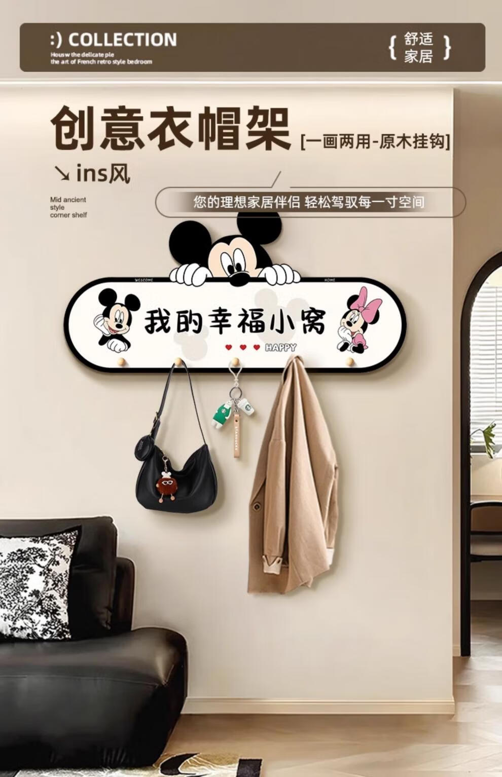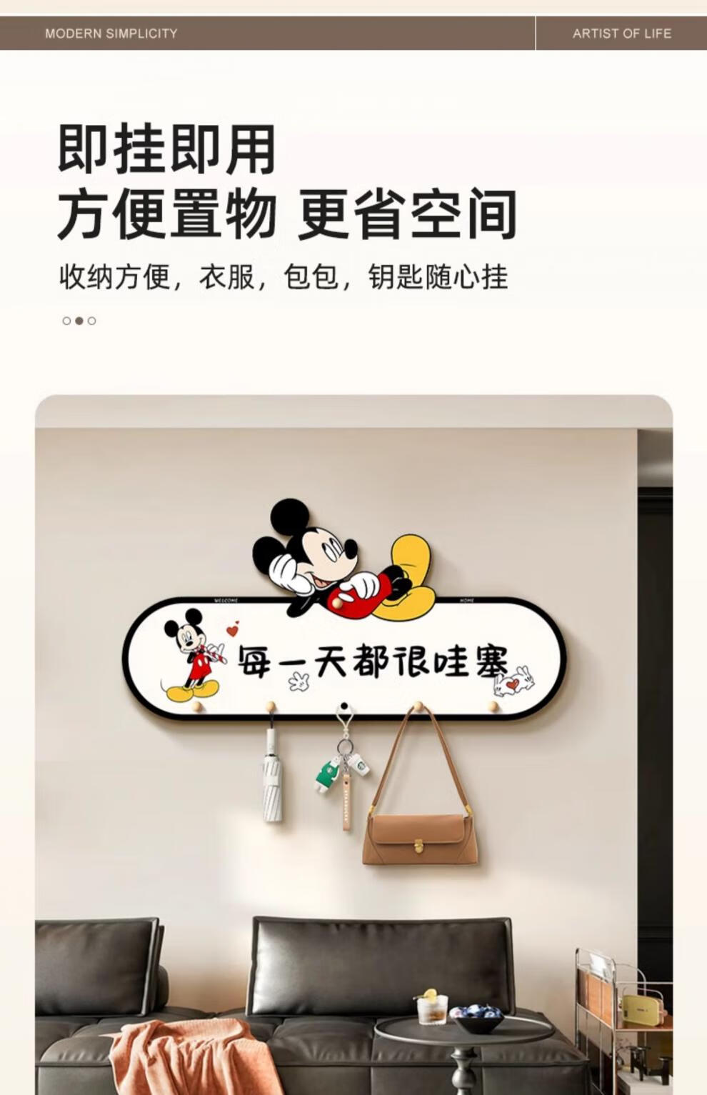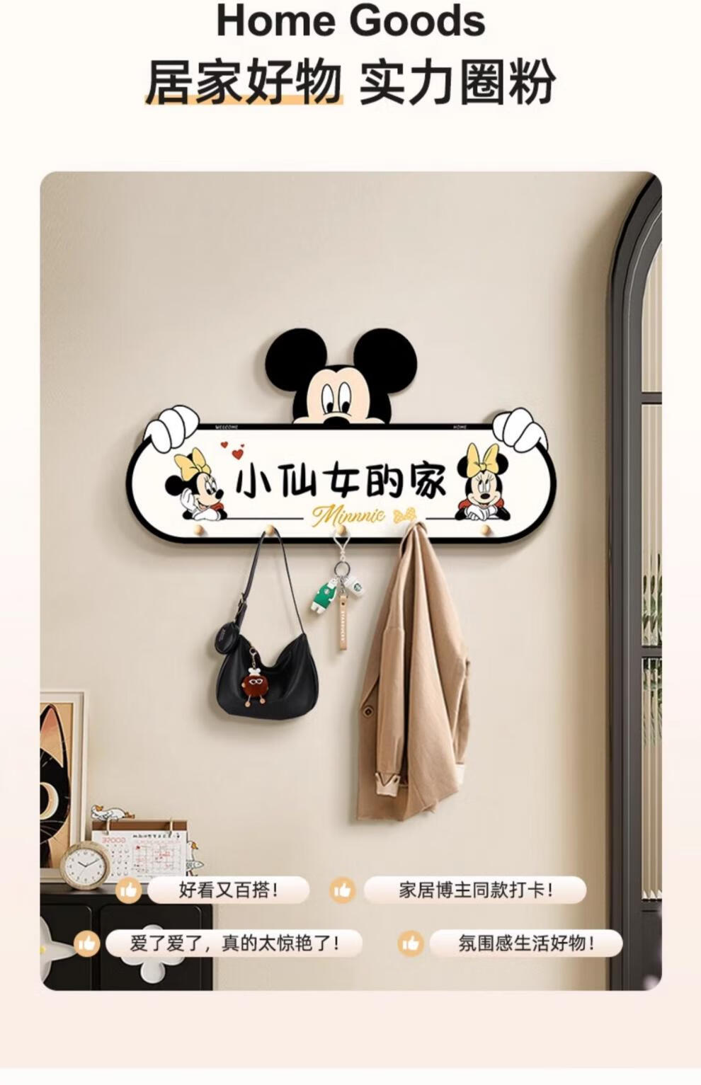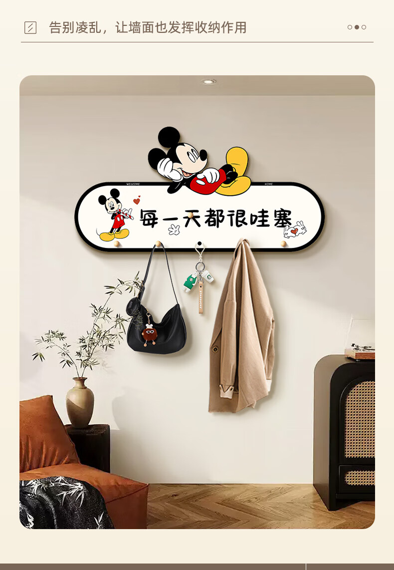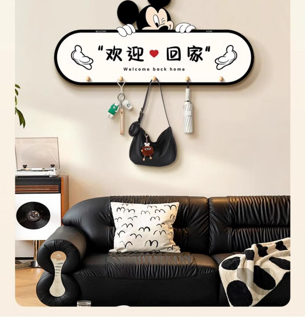 立始卡通米奇挂衣钩置物架衣服包进门玄关入户收纳挂钩门后免打孔钥匙 欢迎回家 创意造型画 60*30 水晶画面