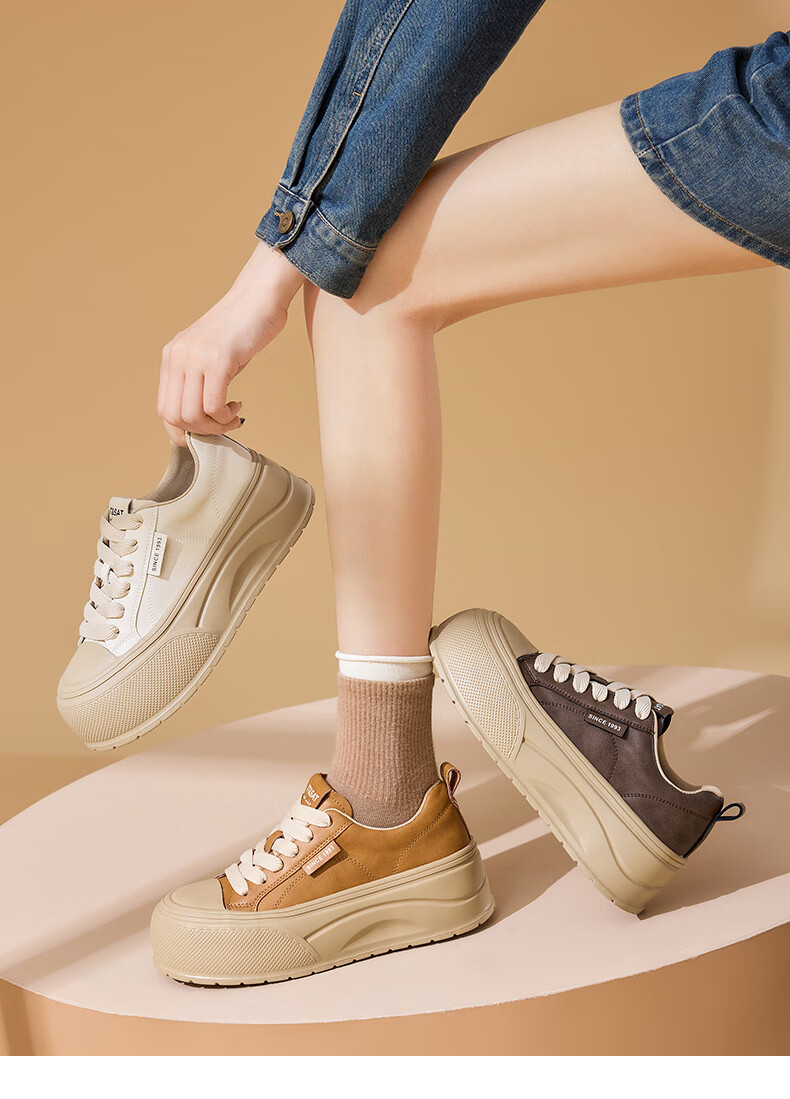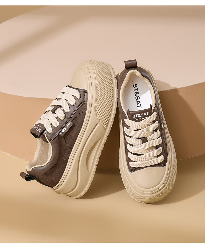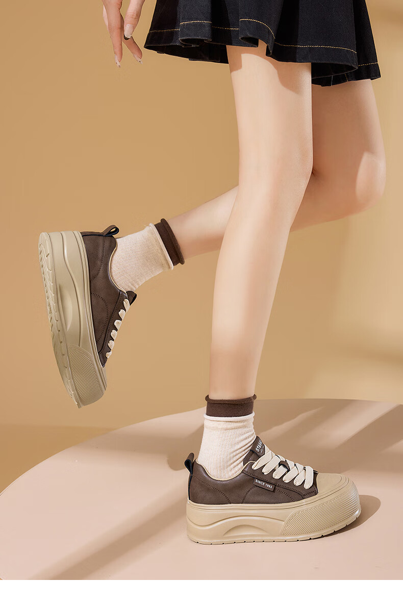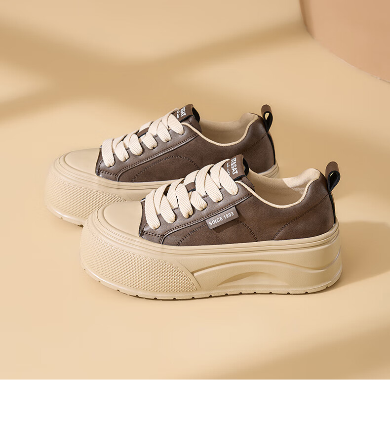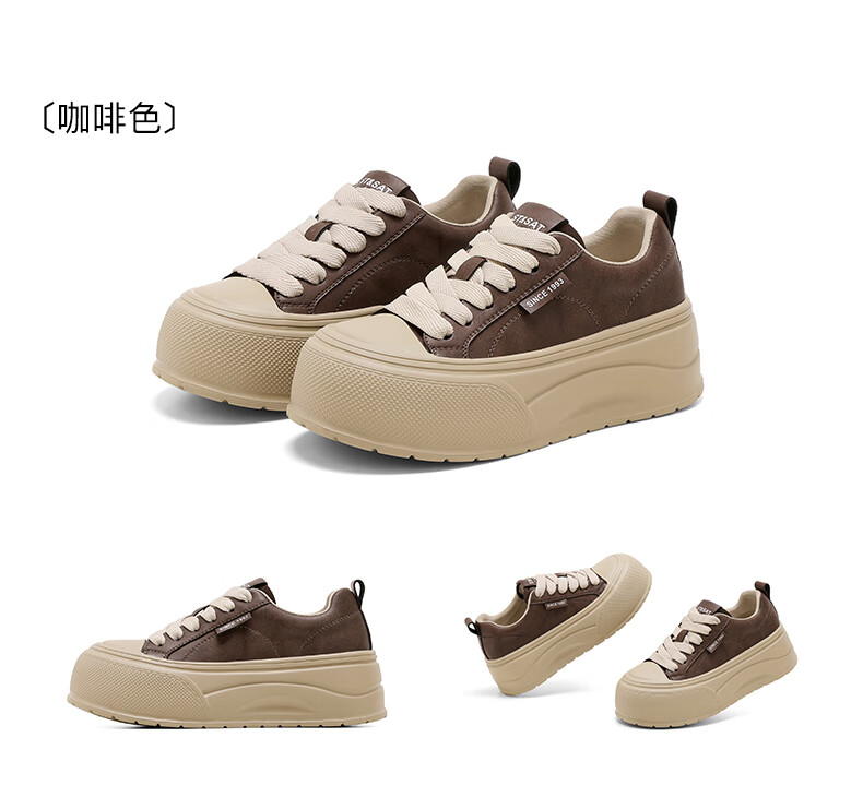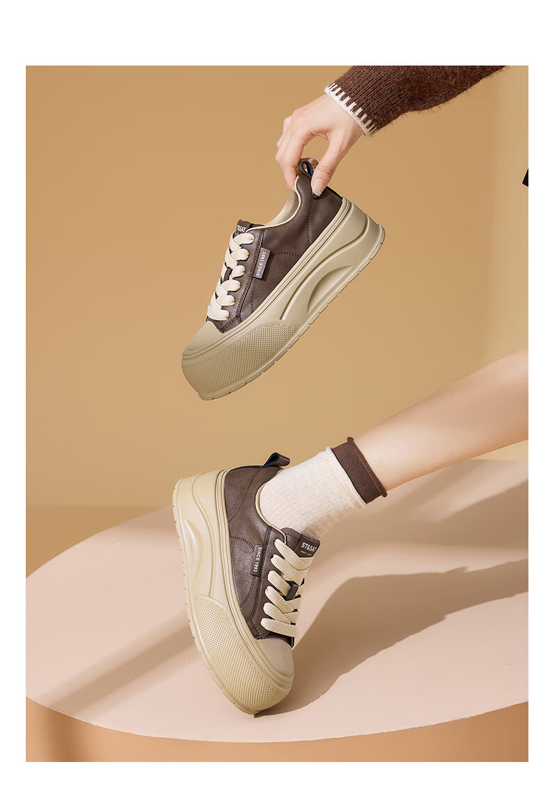 星期六2025秋季新款厚底休闲板鞋女款舒适百搭小白鞋复古增高女鞋 咖啡色 35