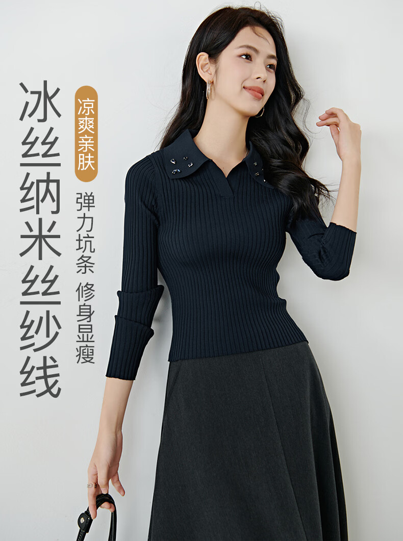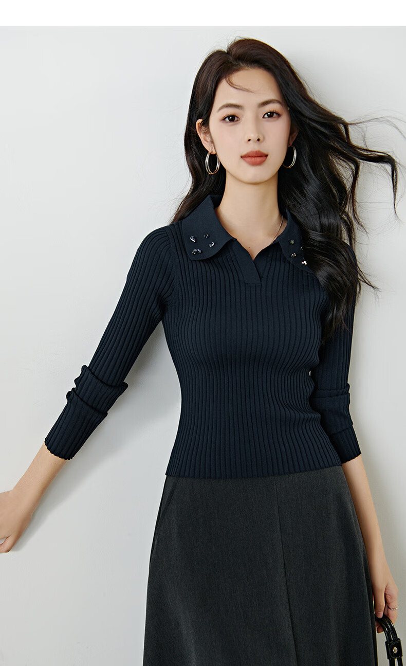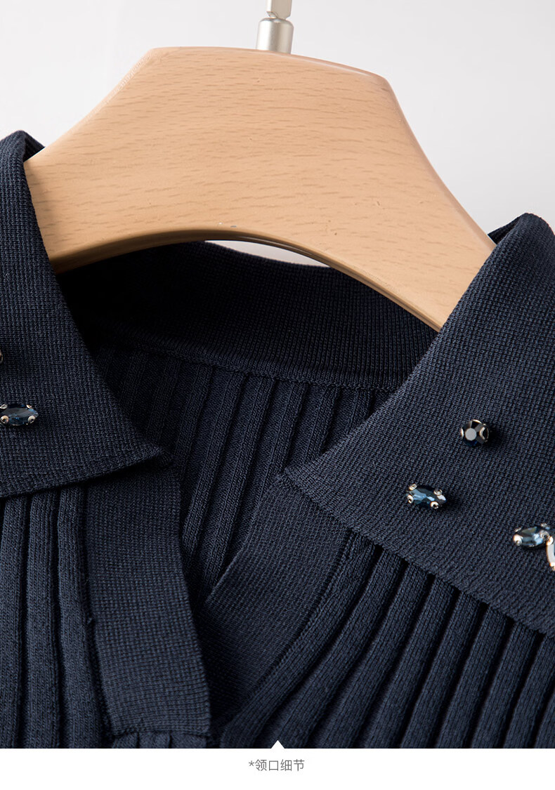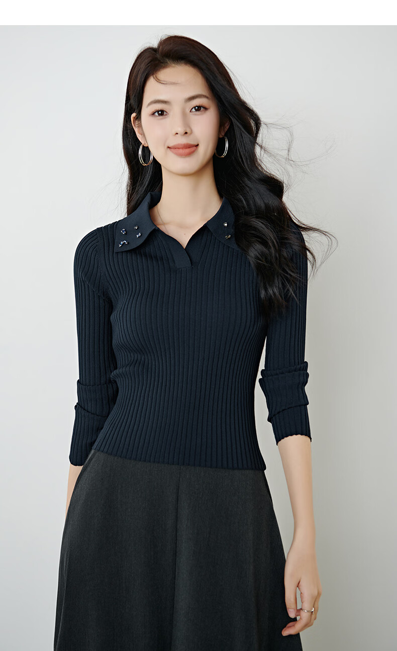 晚白2026年春款经典手工钉珠翻领坑条上衣弹力修身亲肤柔软针织衫女 深蓝色 L