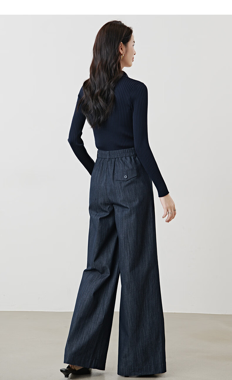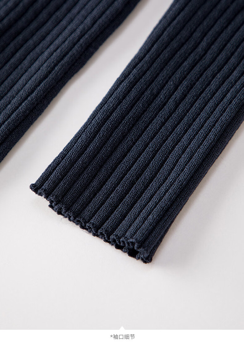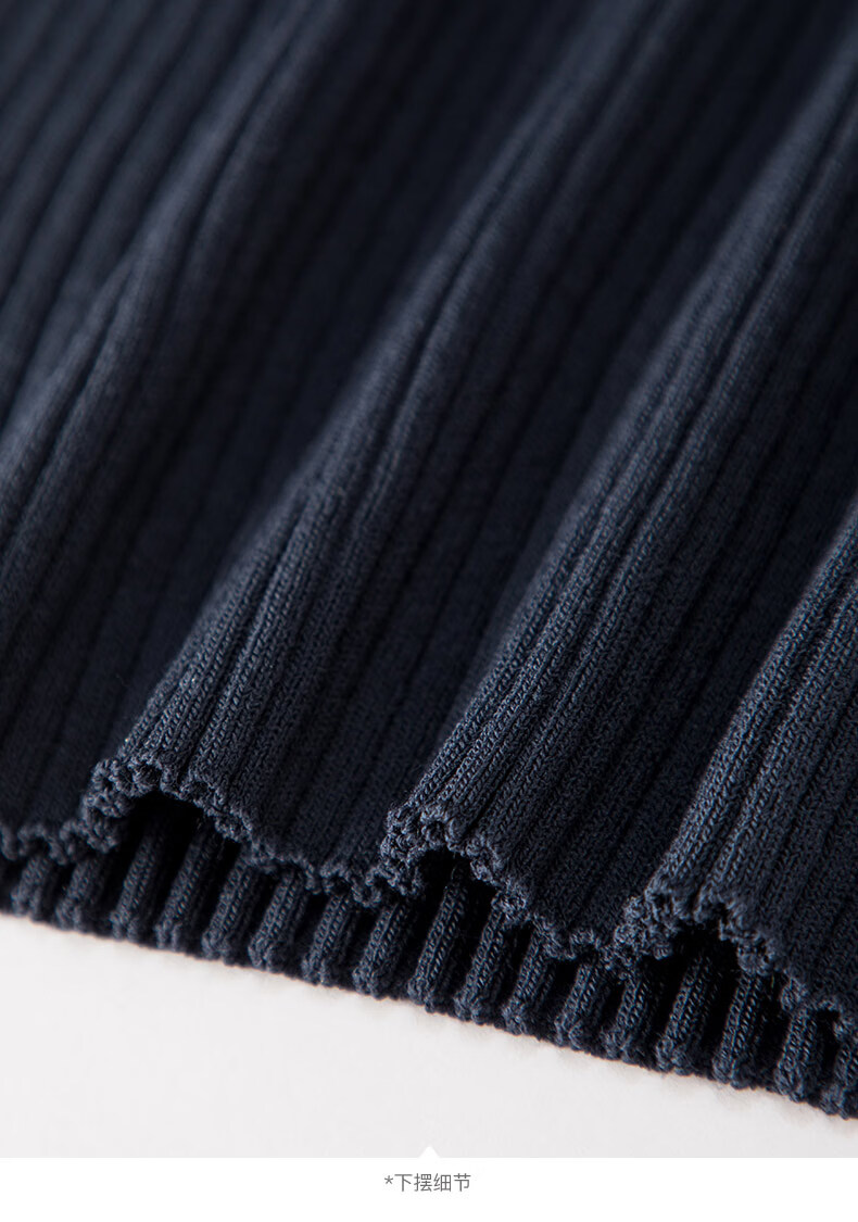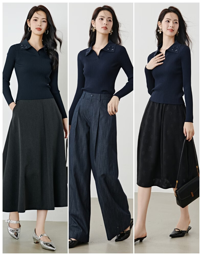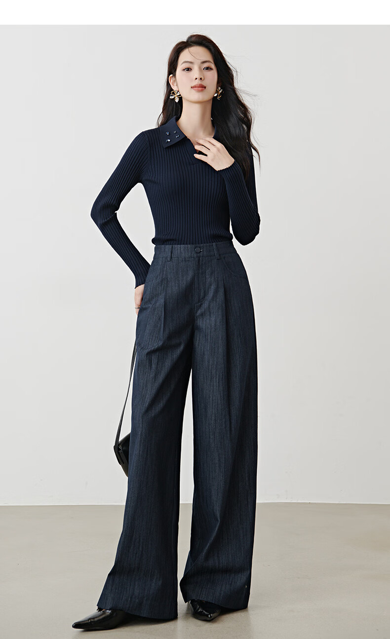晚白2026年春款经典手工钉珠翻领坑条上衣弹力修身亲肤柔软针织衫女 深蓝色 L