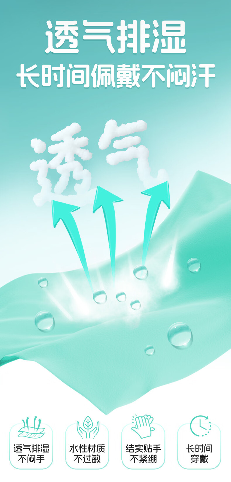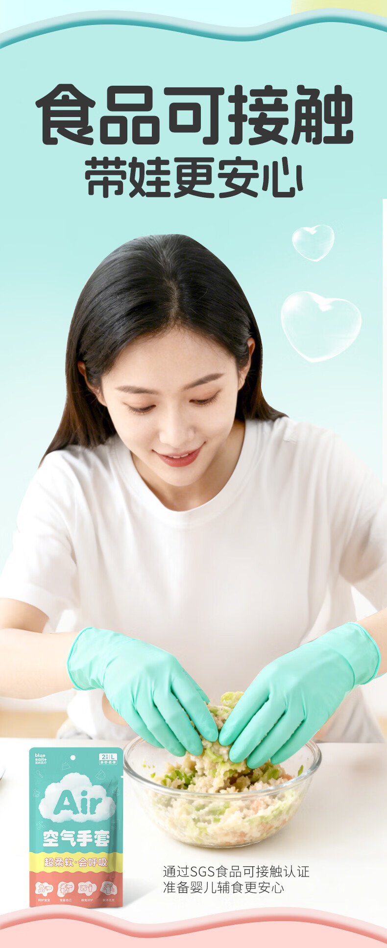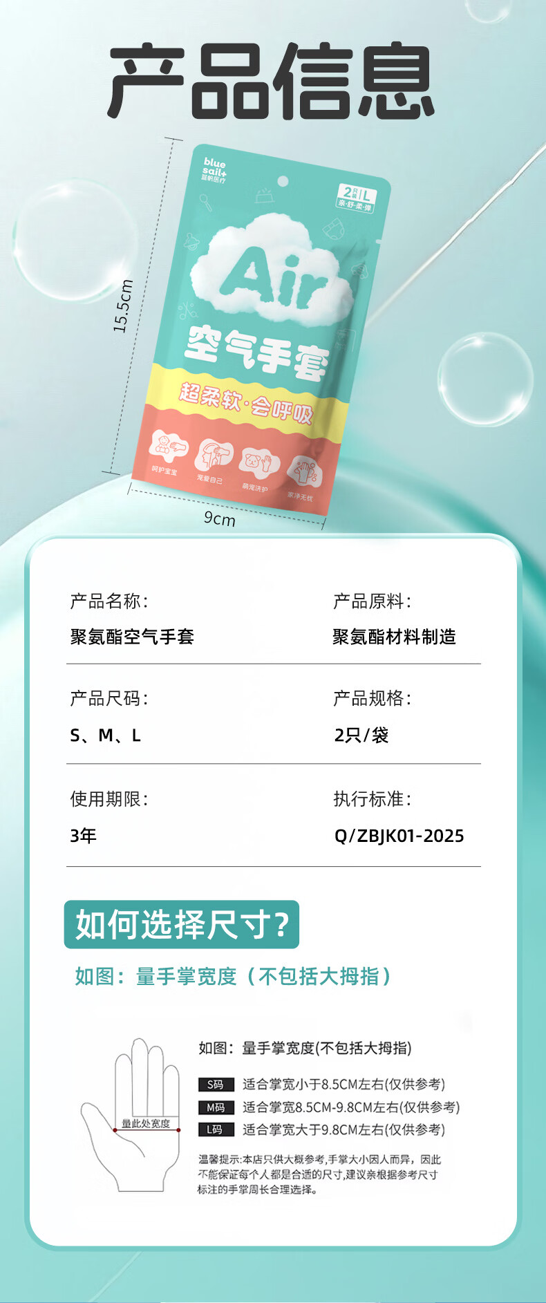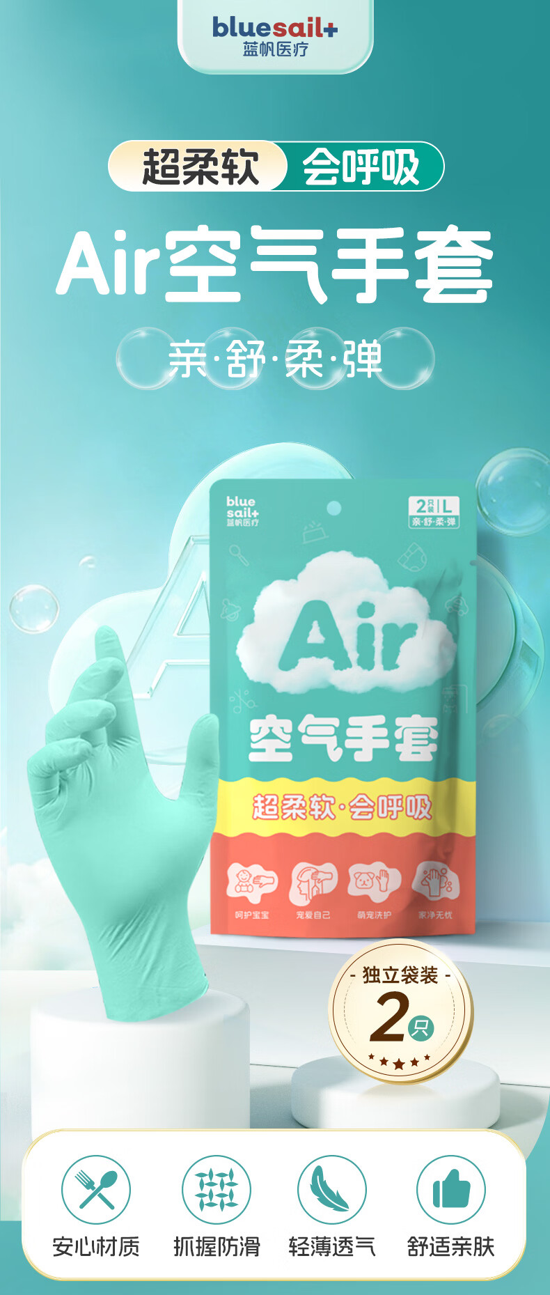 蓝帆医疗(blue sail+)聚氨酯空气手套超薄一次性无粉母婴洗碗宠物清洁手套2只装 M码