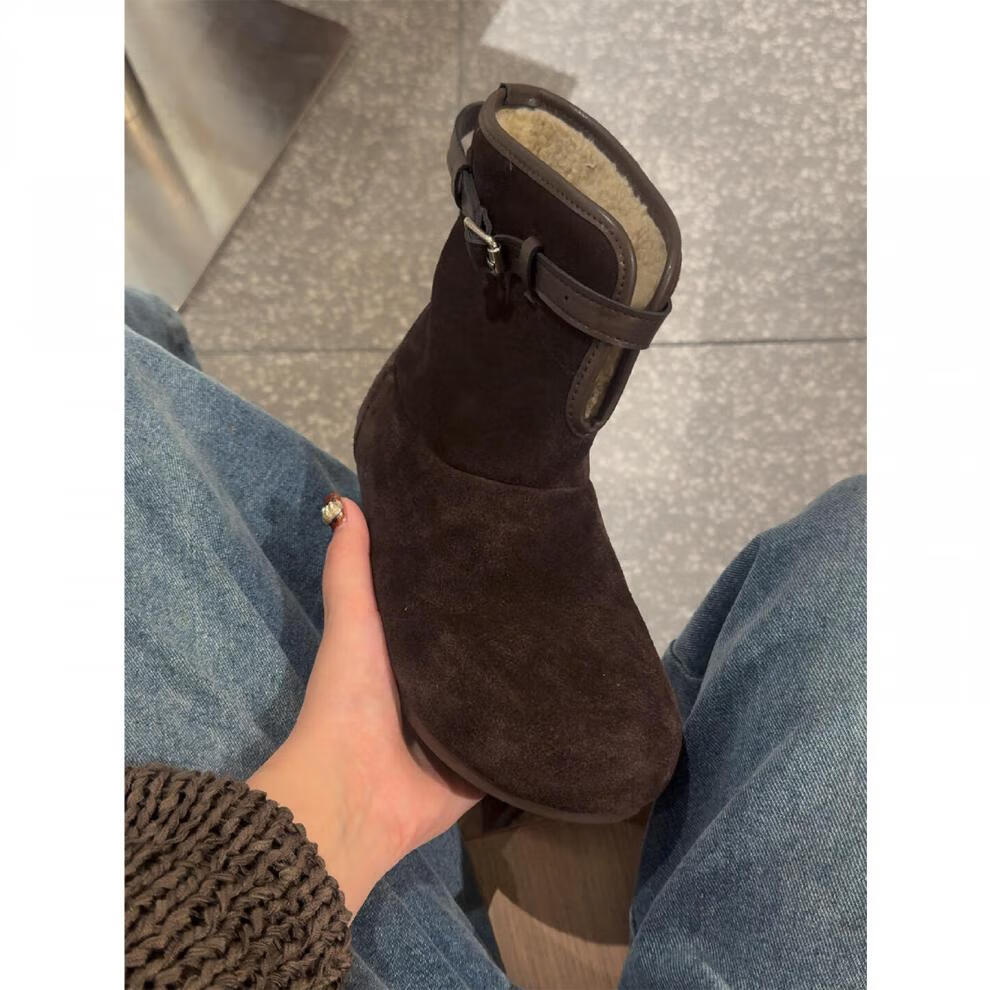 稻草人(MEXICAN)真皮增高雪地靴女冬季加绒厚底毛毛短靴加厚保暖两穿复古勃肯棉鞋 栗色 35