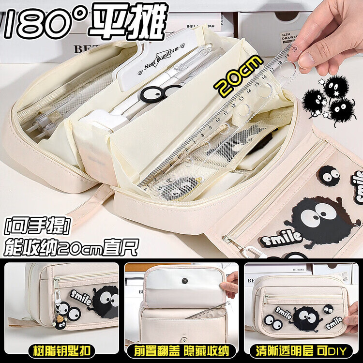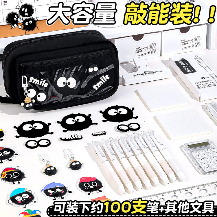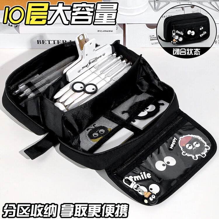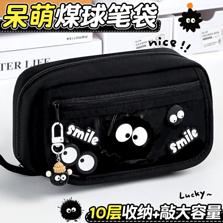 嘉觅2026新款煤球可爱笔袋男女生小学生高颜值ins风文具盒初中生大容量文具袋男女孩小众不撞款铅笔盒 煤球笔袋/经典黑【送钥匙扣+贴纸*10+贴片*3】