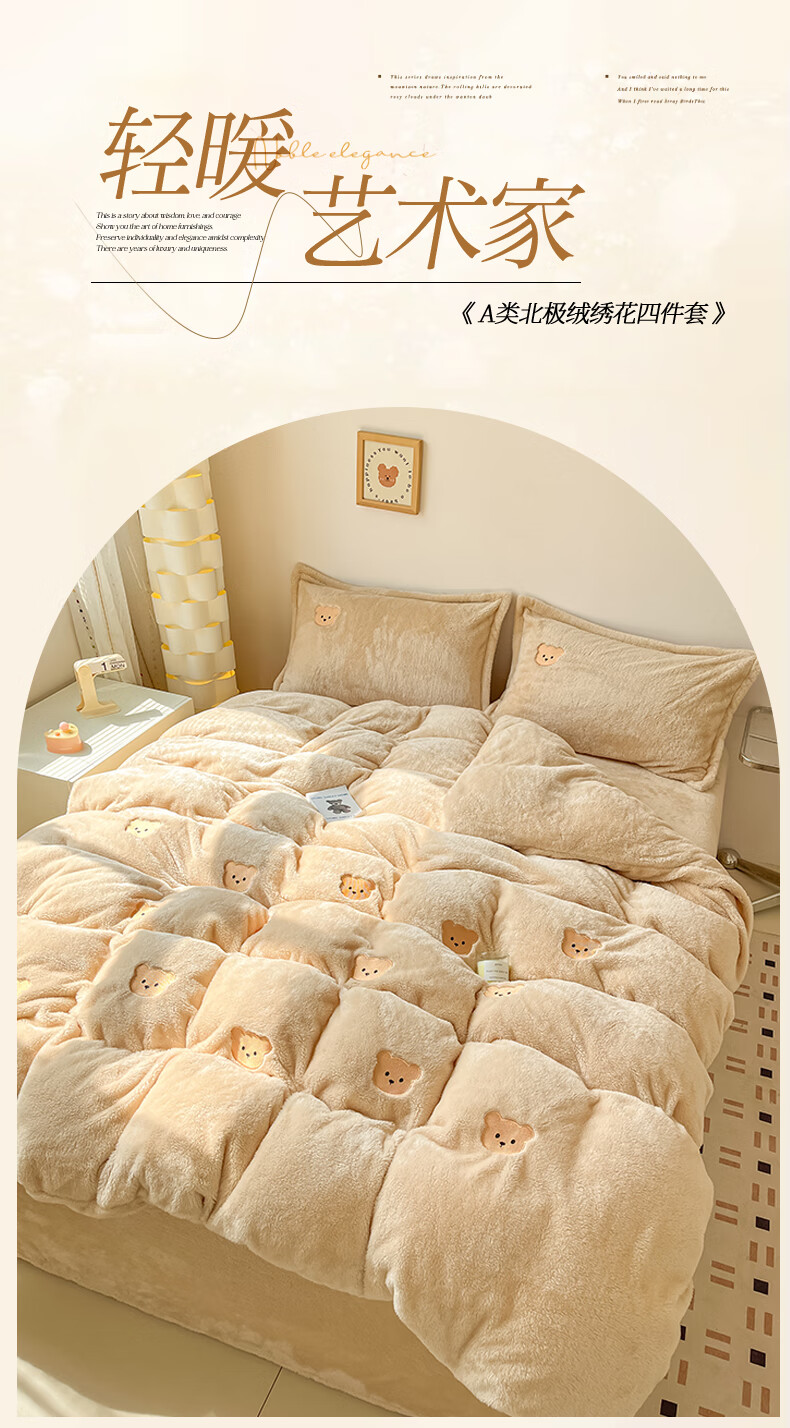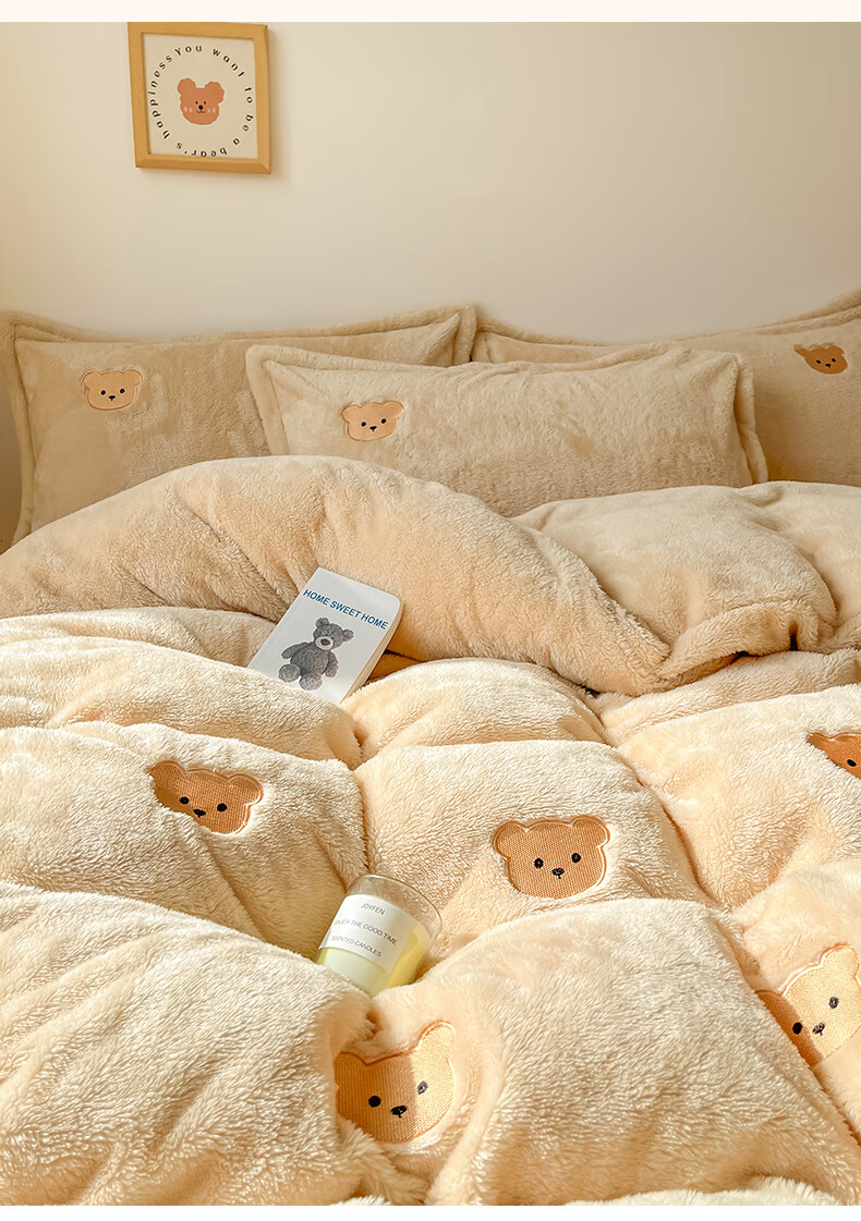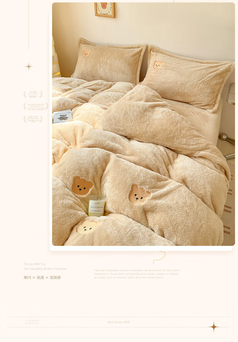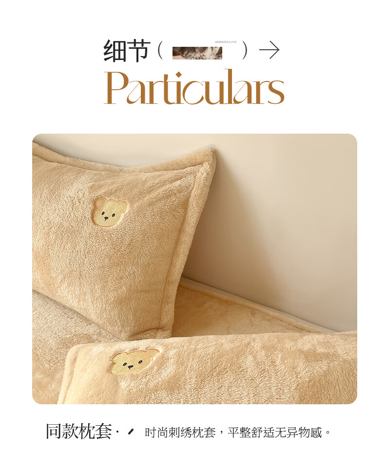 猫人(MiiOW)卡通刺绣牛奶绒床上四件套冬季加厚保暖毛绒珊瑚绒床单被套床品 香槟色【厚实保暖】 0.9m 床单款 三件套-150*200cm被套