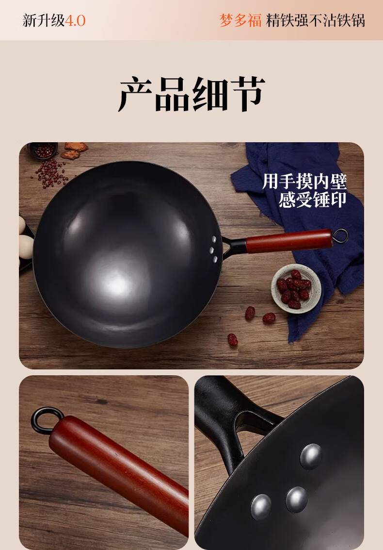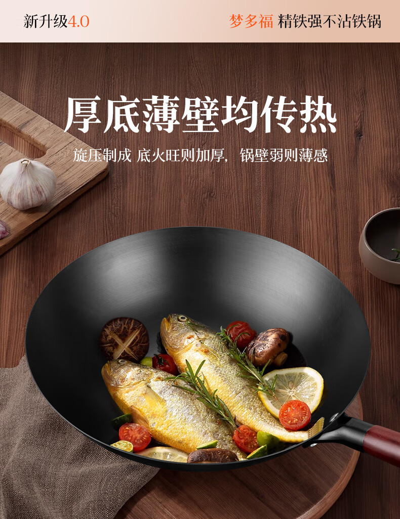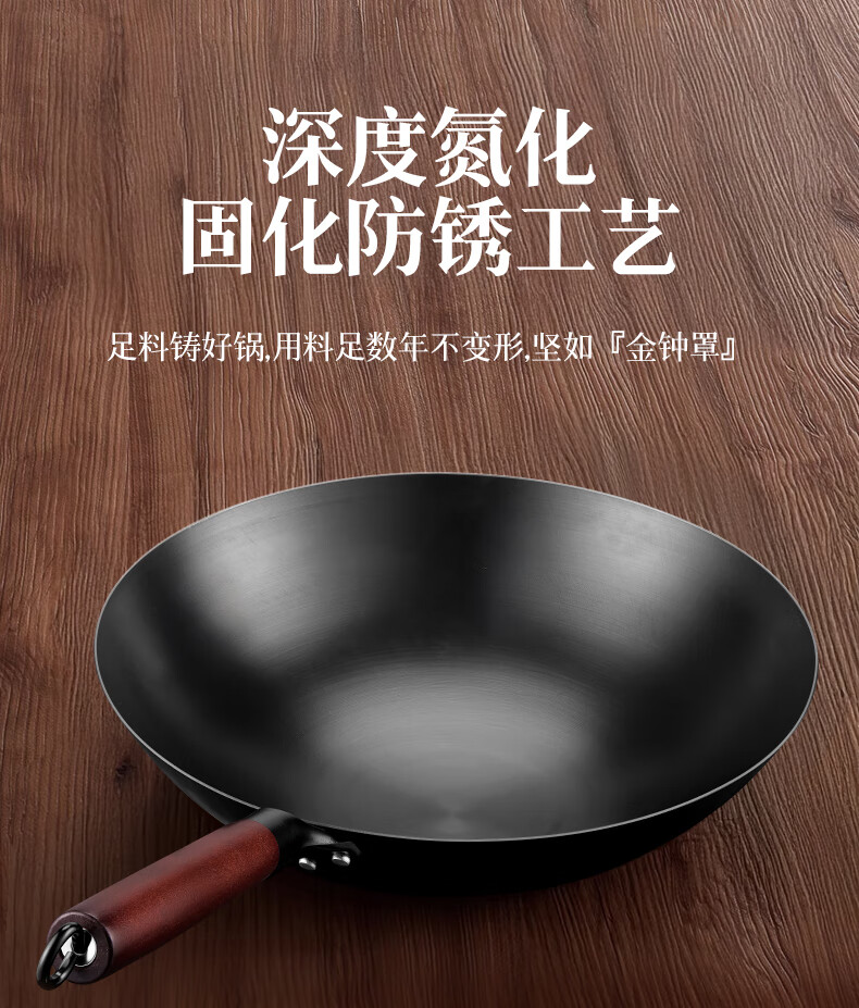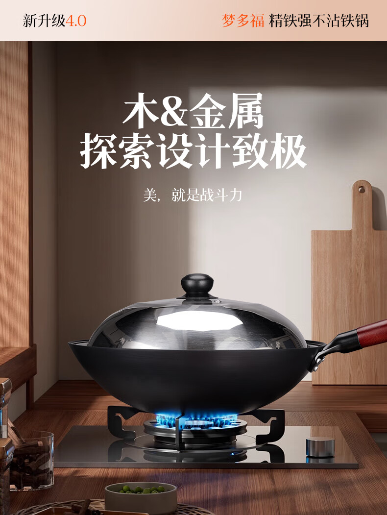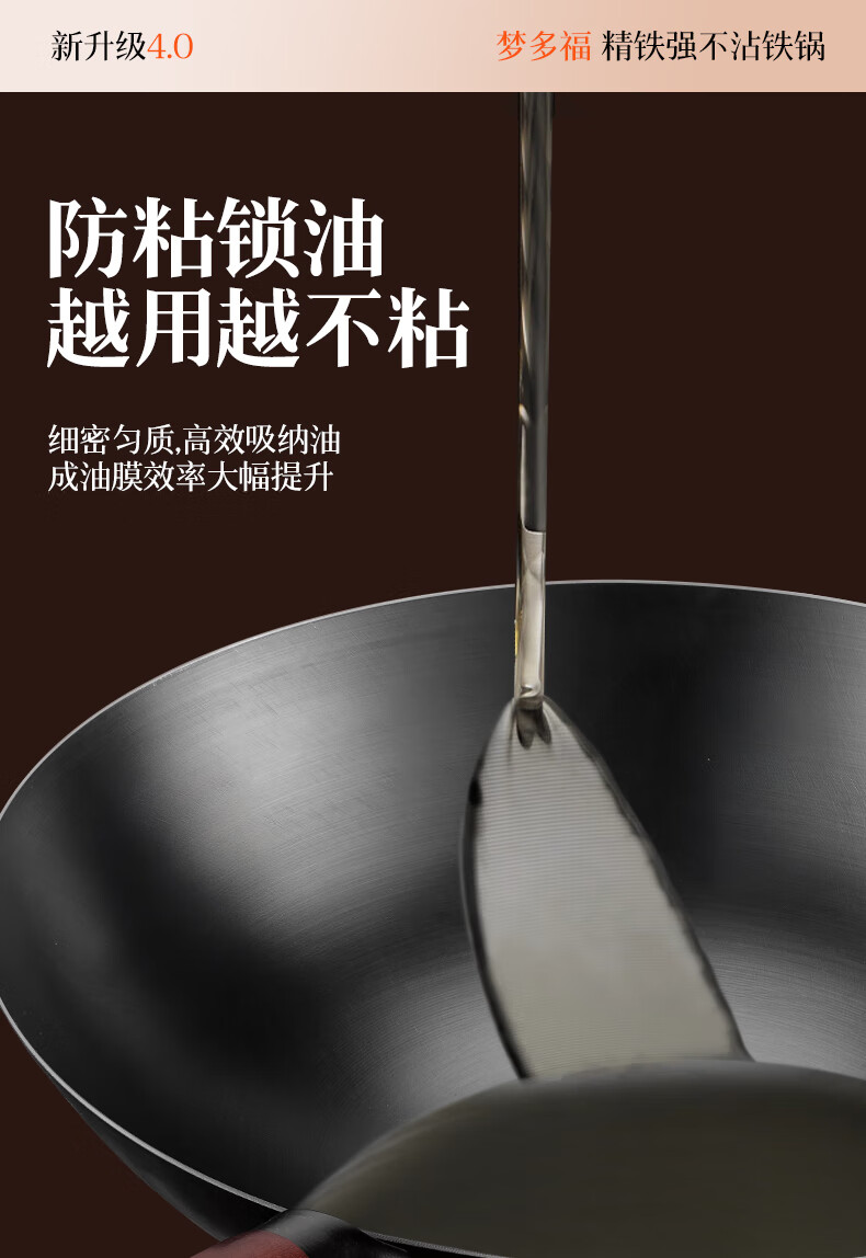 梦多福铁锅炒菜锅不粘锅无涂层炒锅燃气灶专用铸铁锅免开锅圆底炒锅家用 34CM【可视盖】3-7人用-已开锅 34cm 精铁不锈-健康无涂层-氮化不粘锅