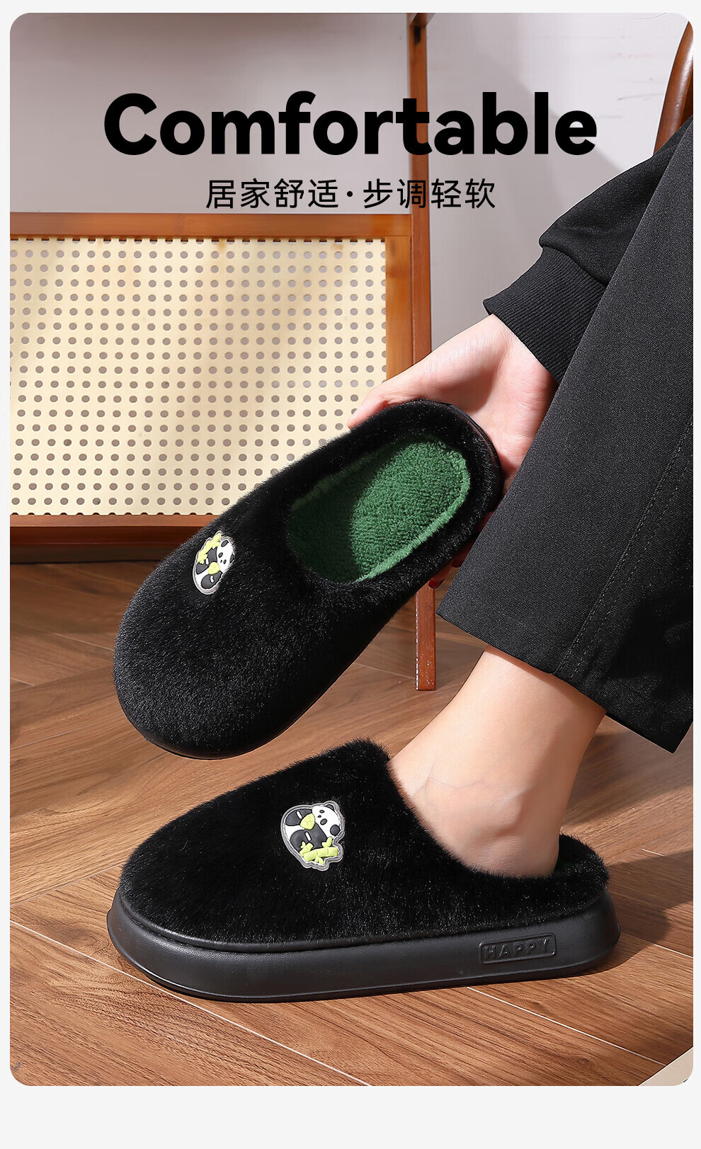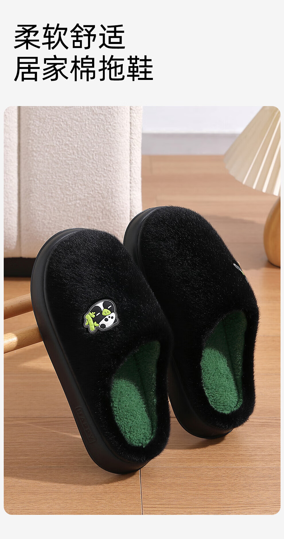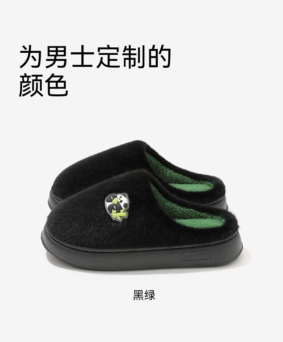 FZT熊猫棉拖鞋男士冬季2025新款室内家居加绒保暖厚底耐磨卡通棉拖女 黑绿 40-41 标准码
