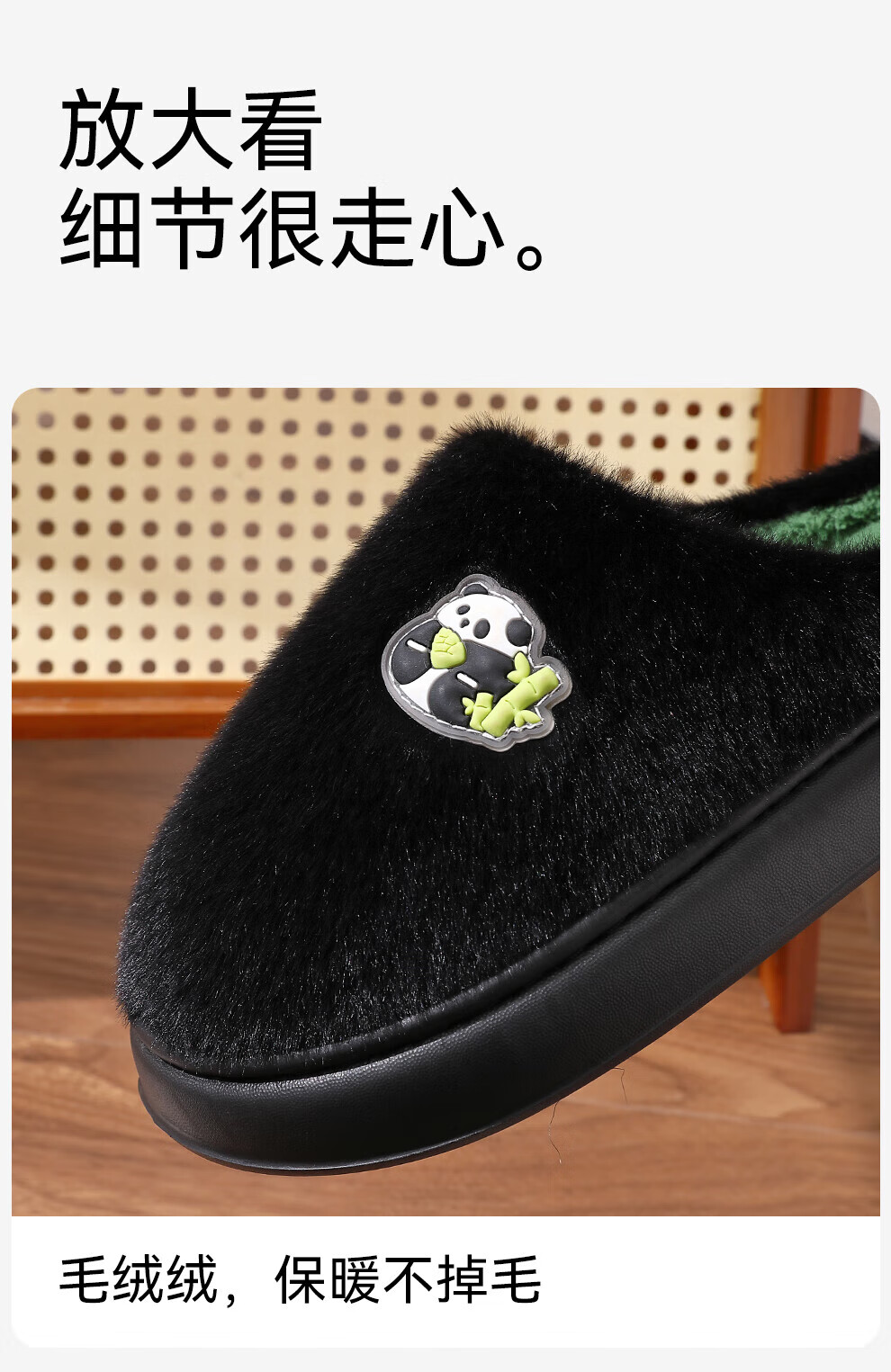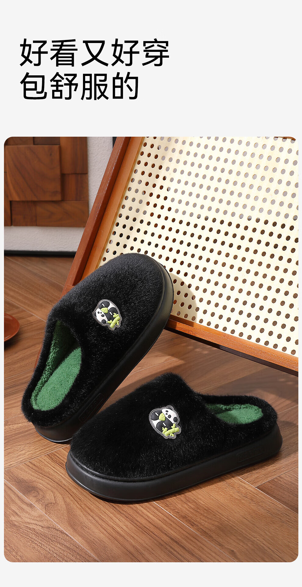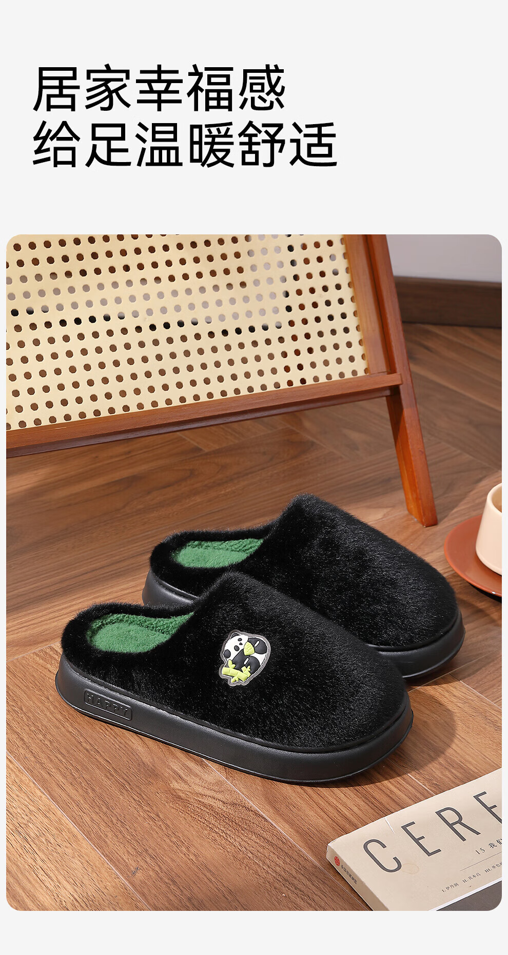 FZT熊猫棉拖鞋男士冬季2025新款室内家居加绒保暖厚底耐磨卡通棉拖女 黑绿 40-41 标准码