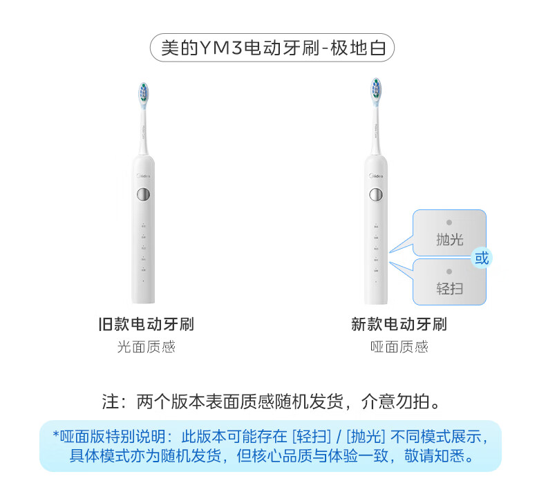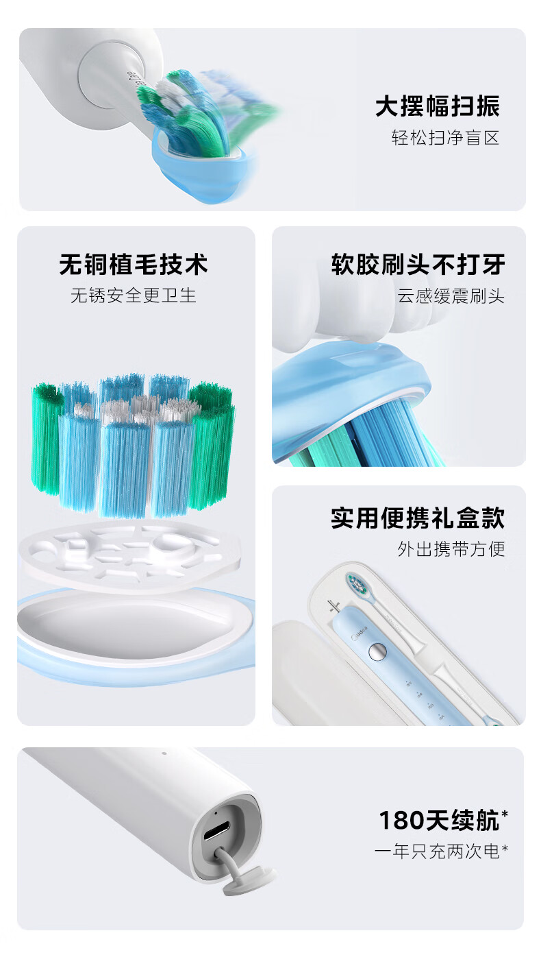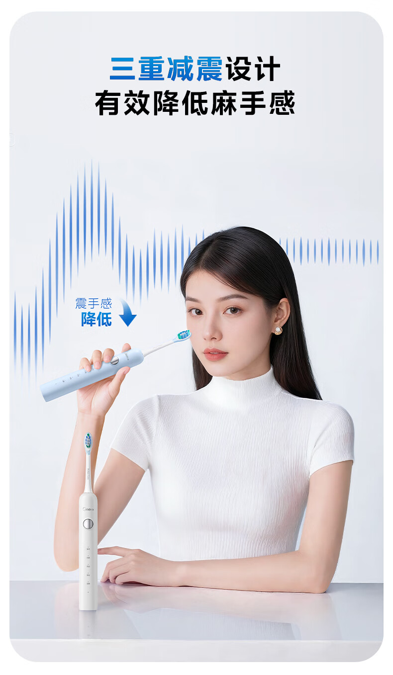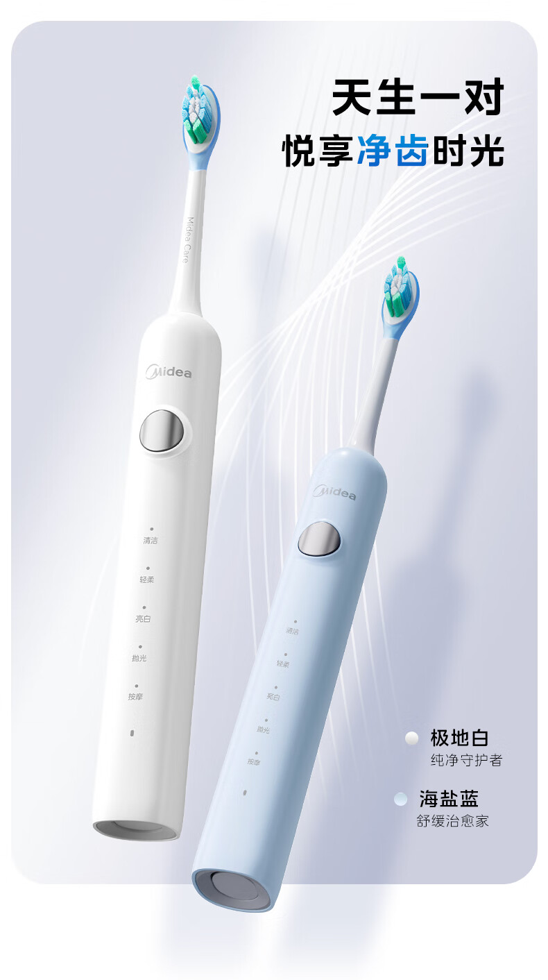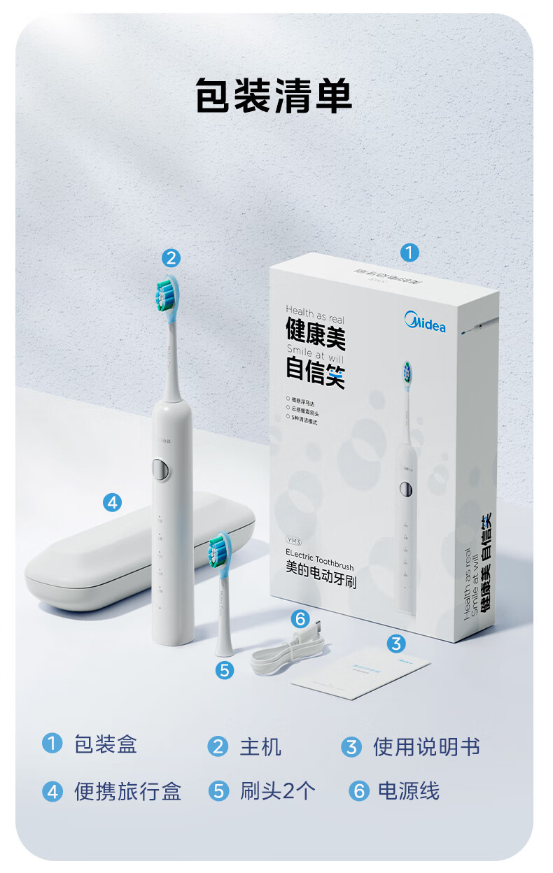 美的(Midea)电动牙刷成人声波扫振便携 180天长续航5种清洁模式 高效清洁牙齿YM3白色男女士 年货节情人节礼物
