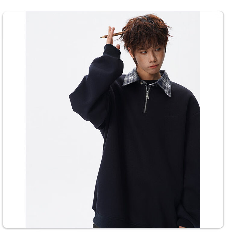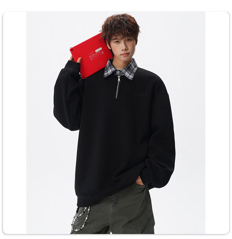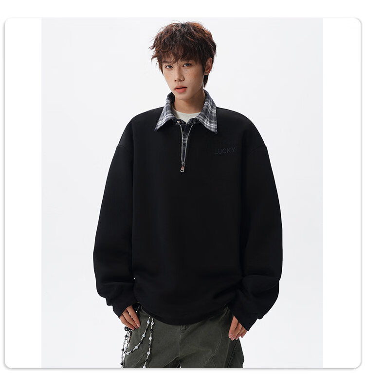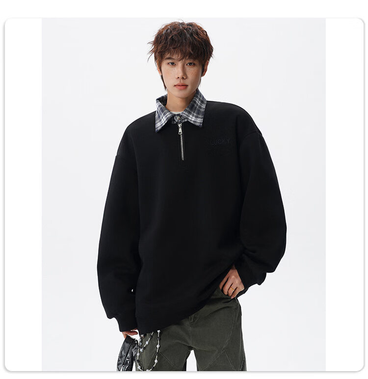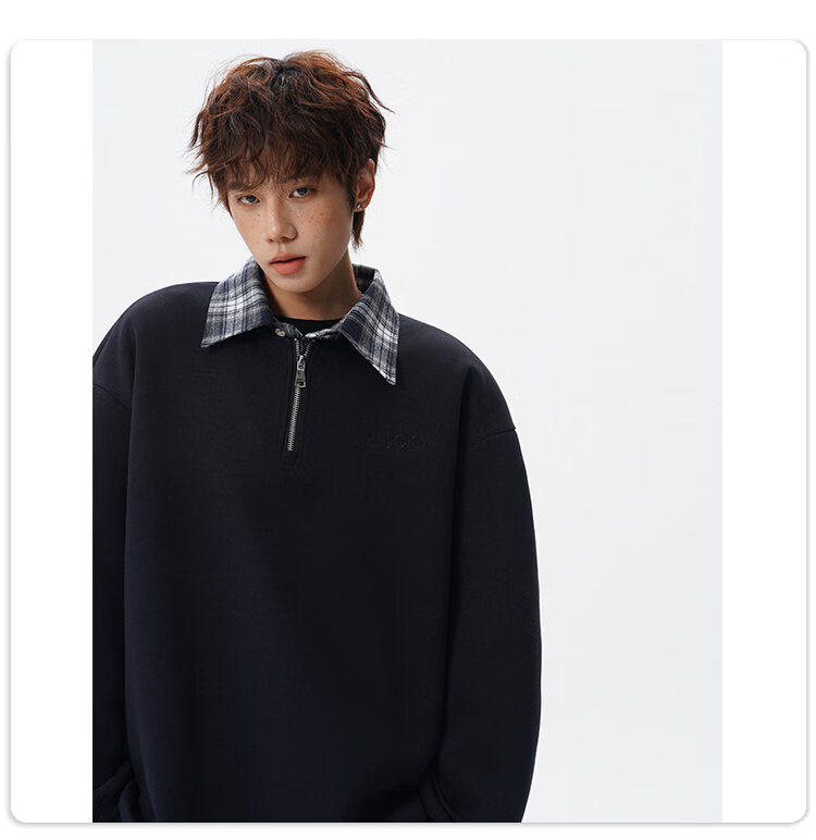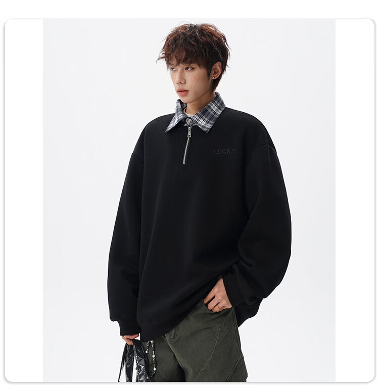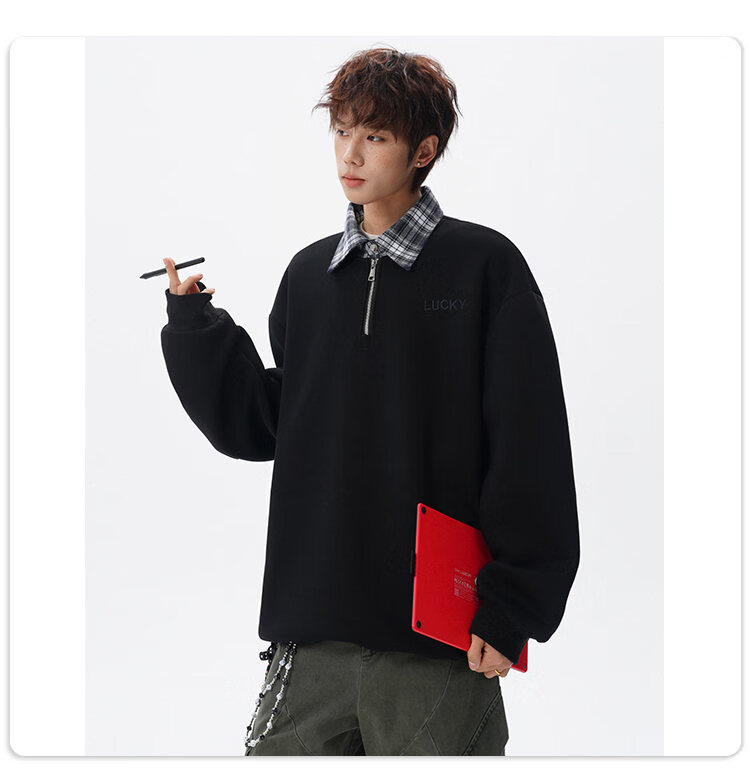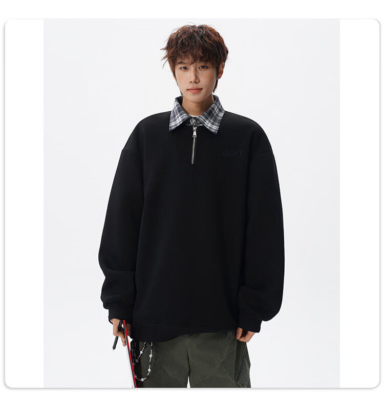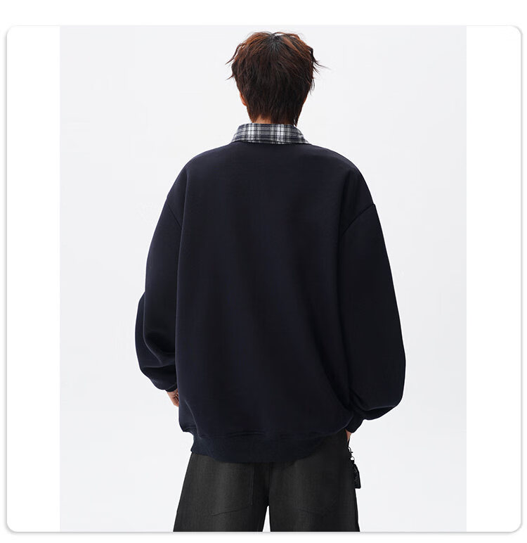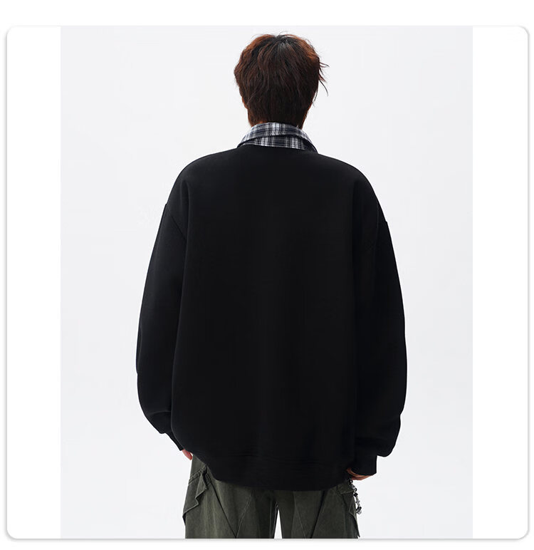 NEW OR MODE美式撞色假两件POLO衫卫衣男冬季新款加绒加厚保暖宽松套头打底衫 黑色加绒 M 【建议90-110斤】