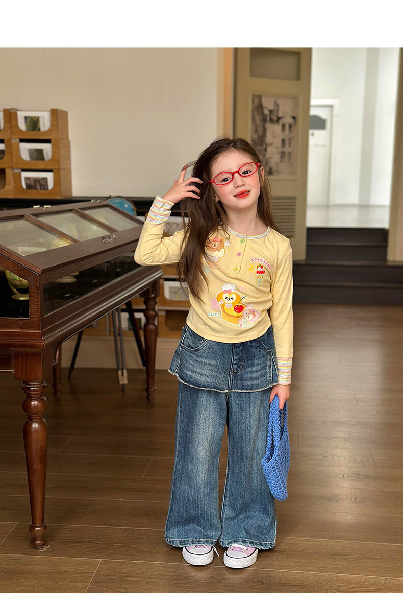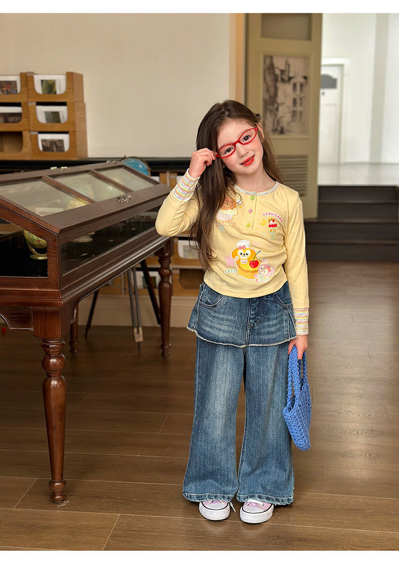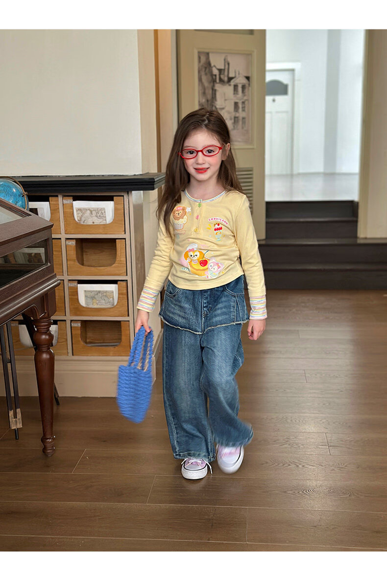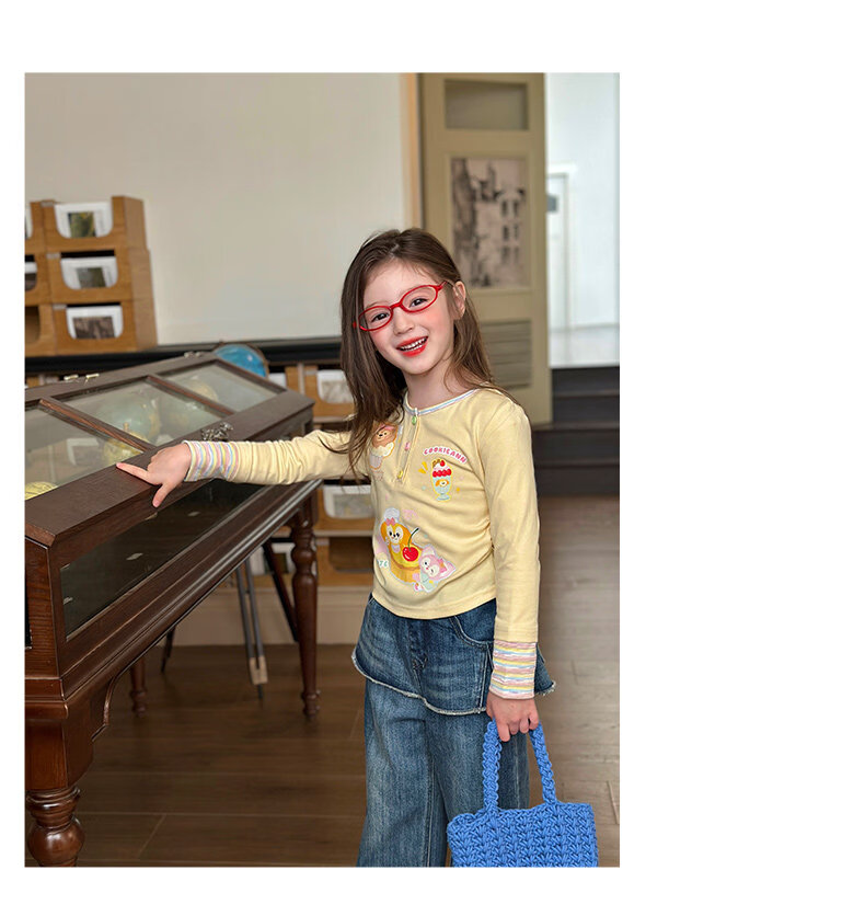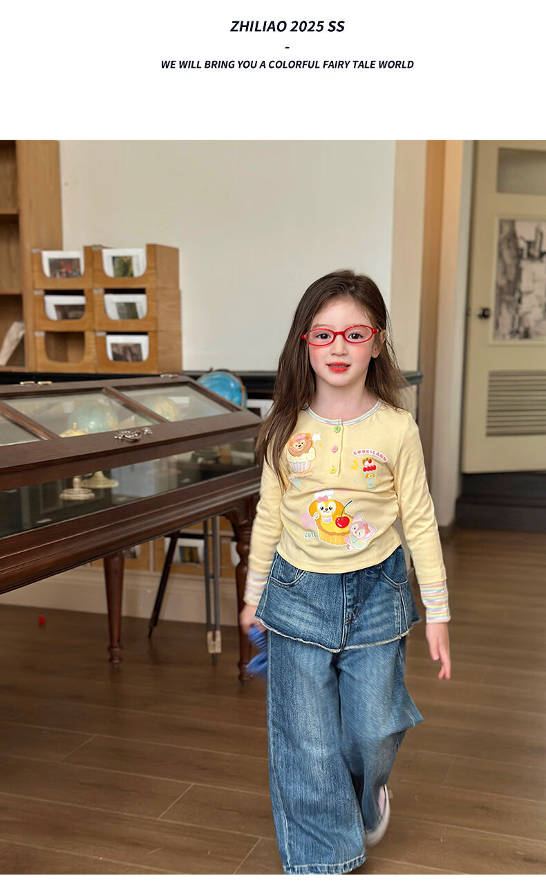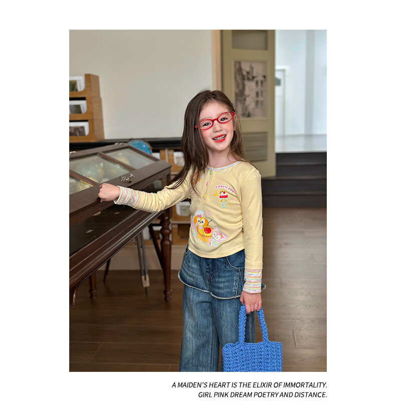 栀了成长记童装女童可爱假两件上衣2026春季儿童新款卡通长袖T恤 黄色 上衣 110 cm