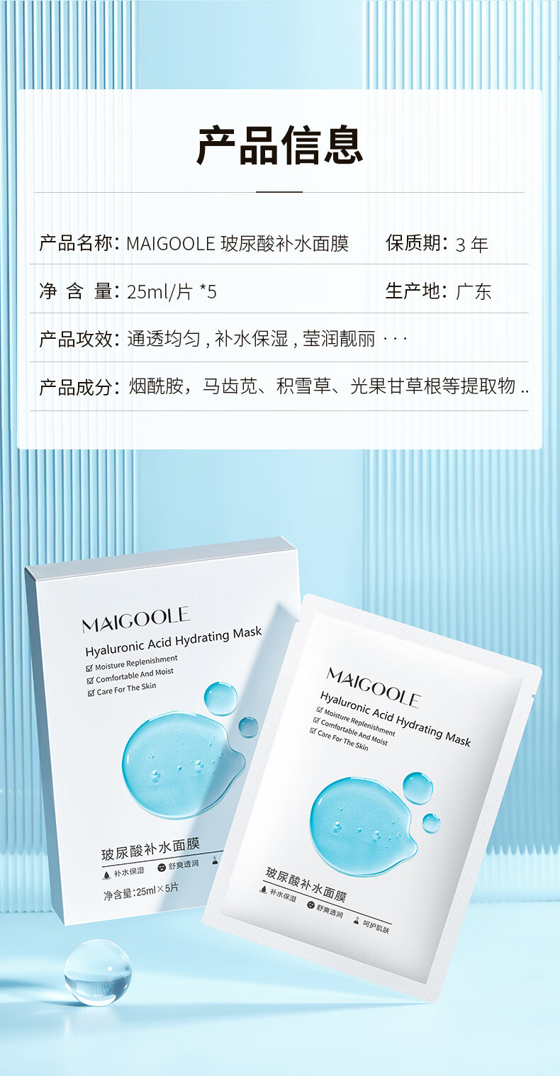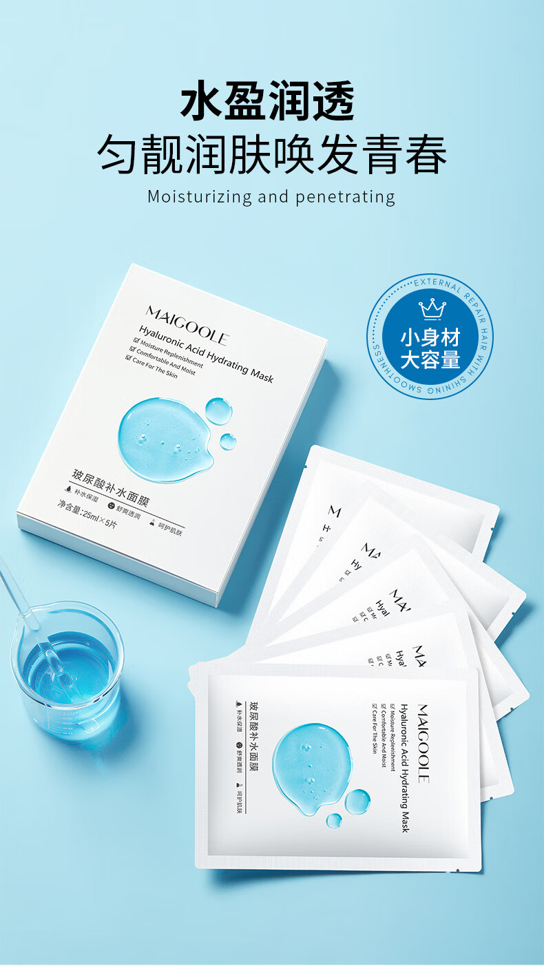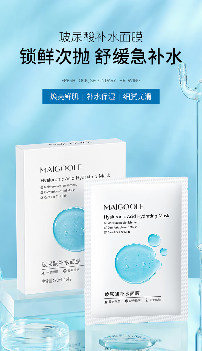 玫黛琳玻尿酸补水面膜肌肤补水保湿滋润嫩肤提亮熬夜暗沉修护面膜 玻尿酸补水面膜(5片/盒)