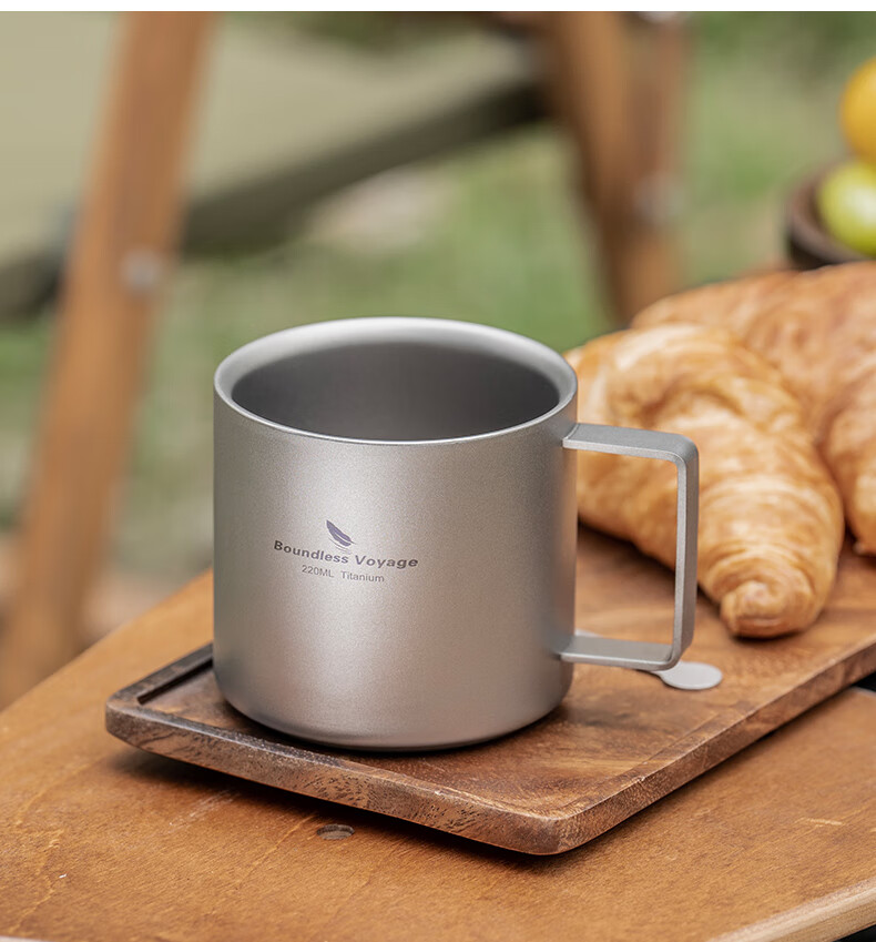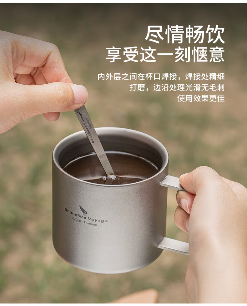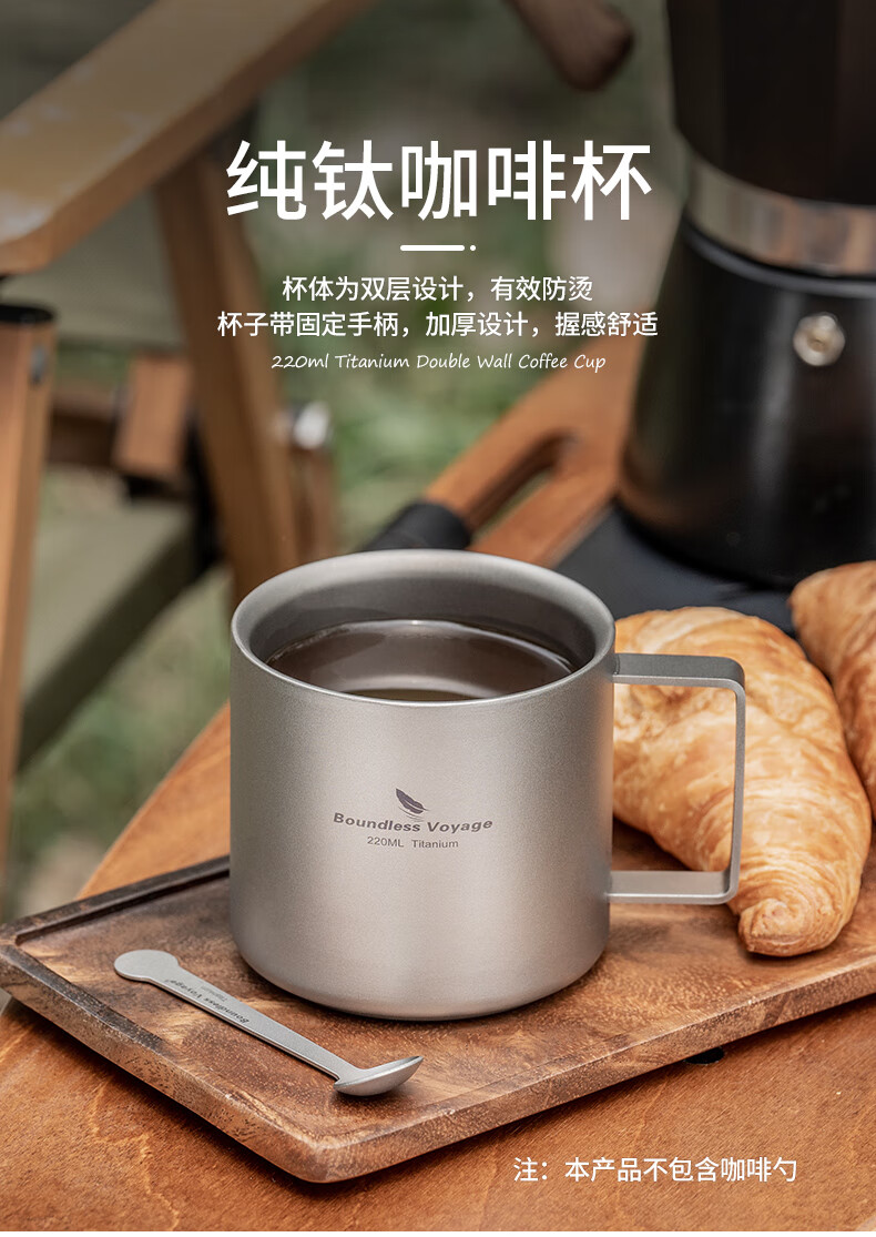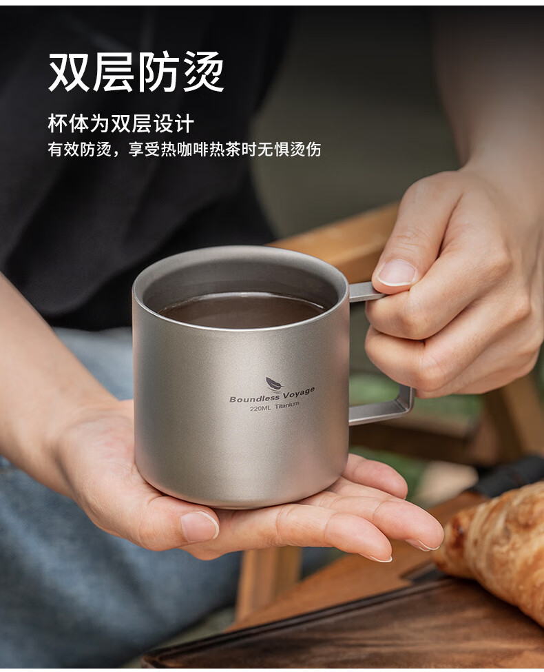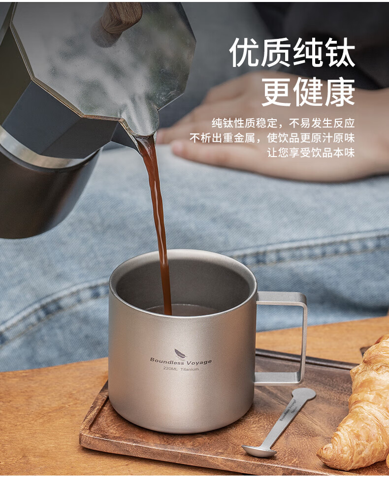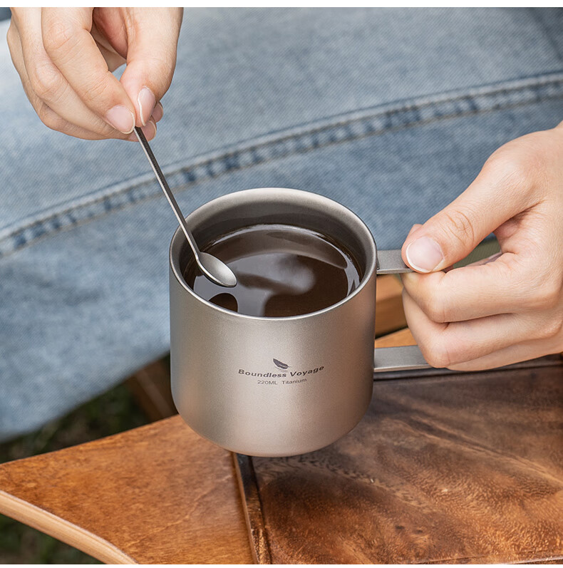 必唯纯钛户外咖啡杯220ml便携露营水杯双层防烫儿童水杯杯子随行茶杯 220ml水杯银色+长咖啡勺