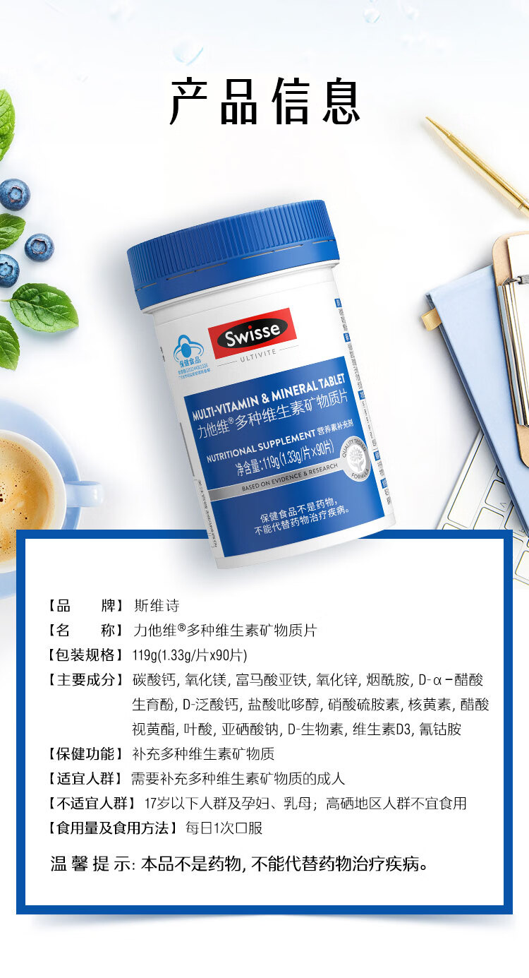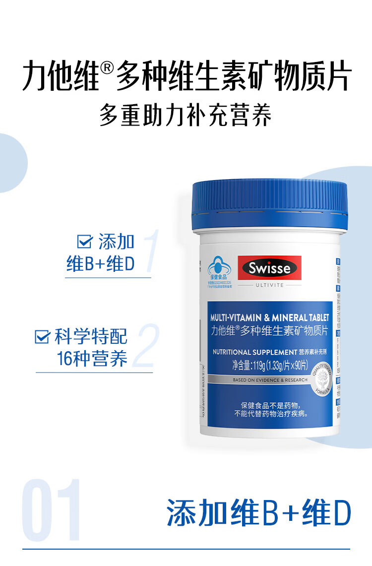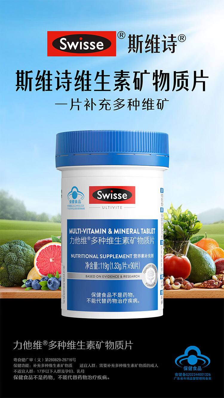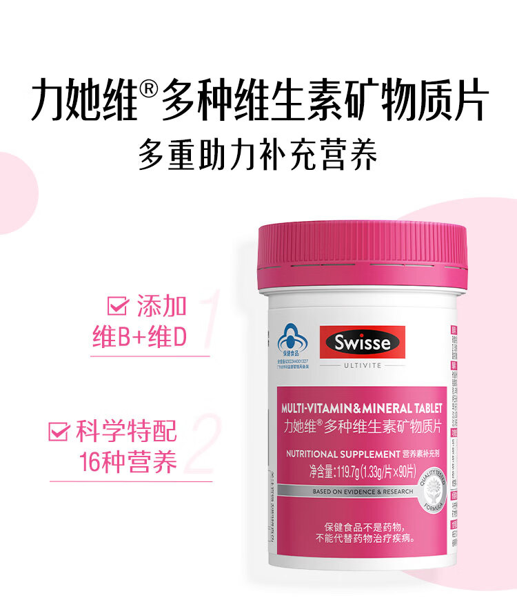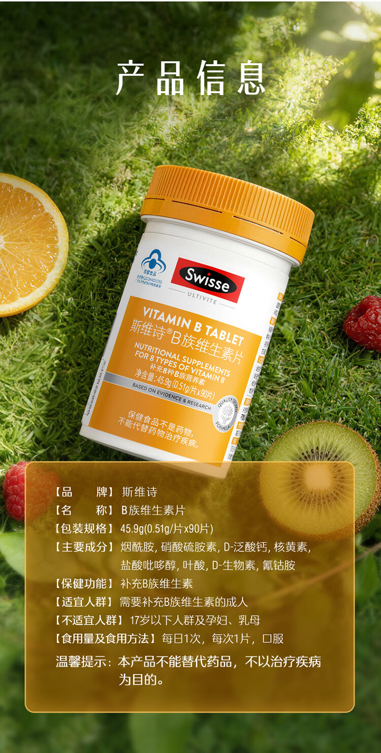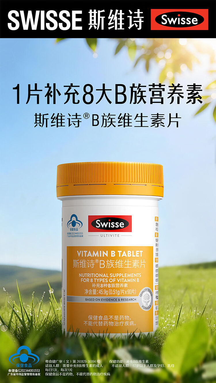 Swisse斯维诗 B族维生素片 复合维生素B 含b6b12泛酸叶酸烟酸 蓝帽认证 【加班熬夜必备】0.51g/片* 90粒*1瓶