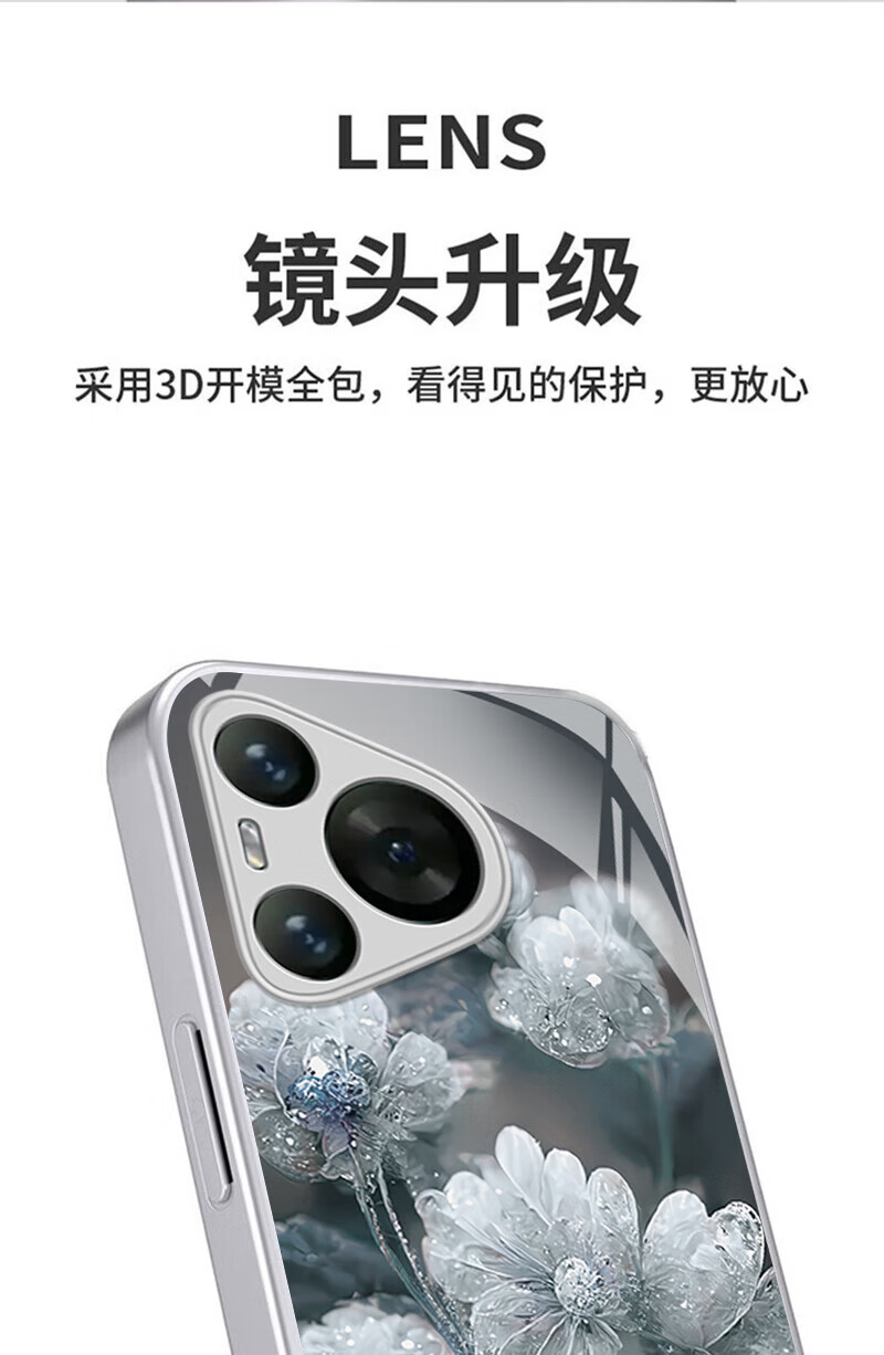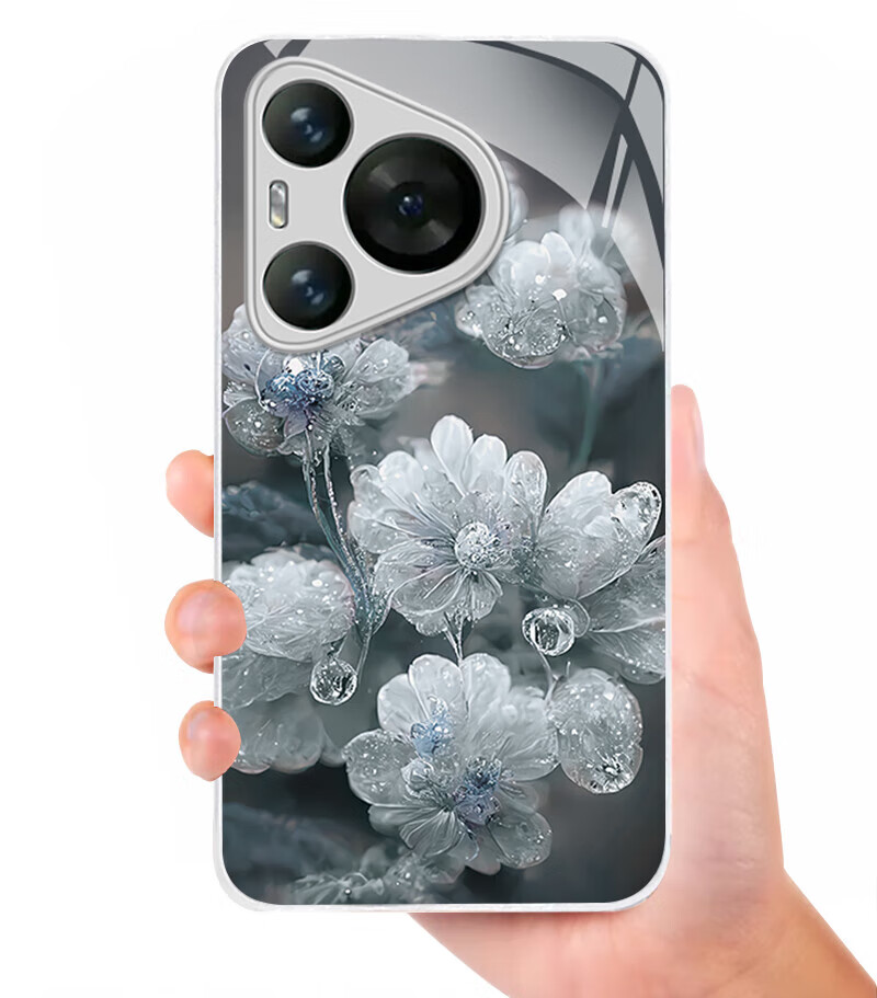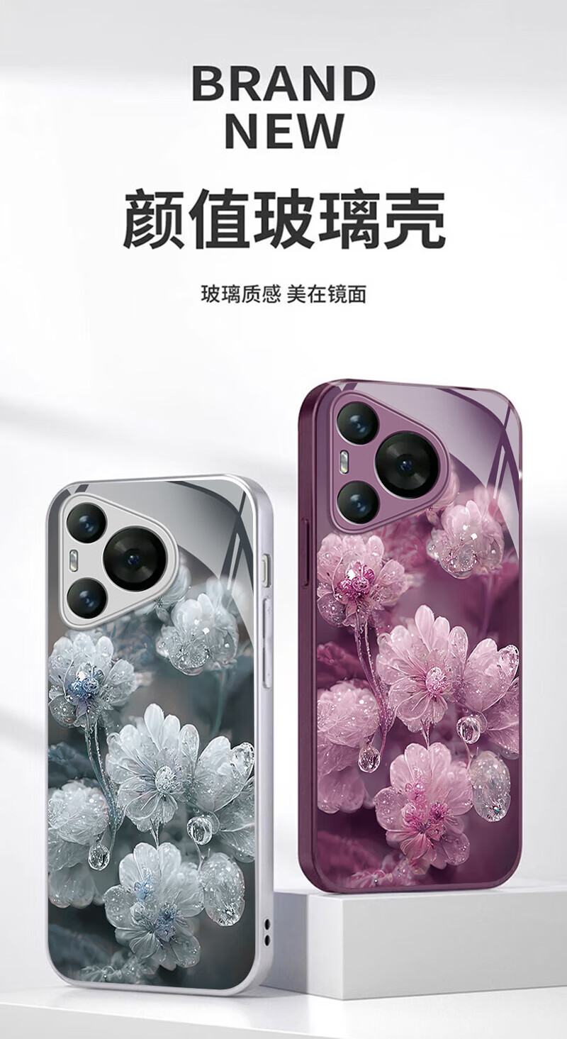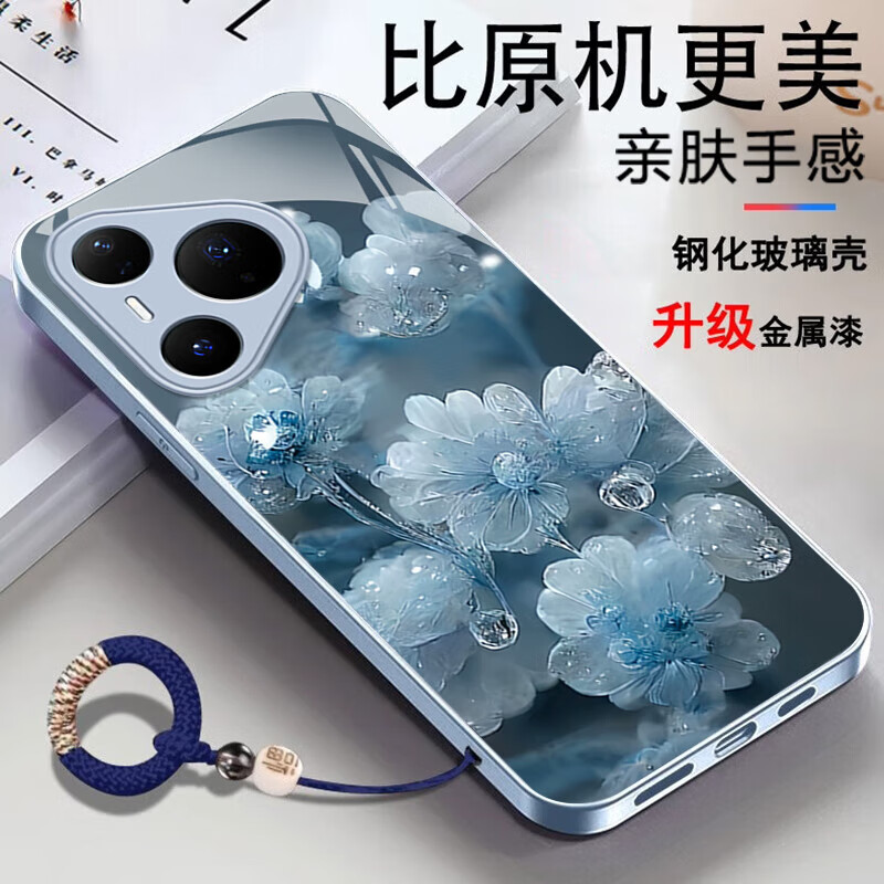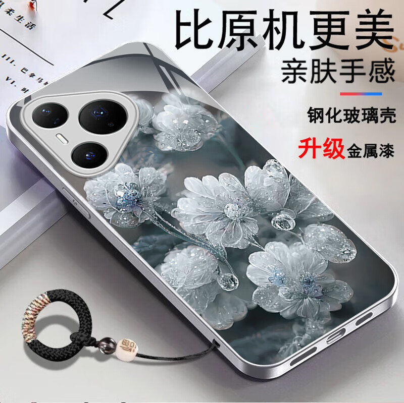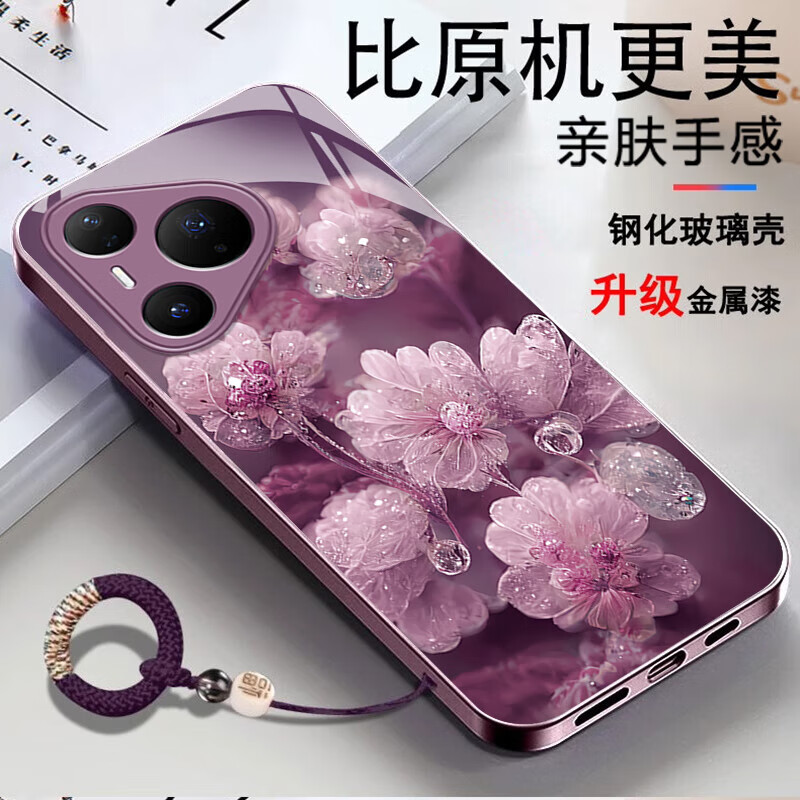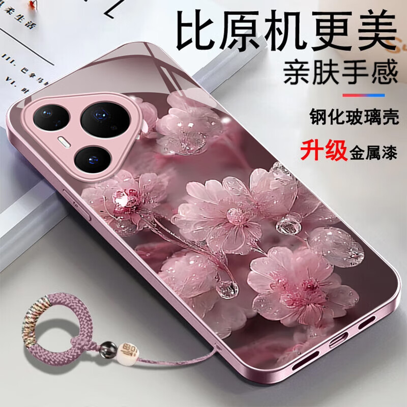 适用华为Pura80手机壳金属漆玻璃晶莹花朵P70pro镜头全包防摔外壳 优雅黑晶莹粉花+圆满手绳 华为 P60 Art