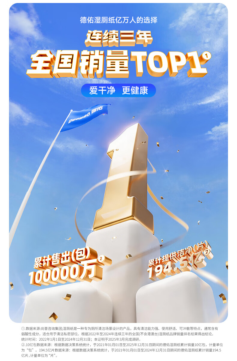德佑湿厕纸经典款80抽*5包家庭装洁厕湿巾纸擦屁屁专用加厚亲肤可冲散