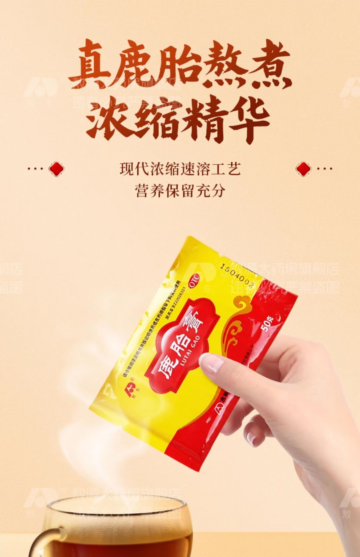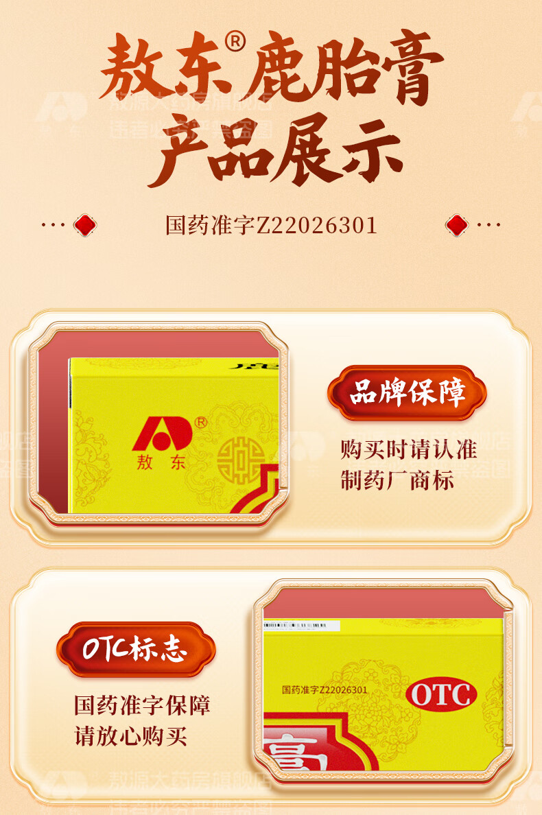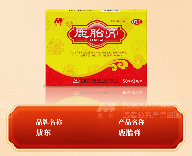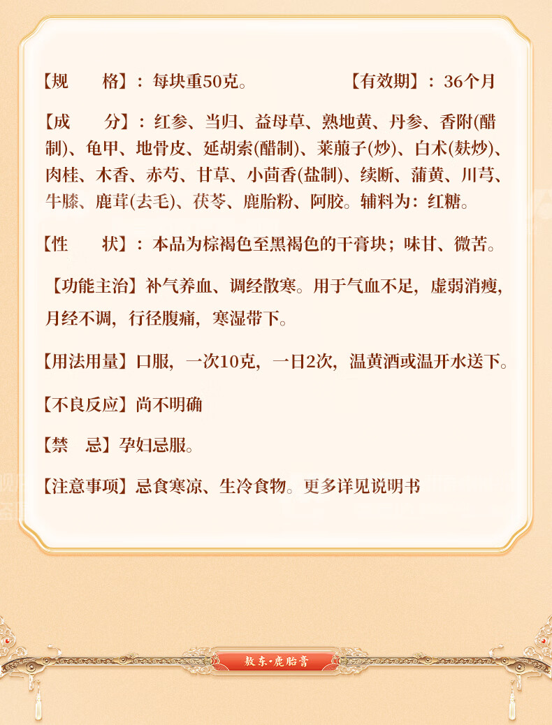 [敖东]鹿胎膏 50g*2块 2盒装 50g*2块/盒补气养血调经散寒气血不足月经不调痛经备孕涨内膜宫寒手脚凉怕冷睡眠差 敖东正品 假一赔十倍