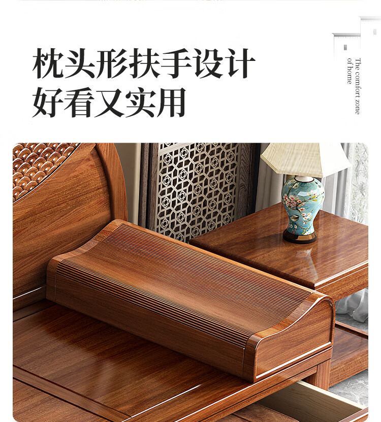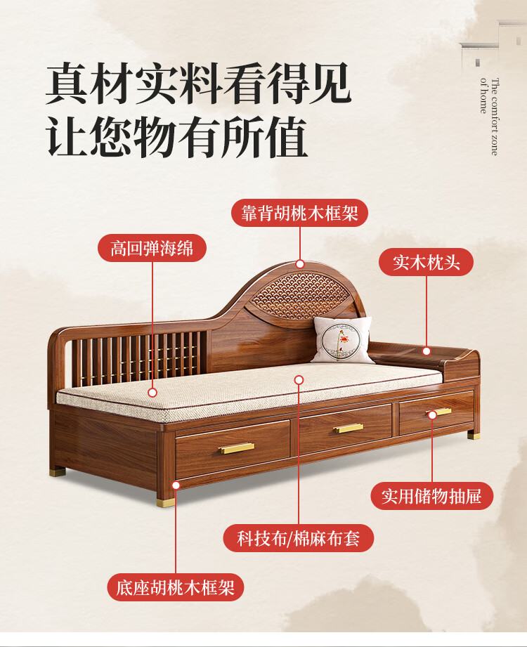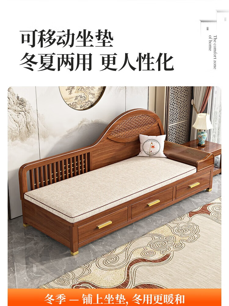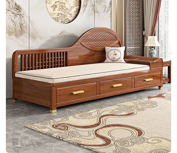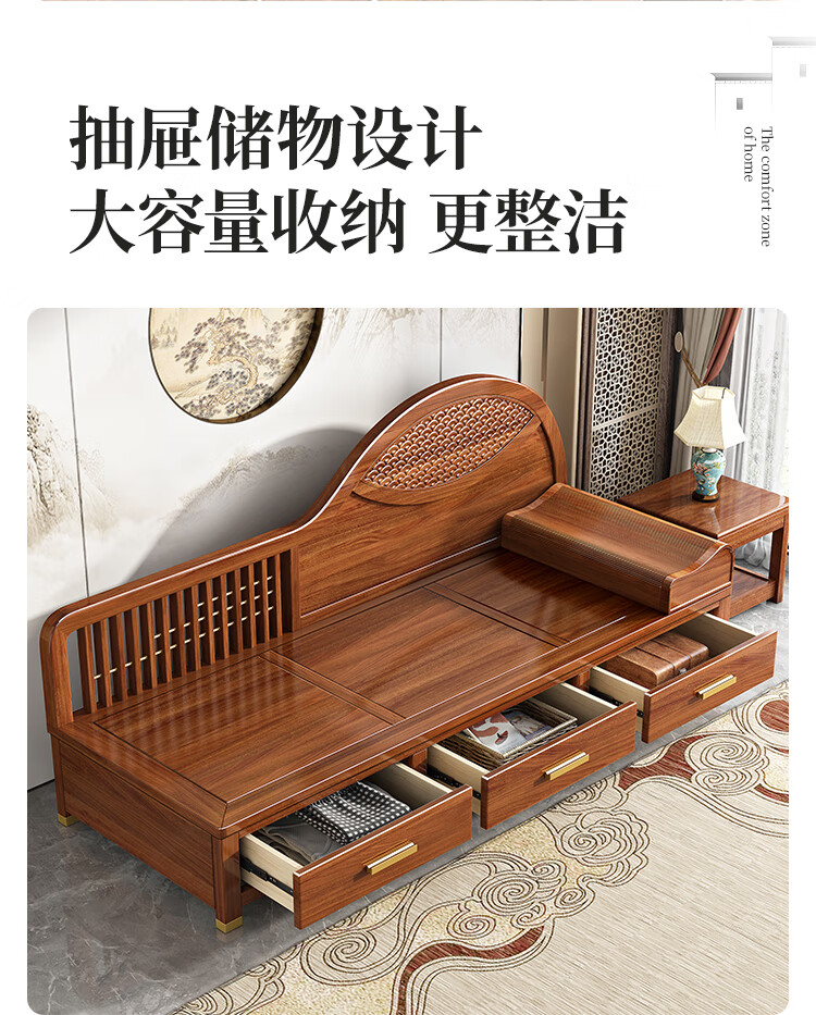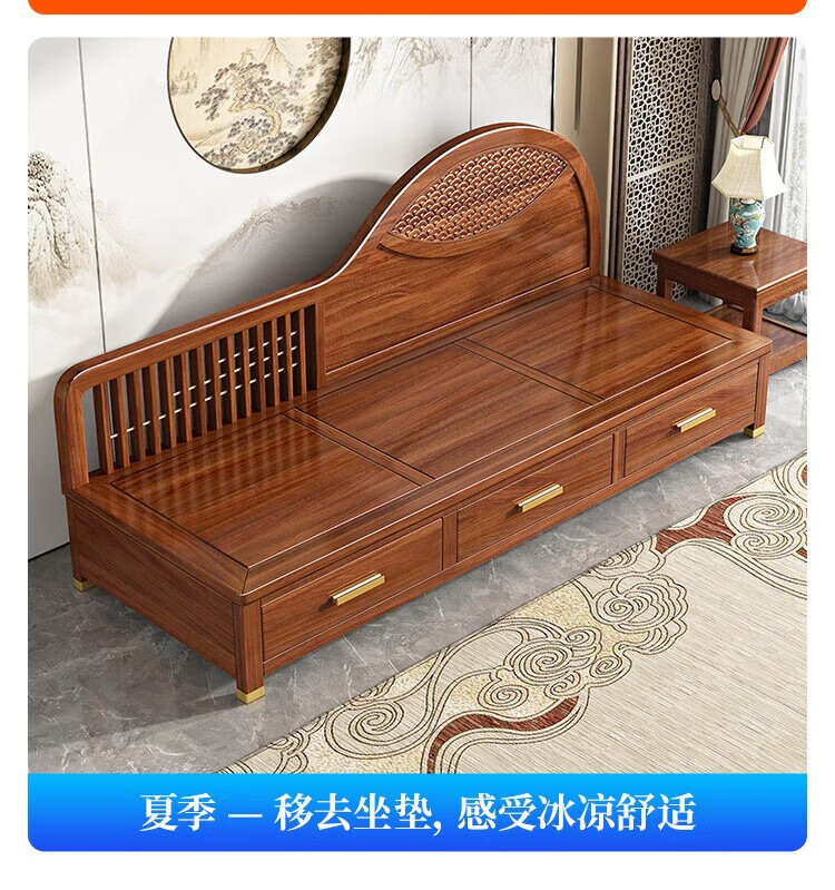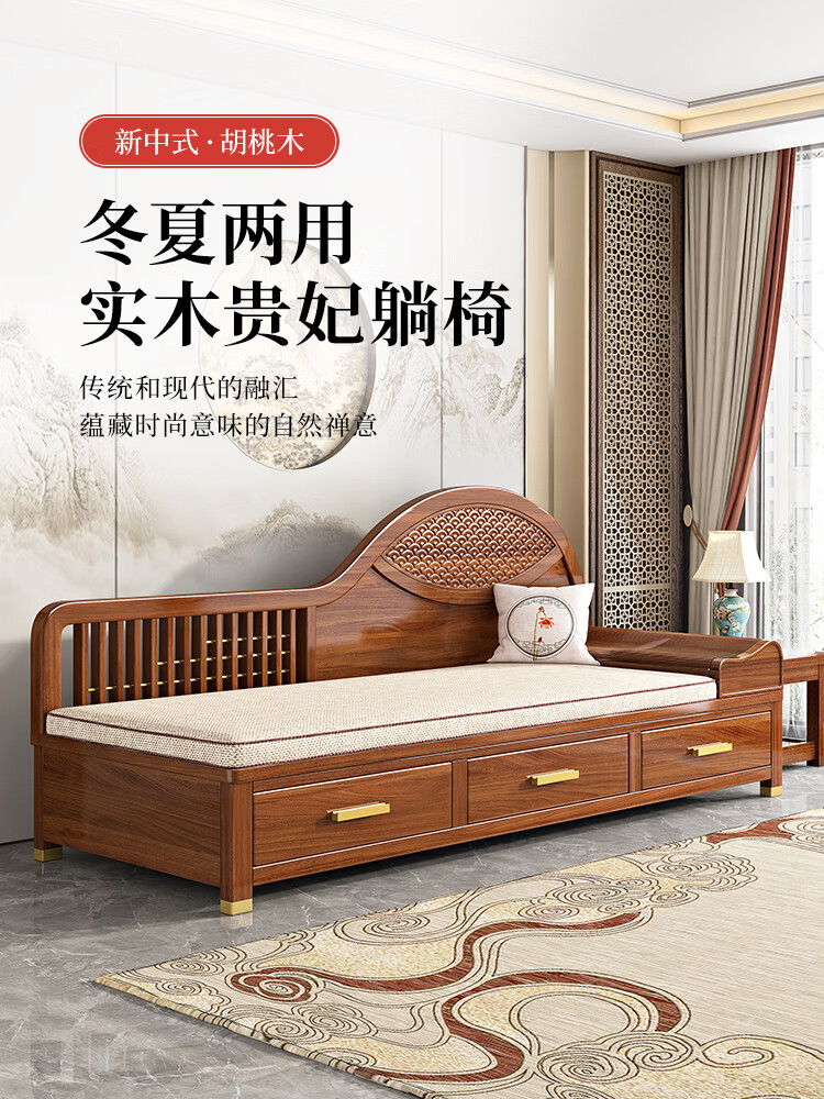 澜轩中式胡桃木实木沙发床多功能贵妃椅带抽屉美人榻两用客厅卧式躺椅 【胡桃木】贵妃躺椅(不带坐垫)