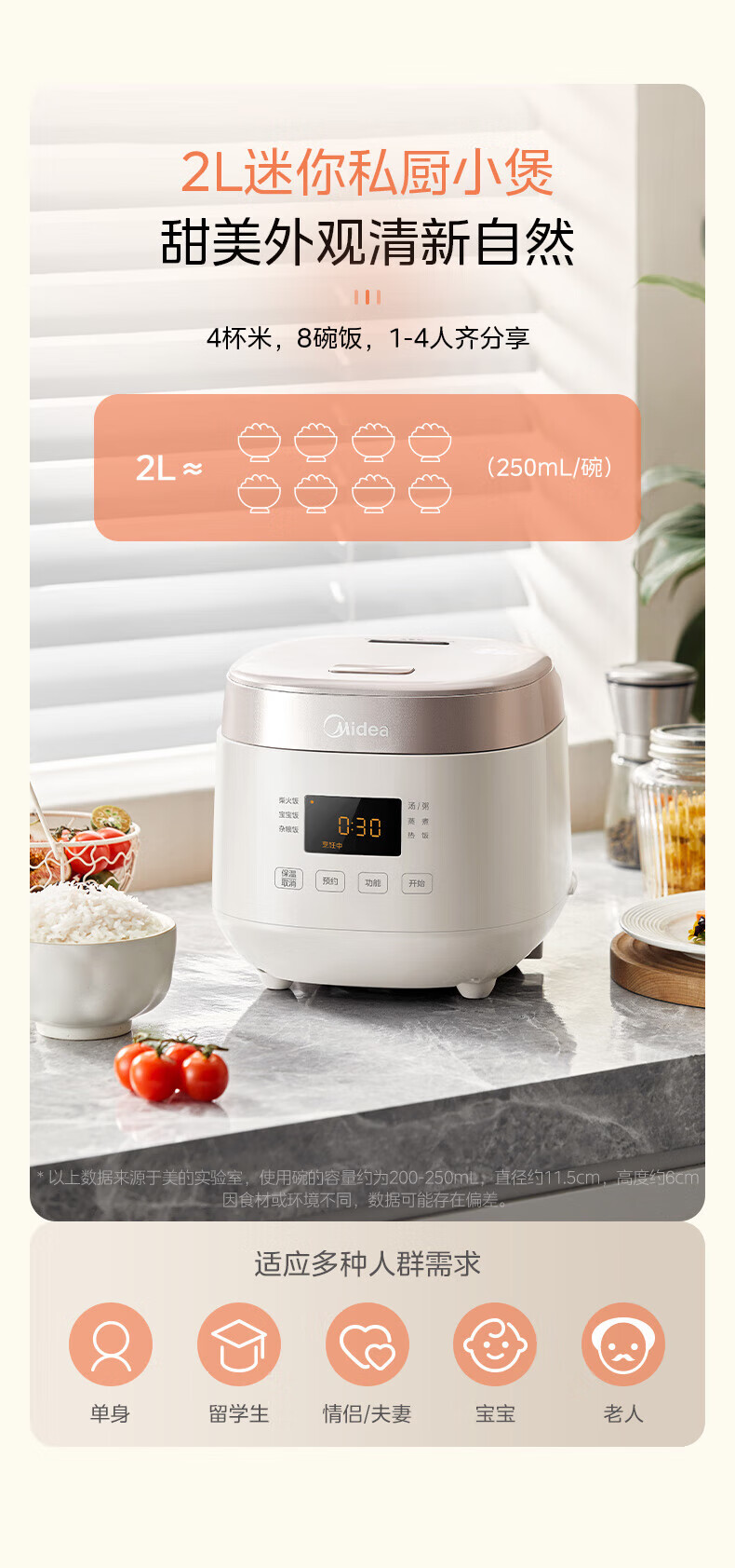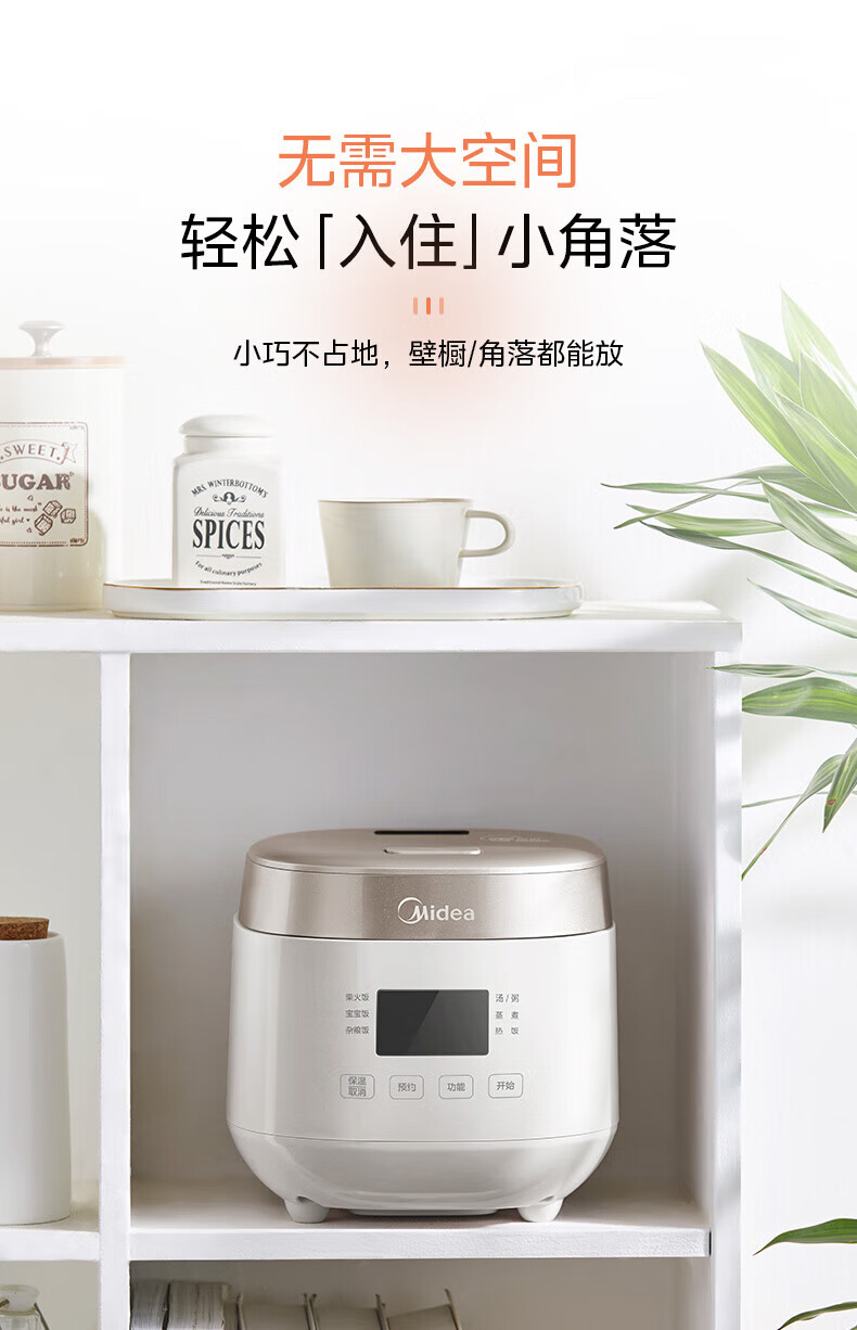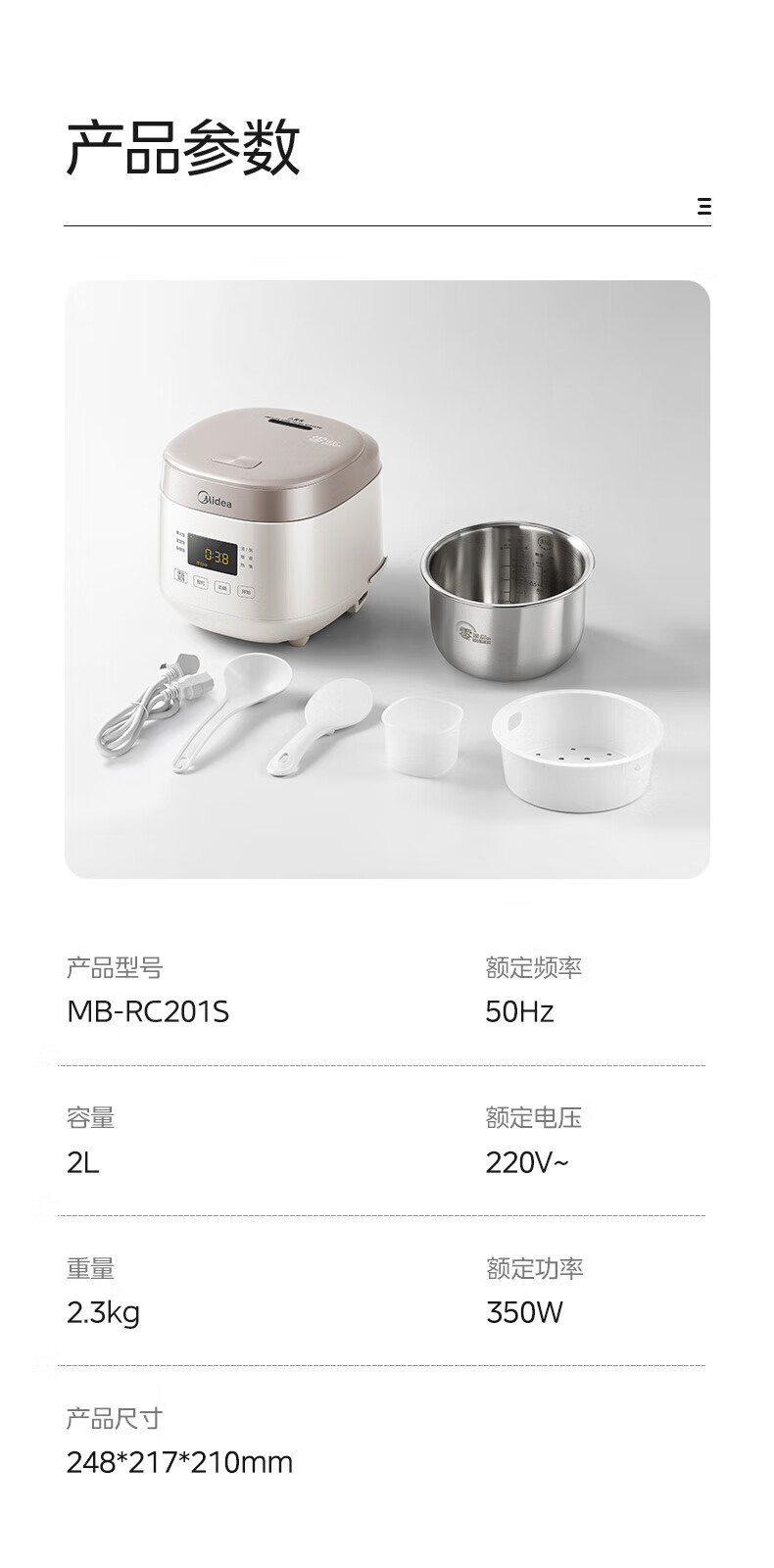 美的(Midea)0涂层2L不锈钢内胆1-2人电饭煲电饭锅 家用智能多功能微压无涂层电饭煲预约柴火杂粮饭MB-RC201S 【0涂层小煲】316L不锈钢 2L