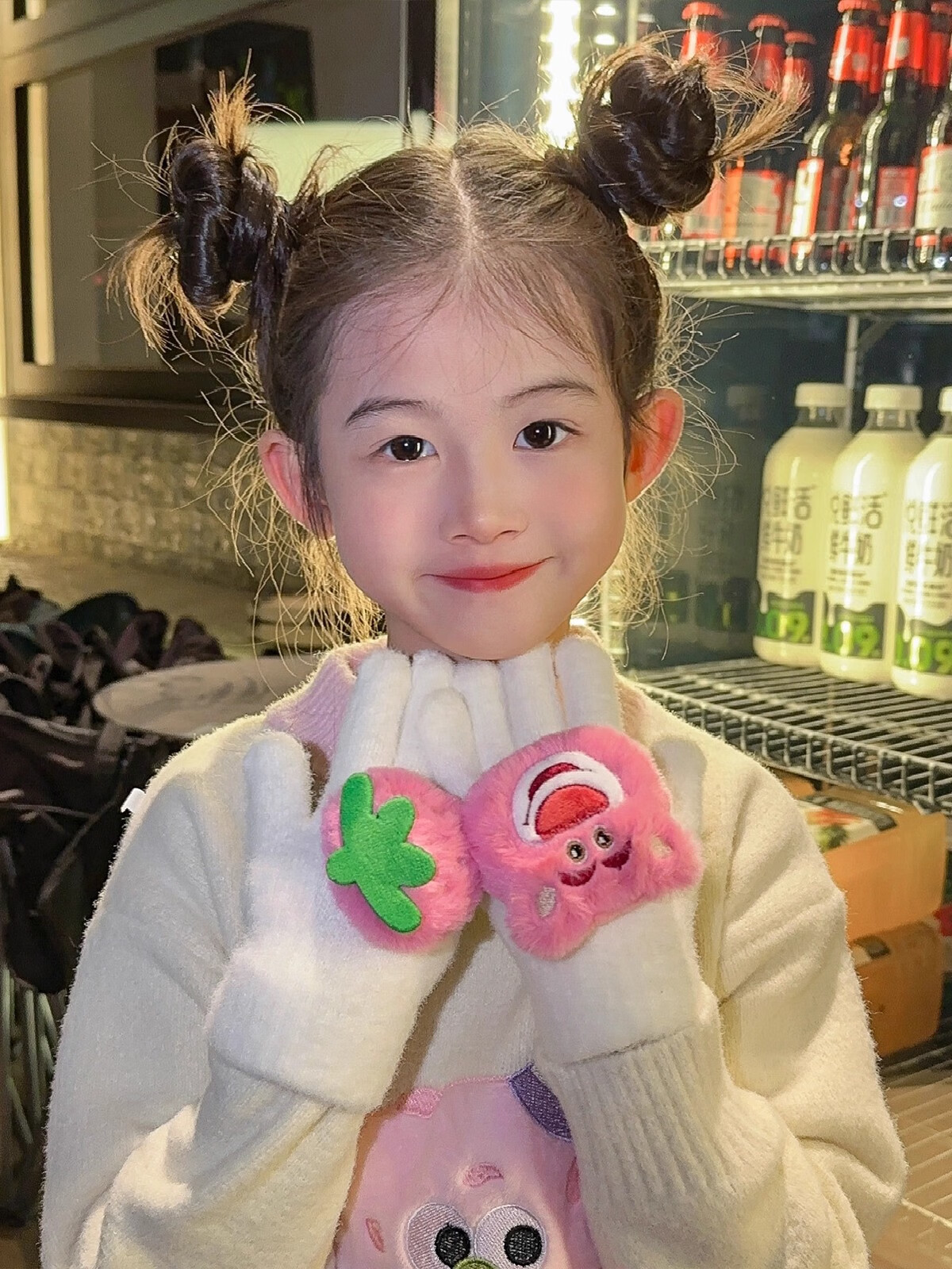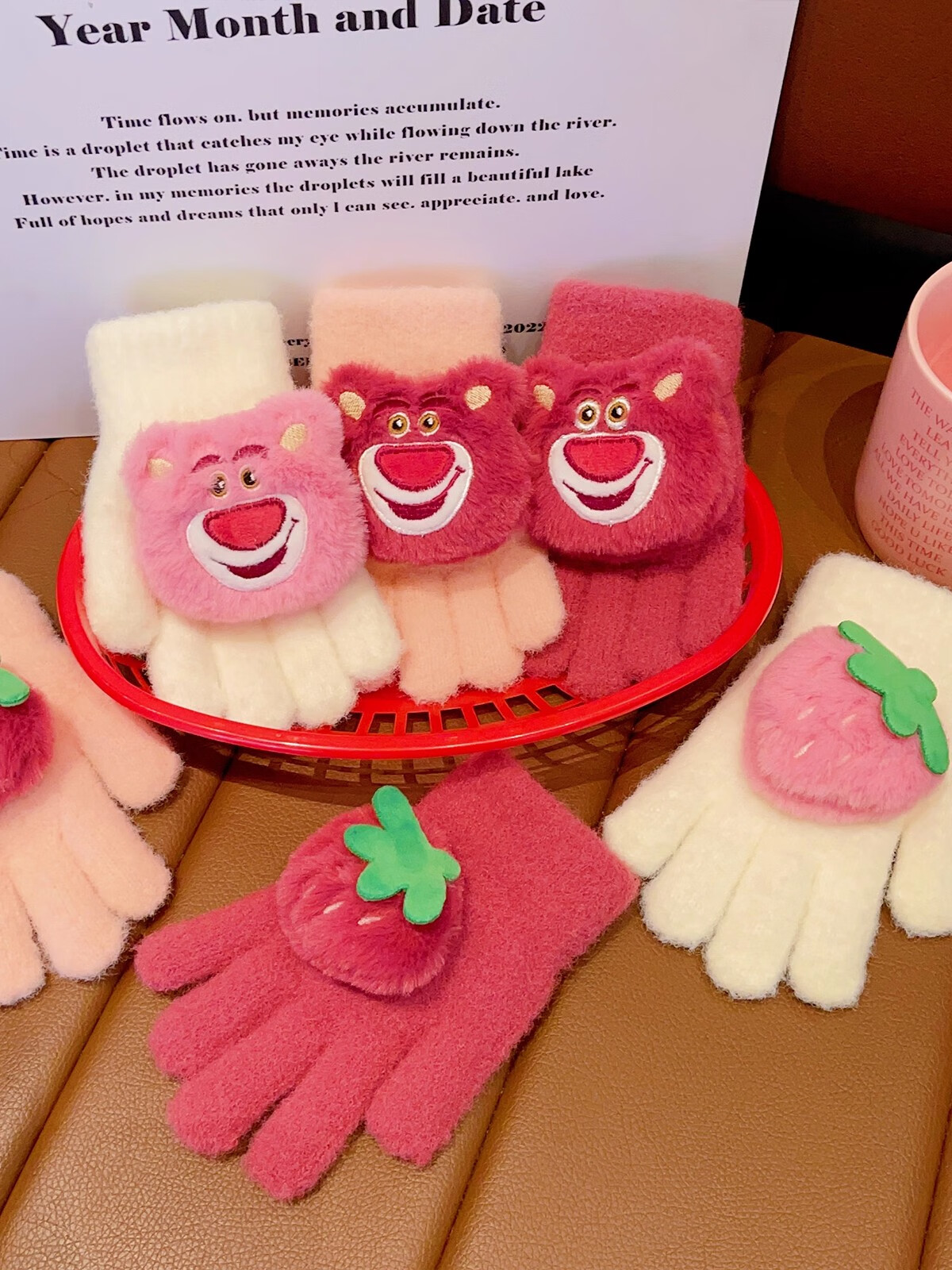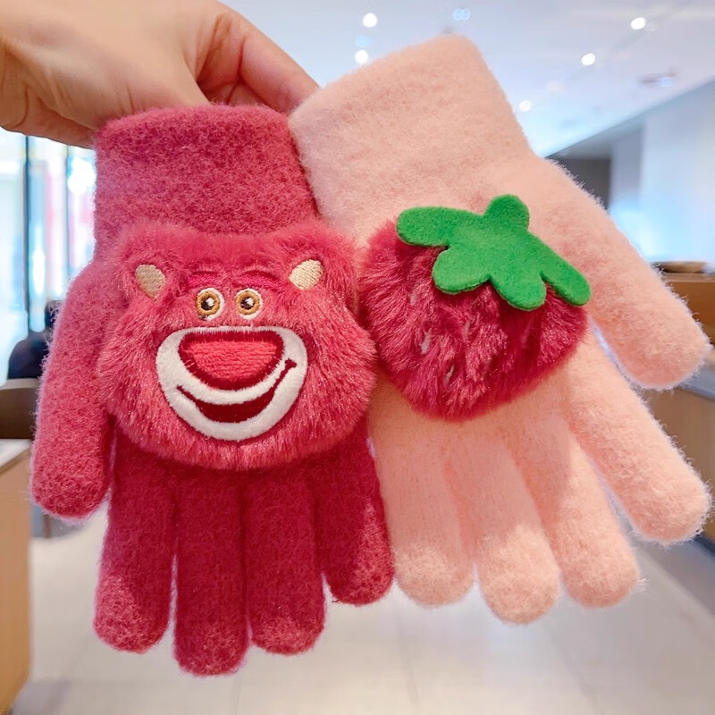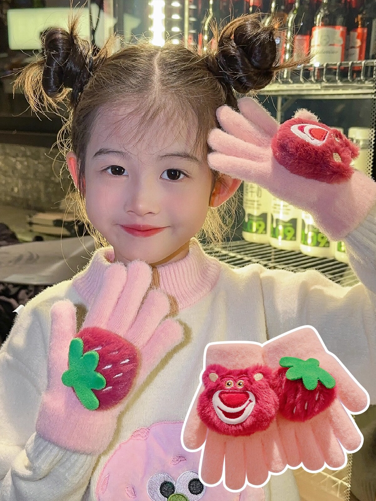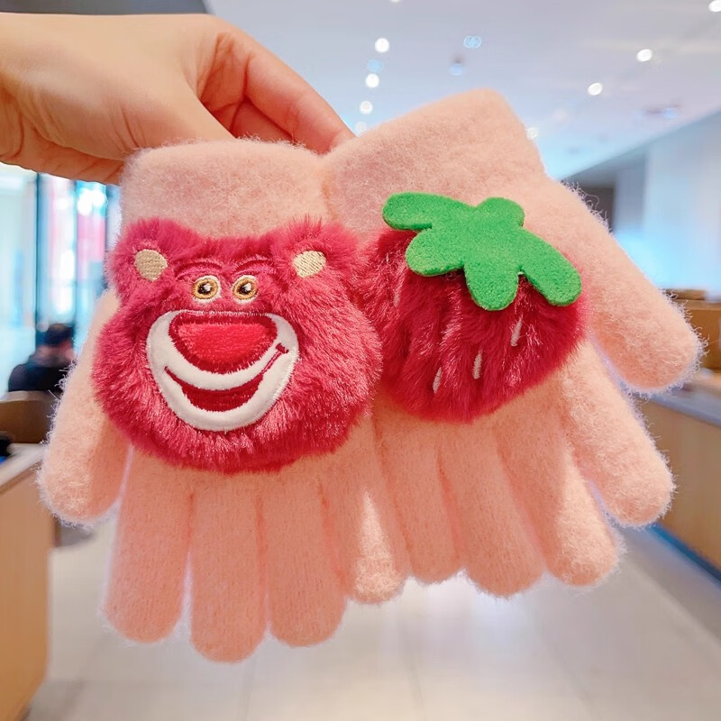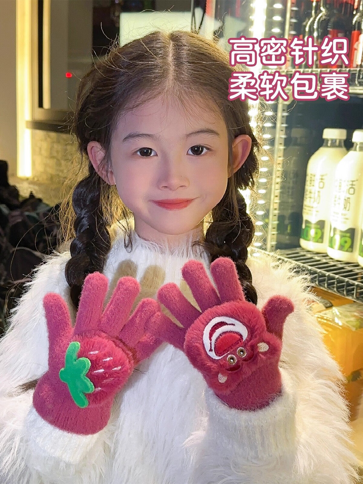 草莓熊儿童手套冬季女童保暖五指套防寒可爱小女孩宝宝加绒分指套 草莓熊玫红色【6-12岁】 正版授权 1双 请参考名称后的推荐年龄