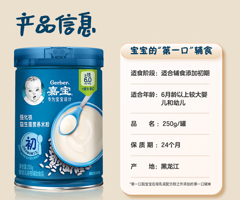 嘉宝(GERBER)婴幼儿高铁米粉维C加铁原味宝宝辅食米糊250g6-12个月 100%真验厂
