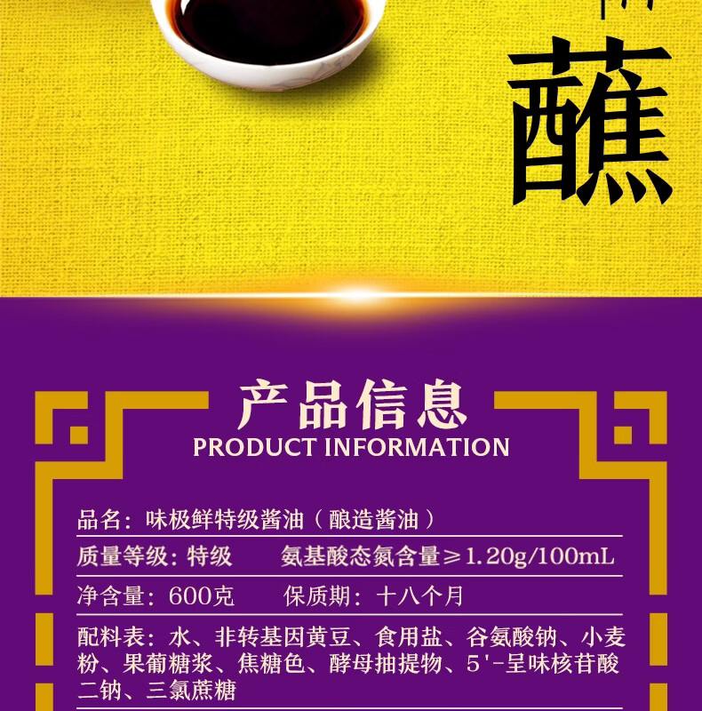 李锦记 味极鲜系列 味极鲜特级酱油600g【特级】0添加防腐剂 高鲜生抽