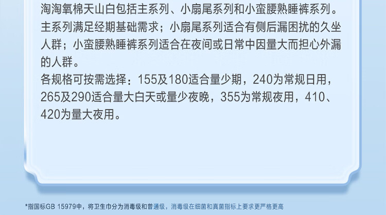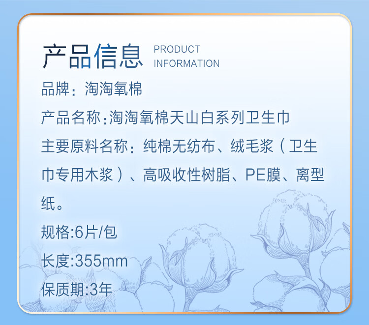 淘淘氧棉屈臣氏 淘淘氧棉天山白系列超长夜用卫生巾 棉柔 355mm 6片 消毒级
