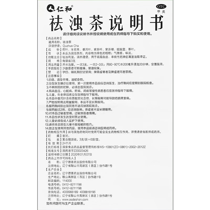 [仁和]祛浊茶 3g*6袋 1盒装 祛浊利湿清热通便用于高脂血症单纯性肥胖症属湿浊阻滞证