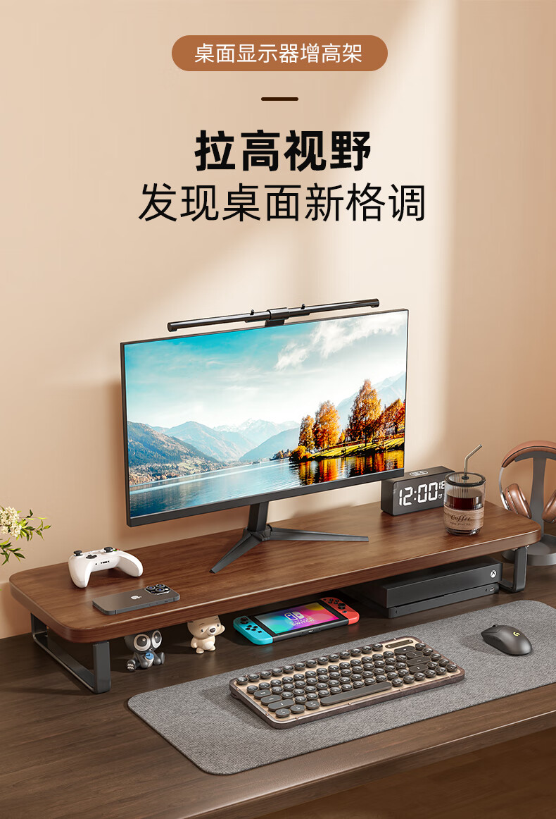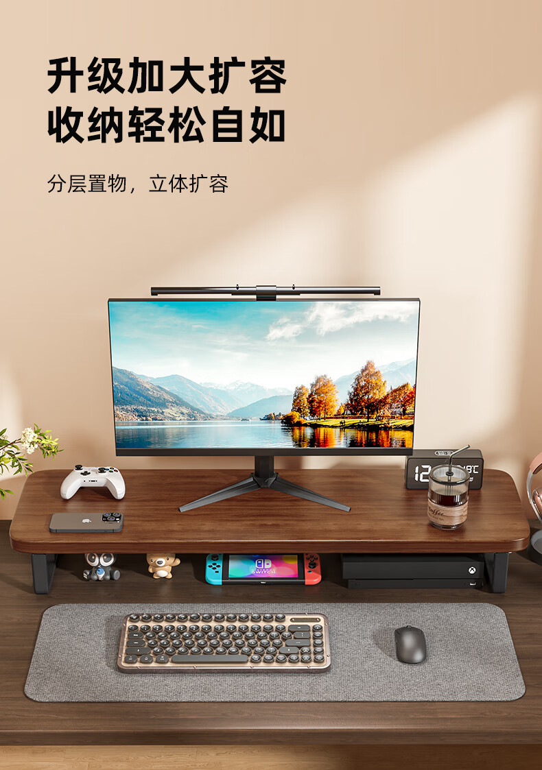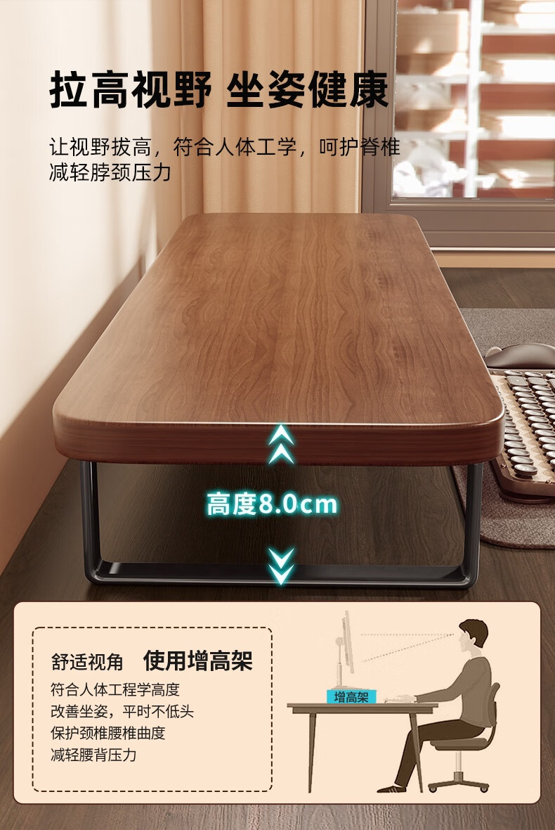 馨婺家台式电脑增高架显示器屏幕底座托架笔记本支架办公桌面收纳置物架 胡桃棕-长60cm【坚固耐用】