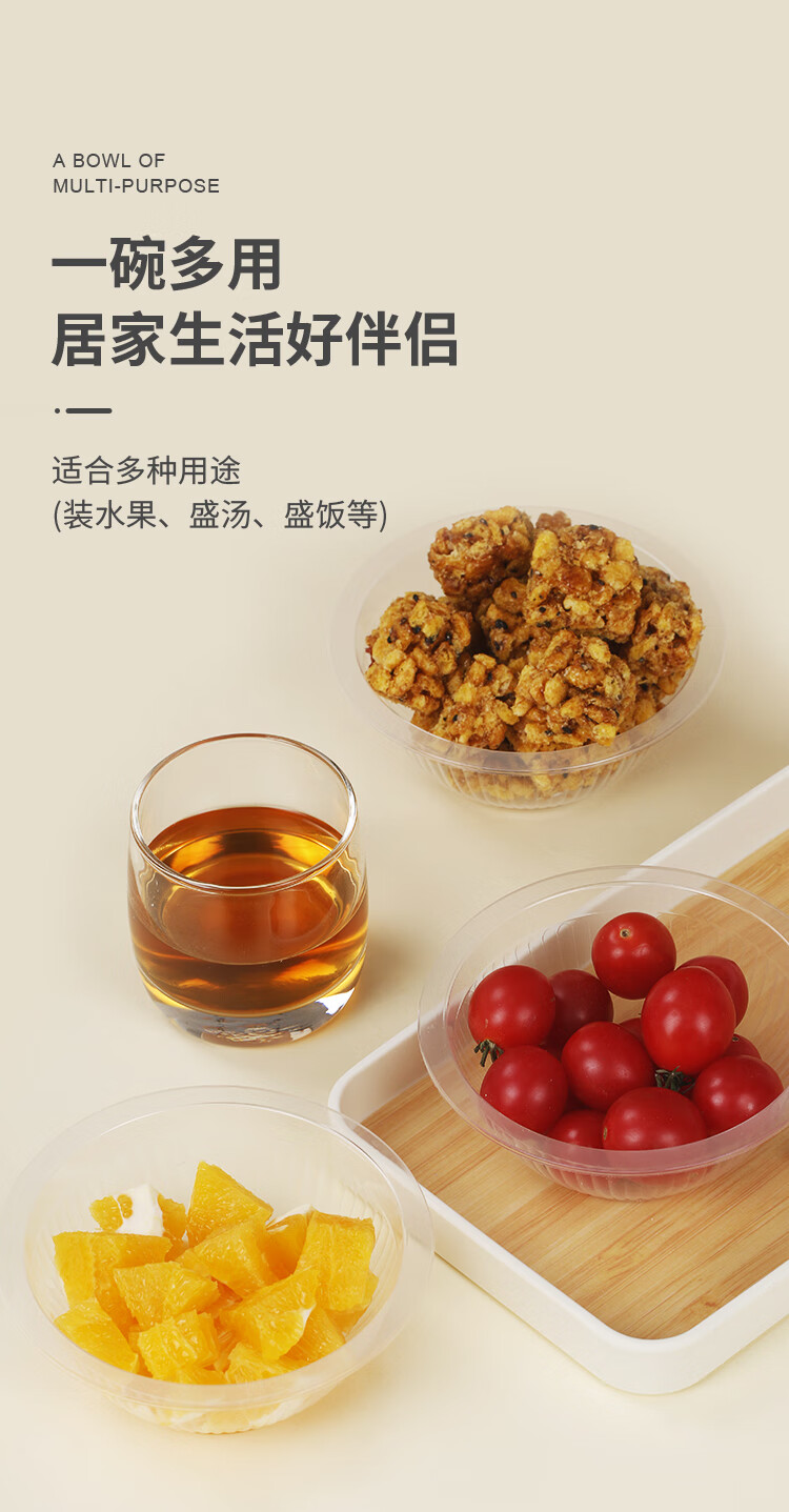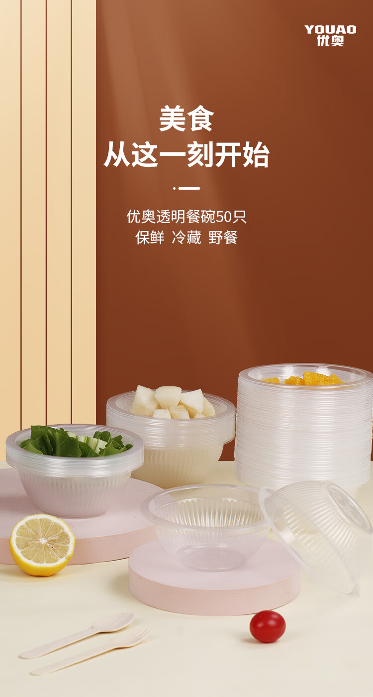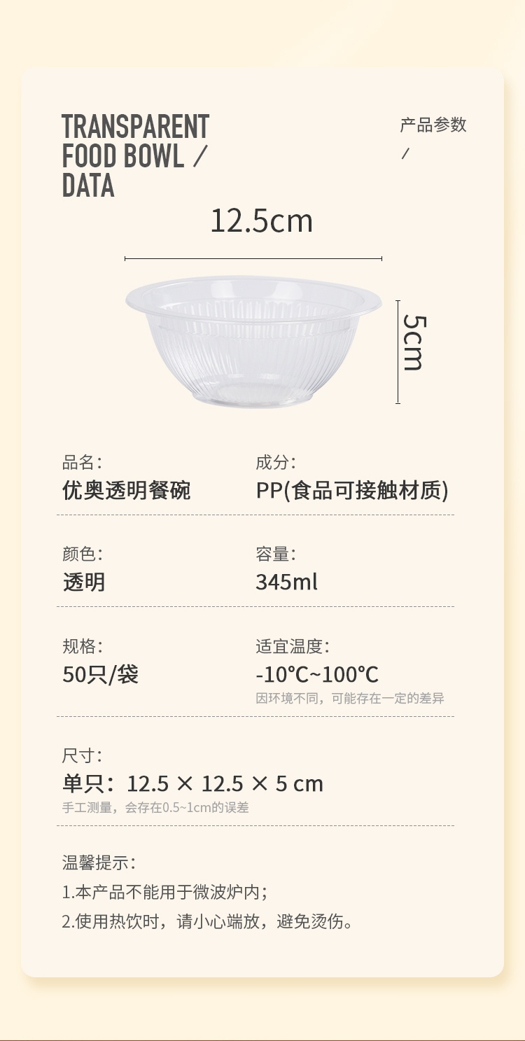优奥一次性碗345ml*50只加厚透明饺子汤圆汤碗户外野餐露营餐具免洗