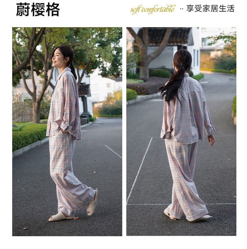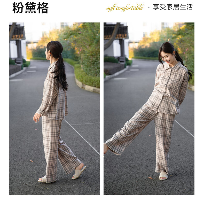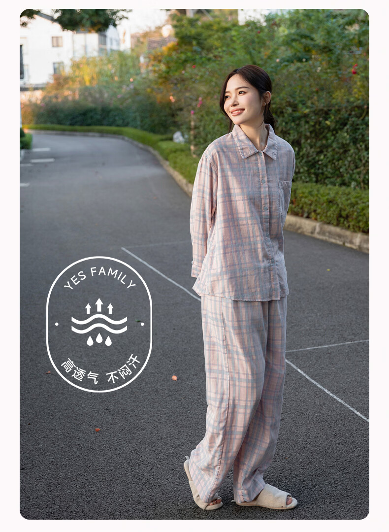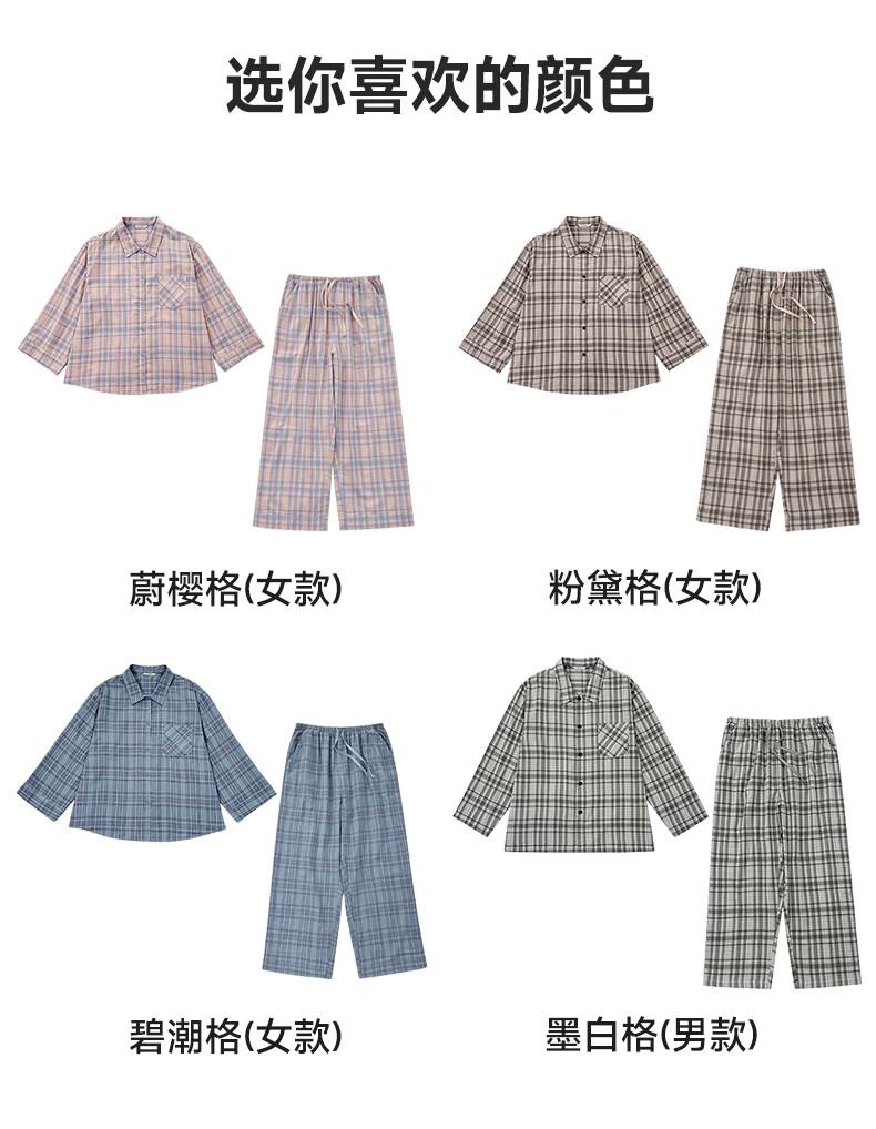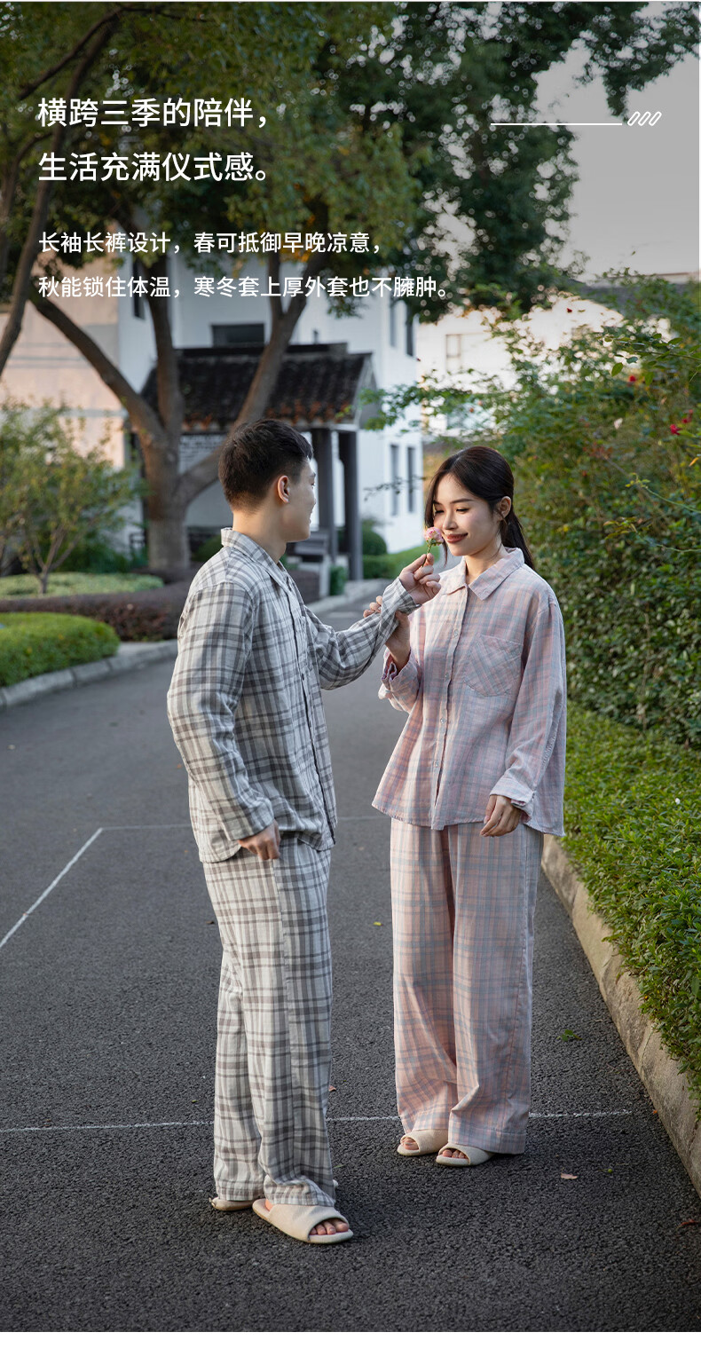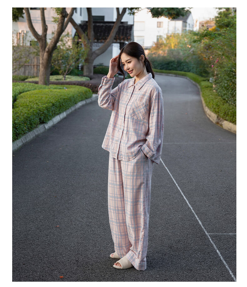 宜色家纯棉睡衣家居服 双层纱翻领长袖格纹情侣家居服A类透气睡衣英伦风 女款-粉黛格 小英伦·里约书店 L (女115-135斤/男145-165斤)