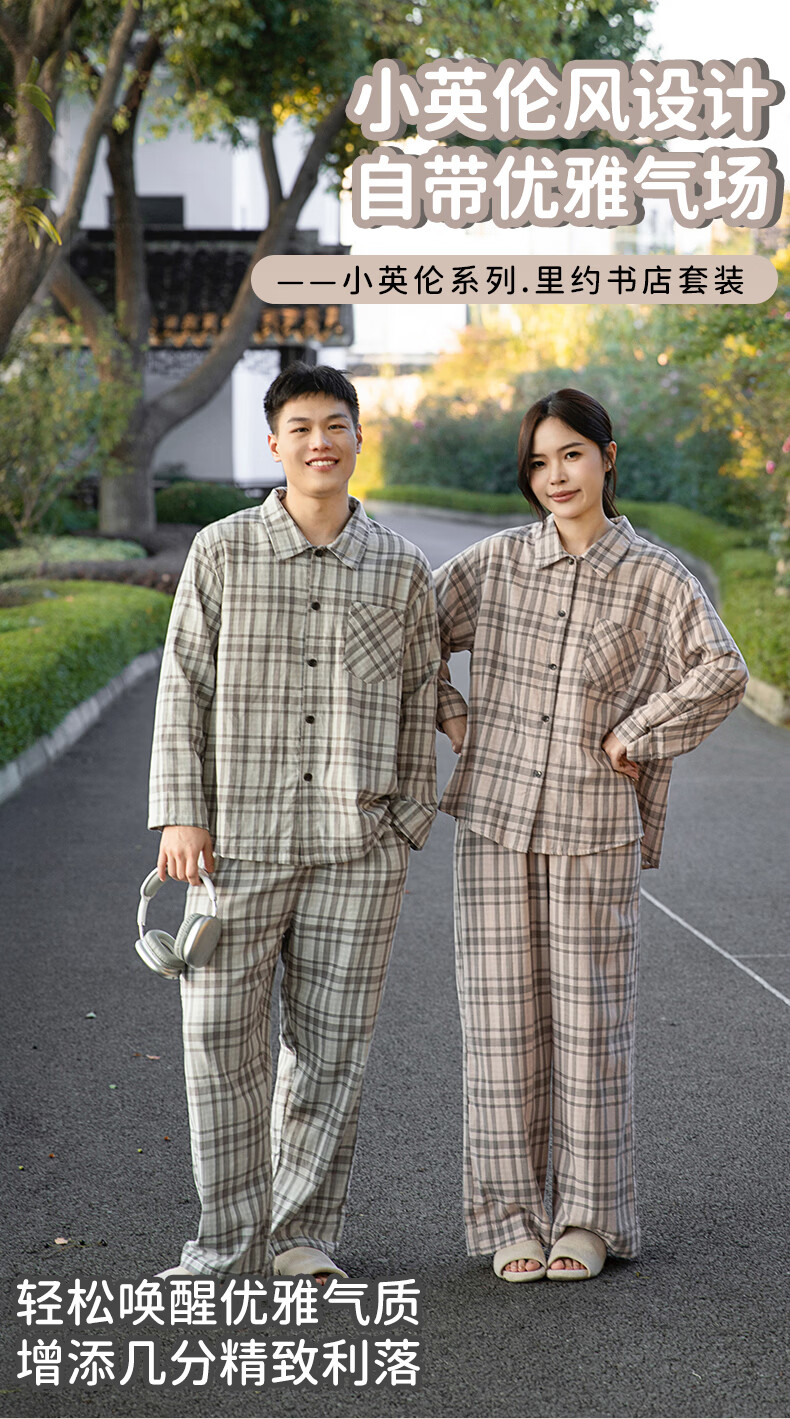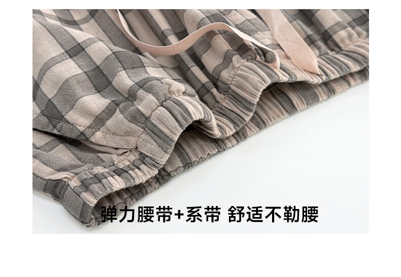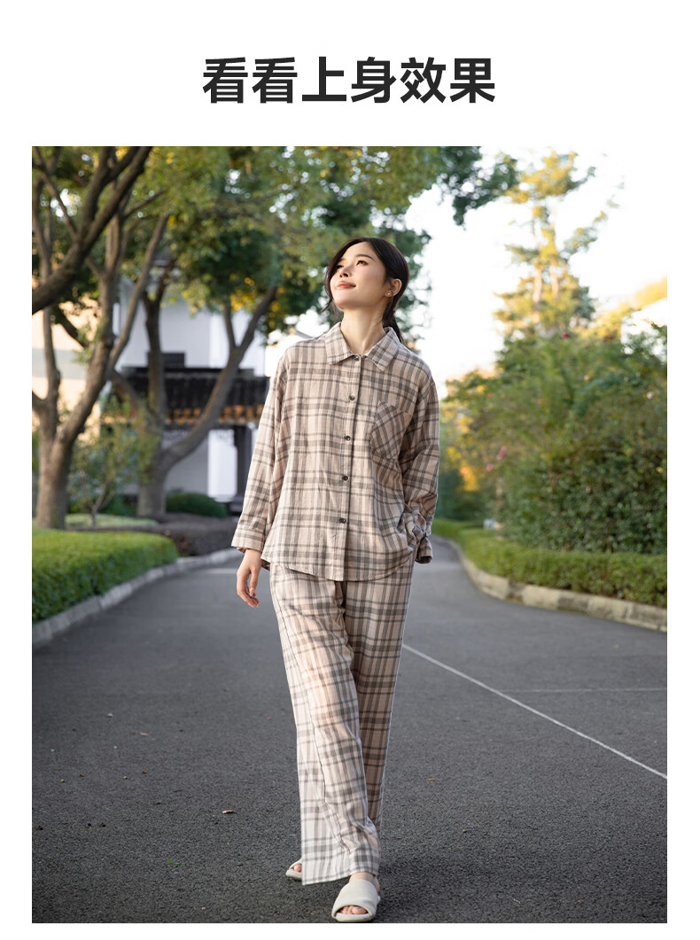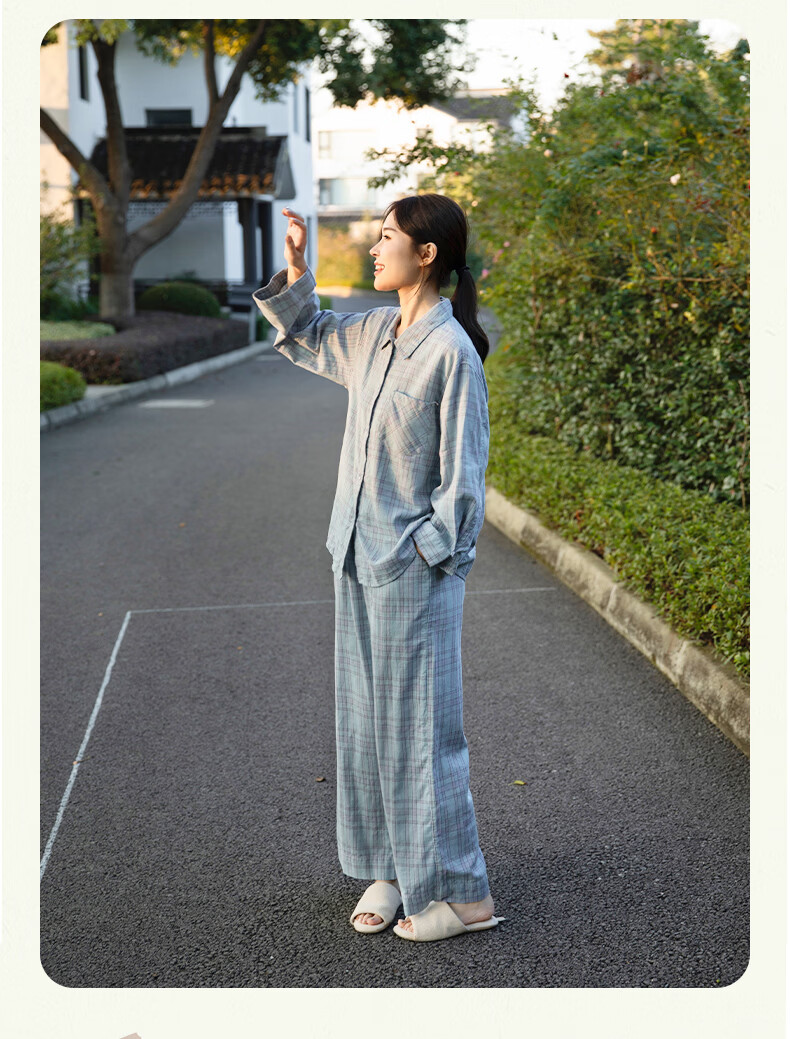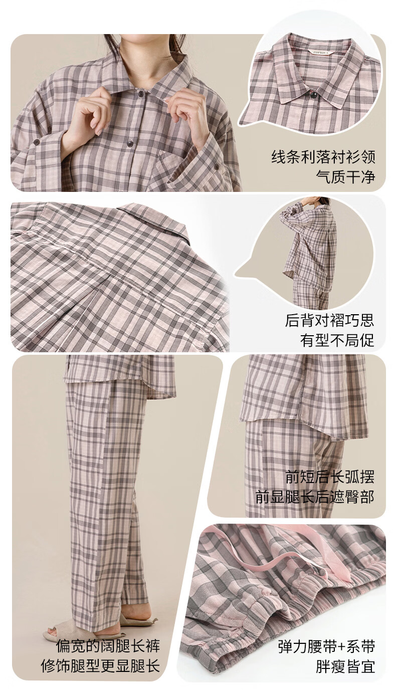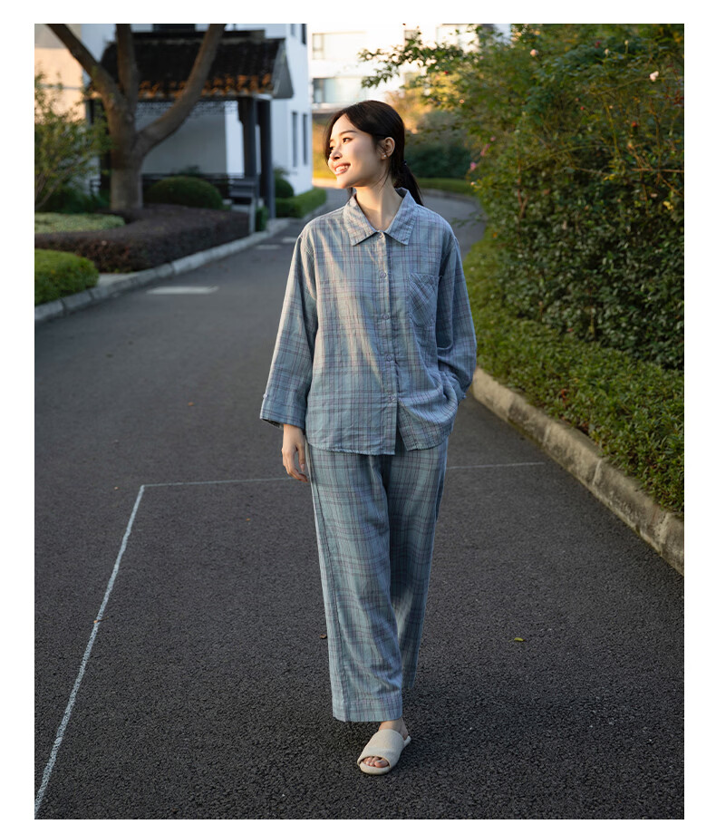 宜色家纯棉睡衣家居服 双层纱翻领长袖格纹情侣家居服A类透气睡衣英伦风 女款-粉黛格 小英伦·里约书店 L (女115-135斤/男145-165斤)