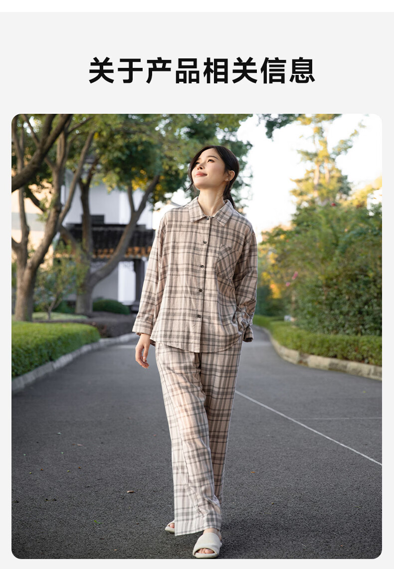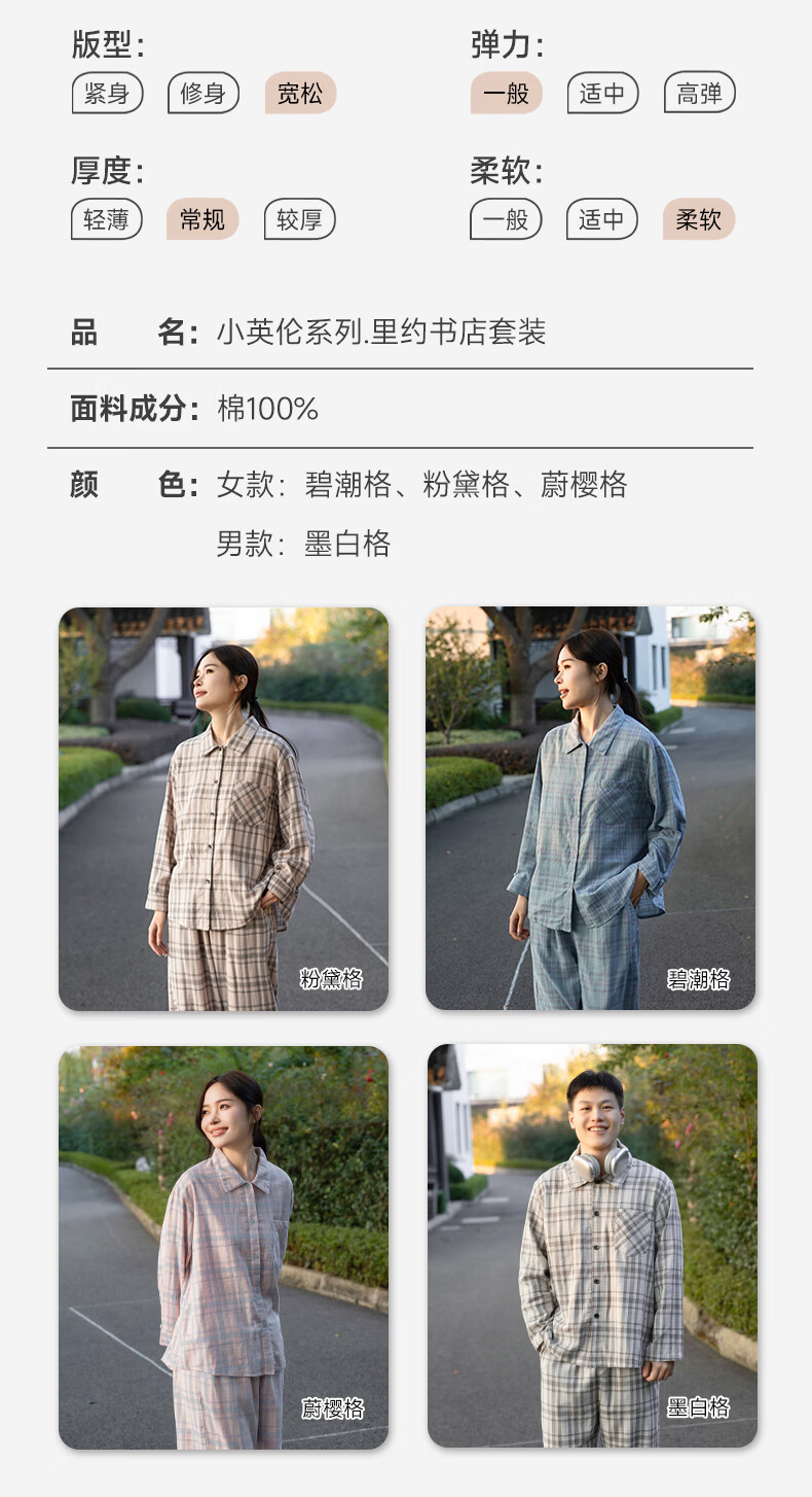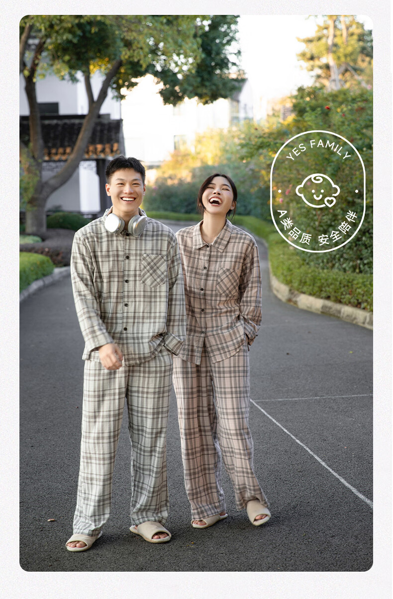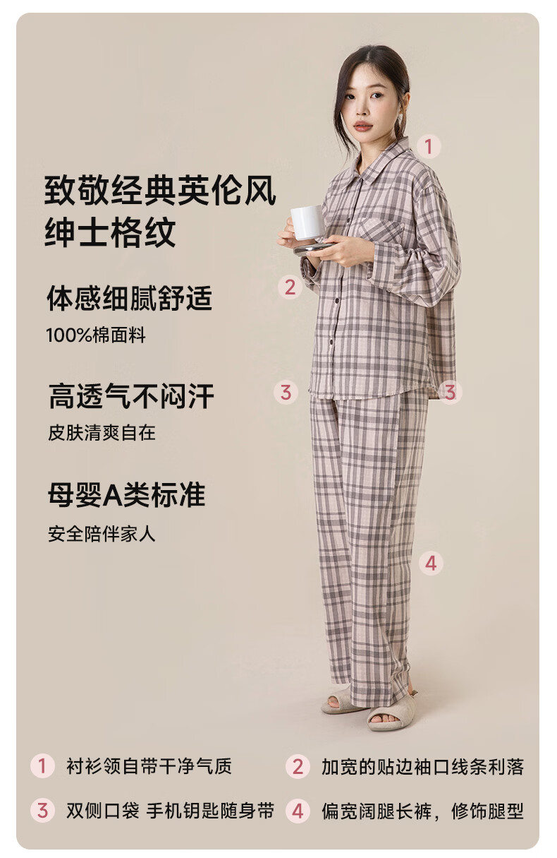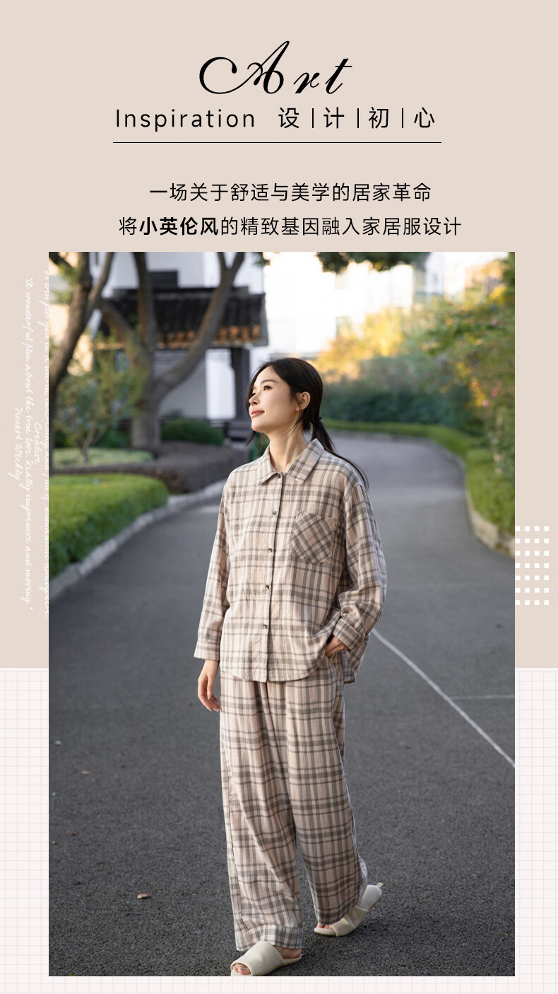 宜色家纯棉睡衣家居服 双层纱翻领长袖格纹情侣家居服A类透气睡衣英伦风 女款-粉黛格 小英伦·里约书店 L (女115-135斤/男145-165斤)