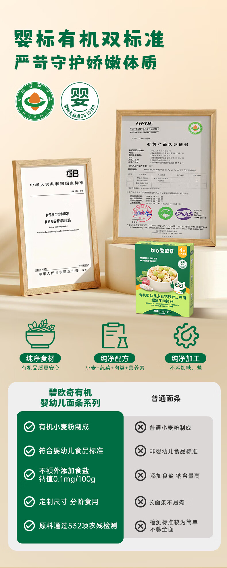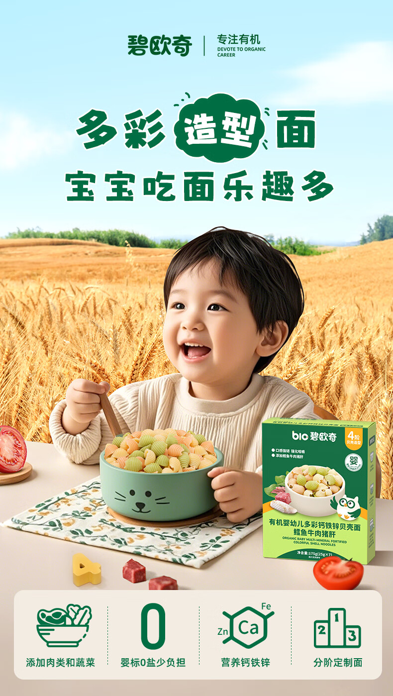 碧欧奇有机婴幼儿多彩钙铁锌贝壳面鳕鱼牛肉猪肝味175g宝宝面条挂面辅食