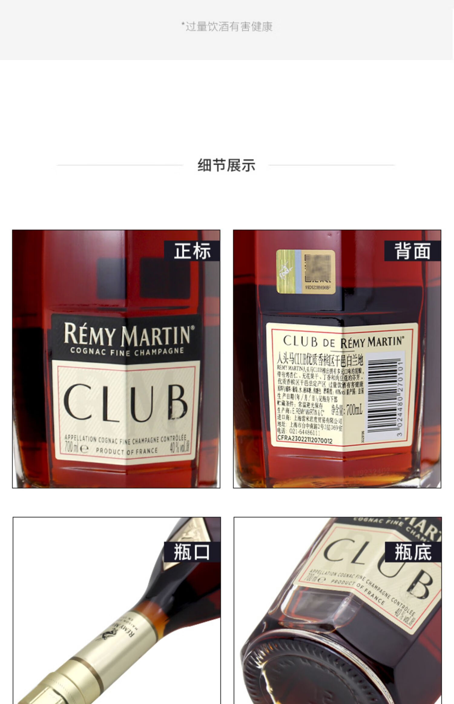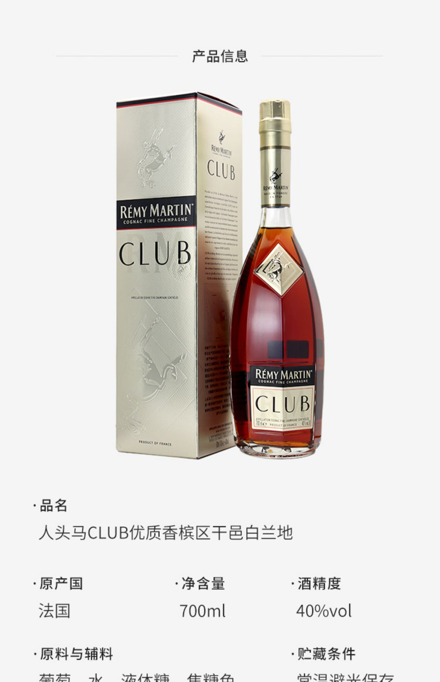 人头马CLUB优质香槟区干邑白兰地700ml法国原装进口洋酒烈酒 人头马特级CLUB干邑700ml