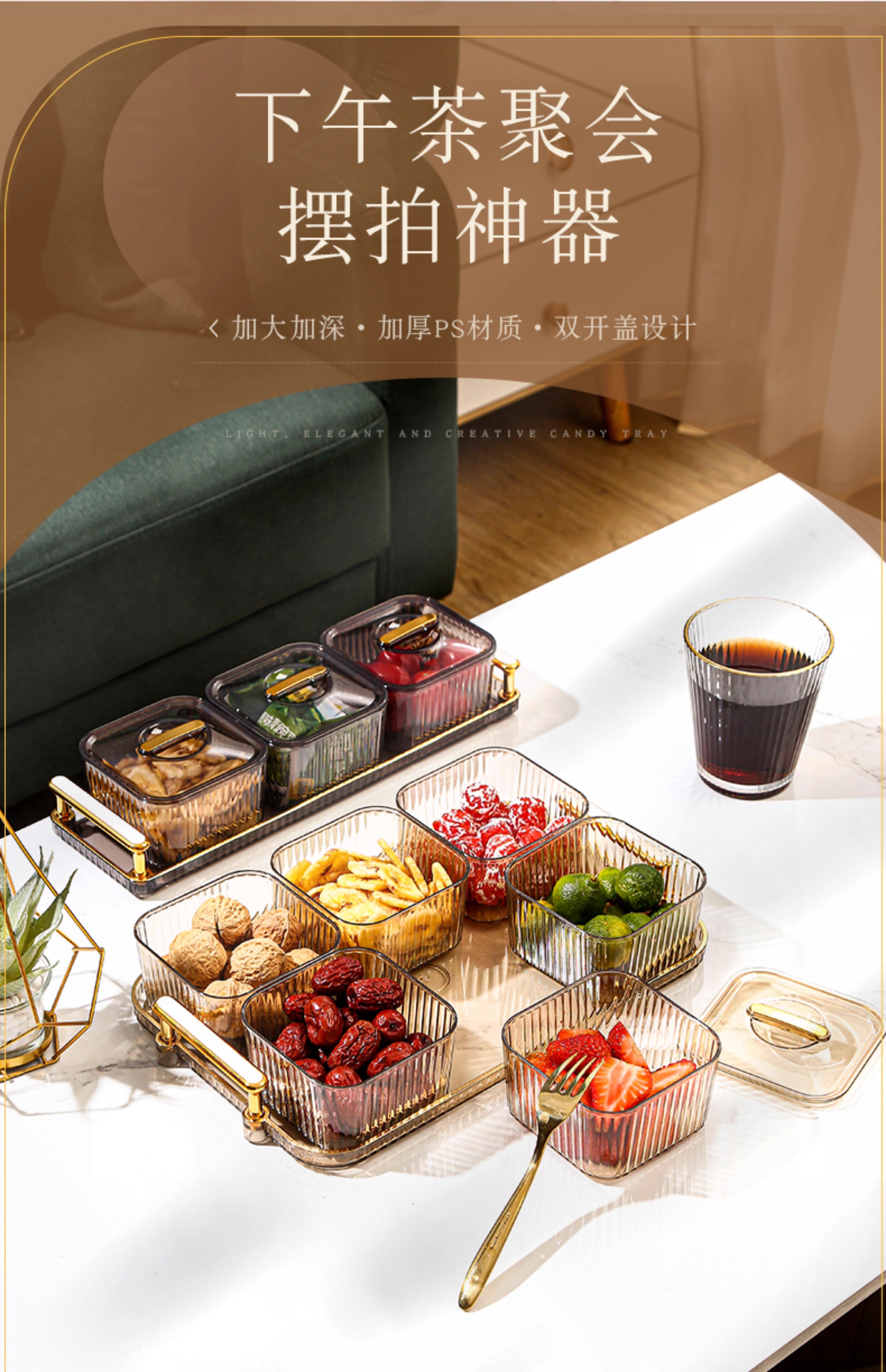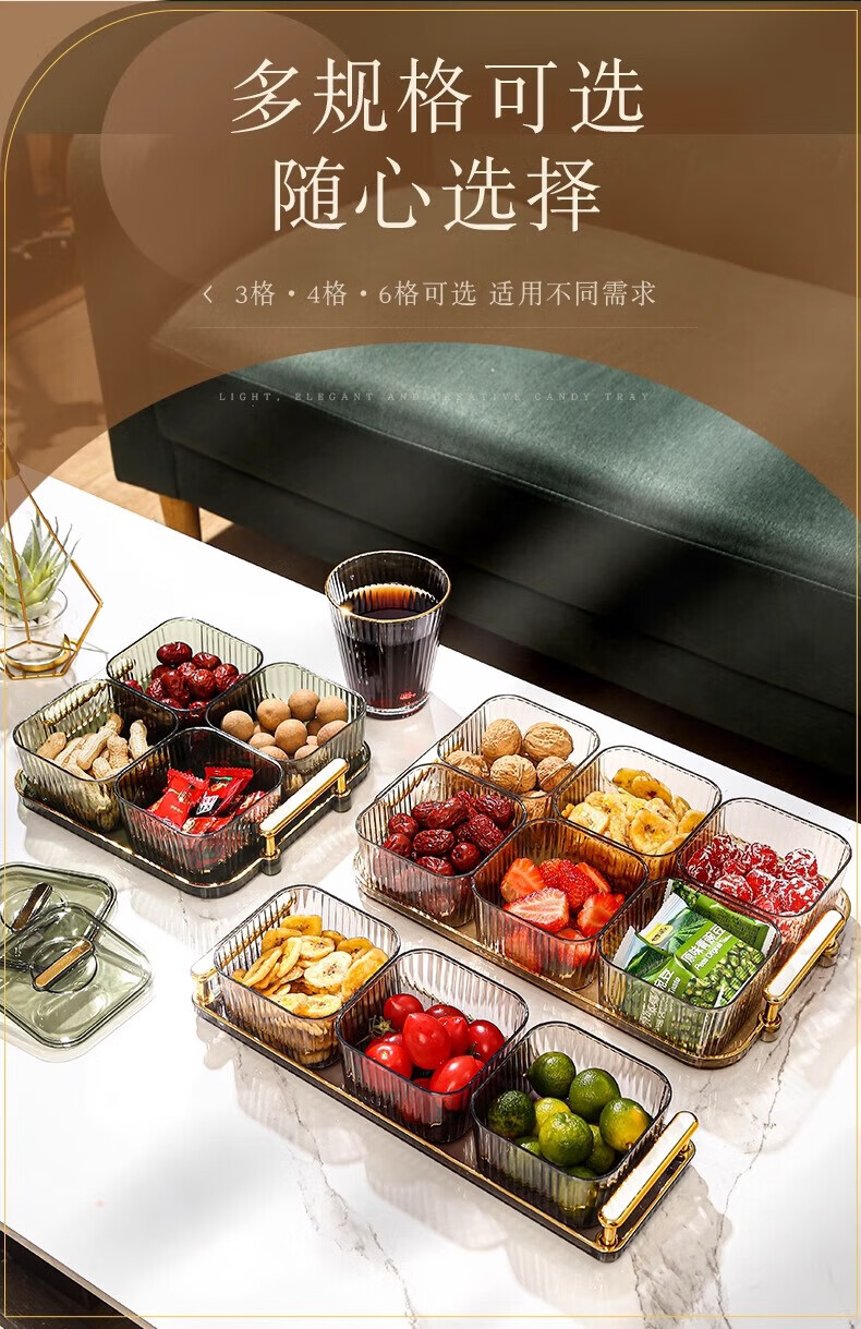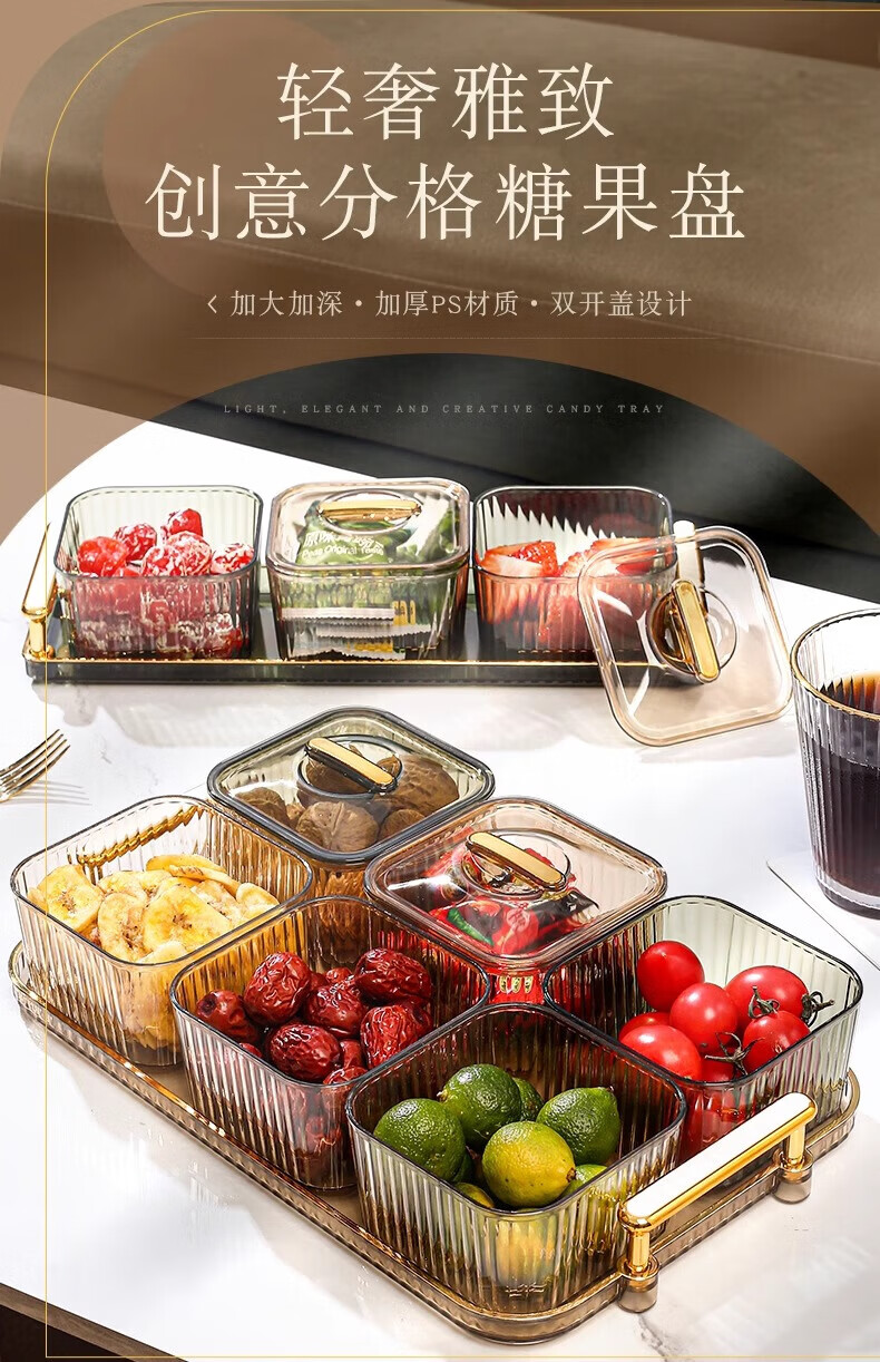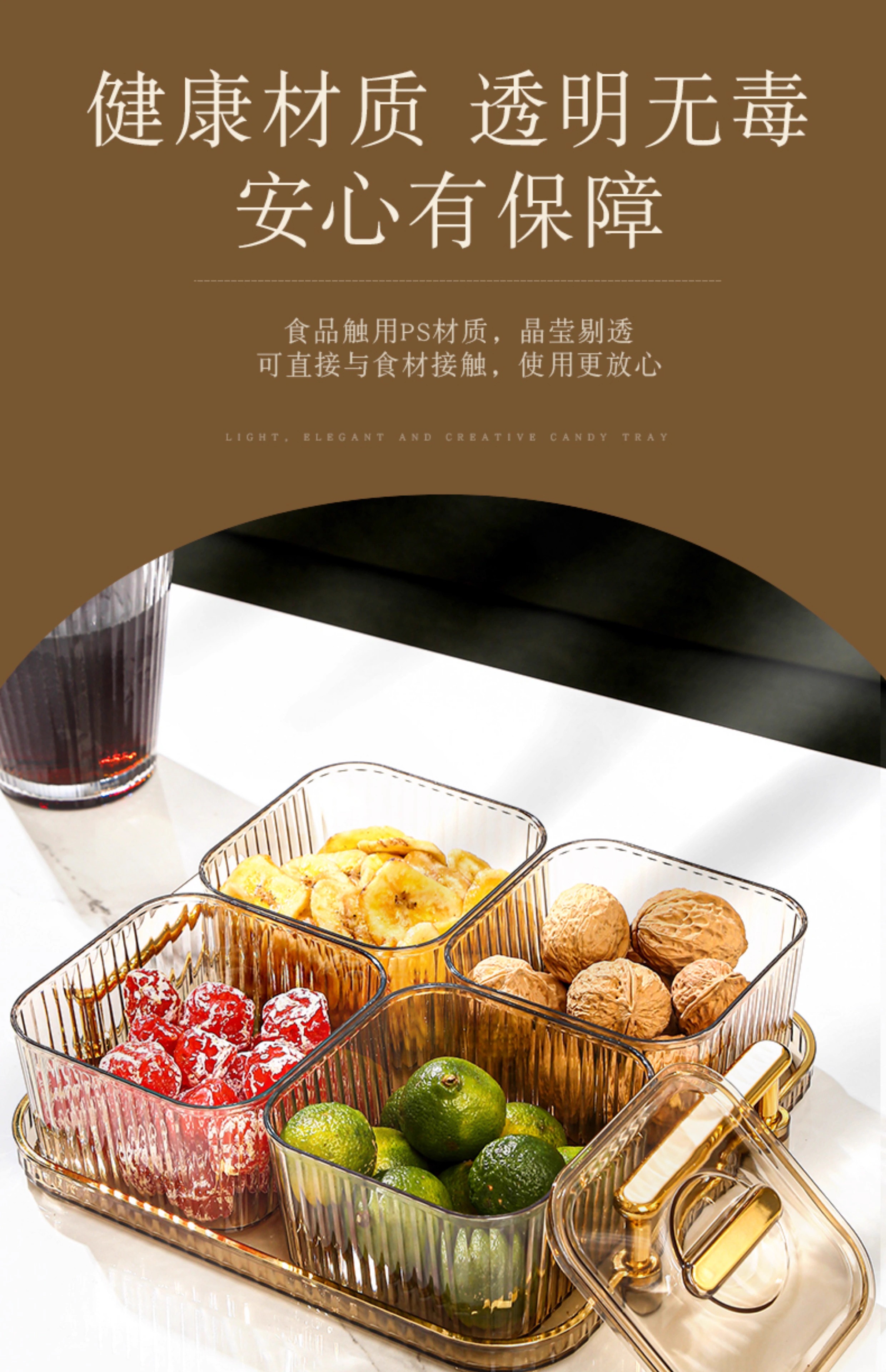 馨婺家四宫格干果盘轻奢水果盘家用客厅茶几零食坚果收纳盒子糖果摆放盘 琥珀金-带托盘【3格带盖】