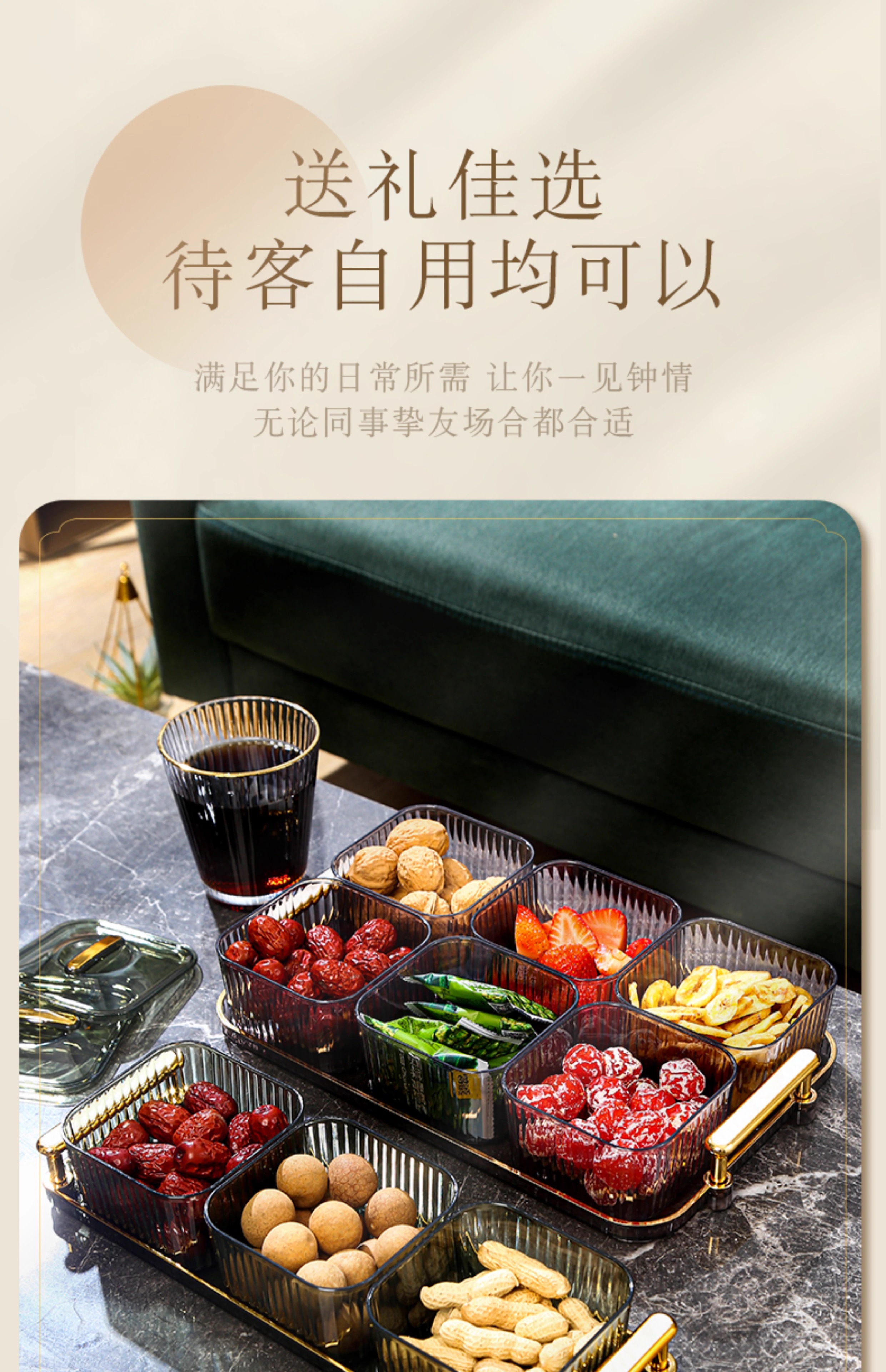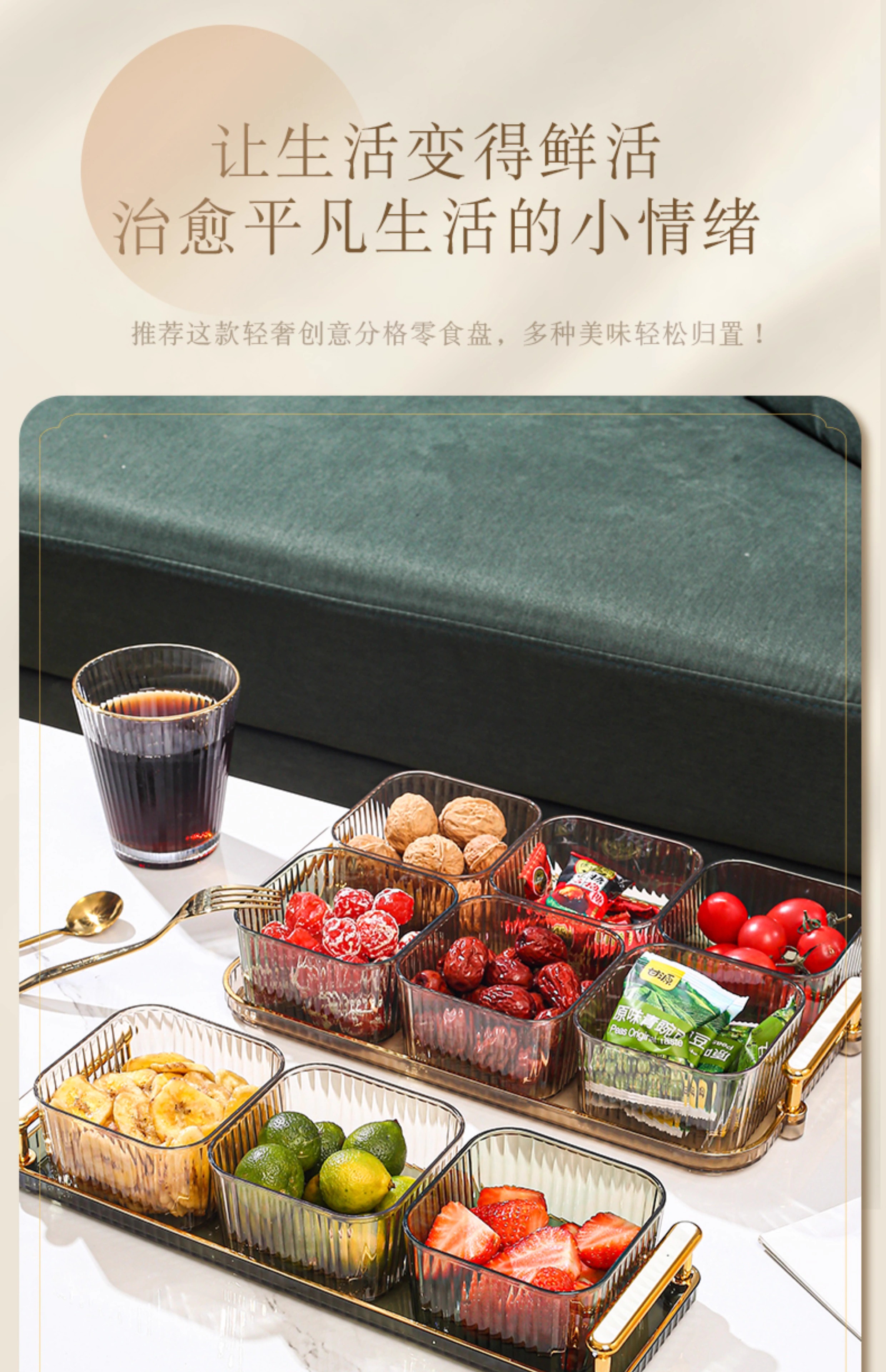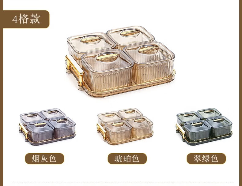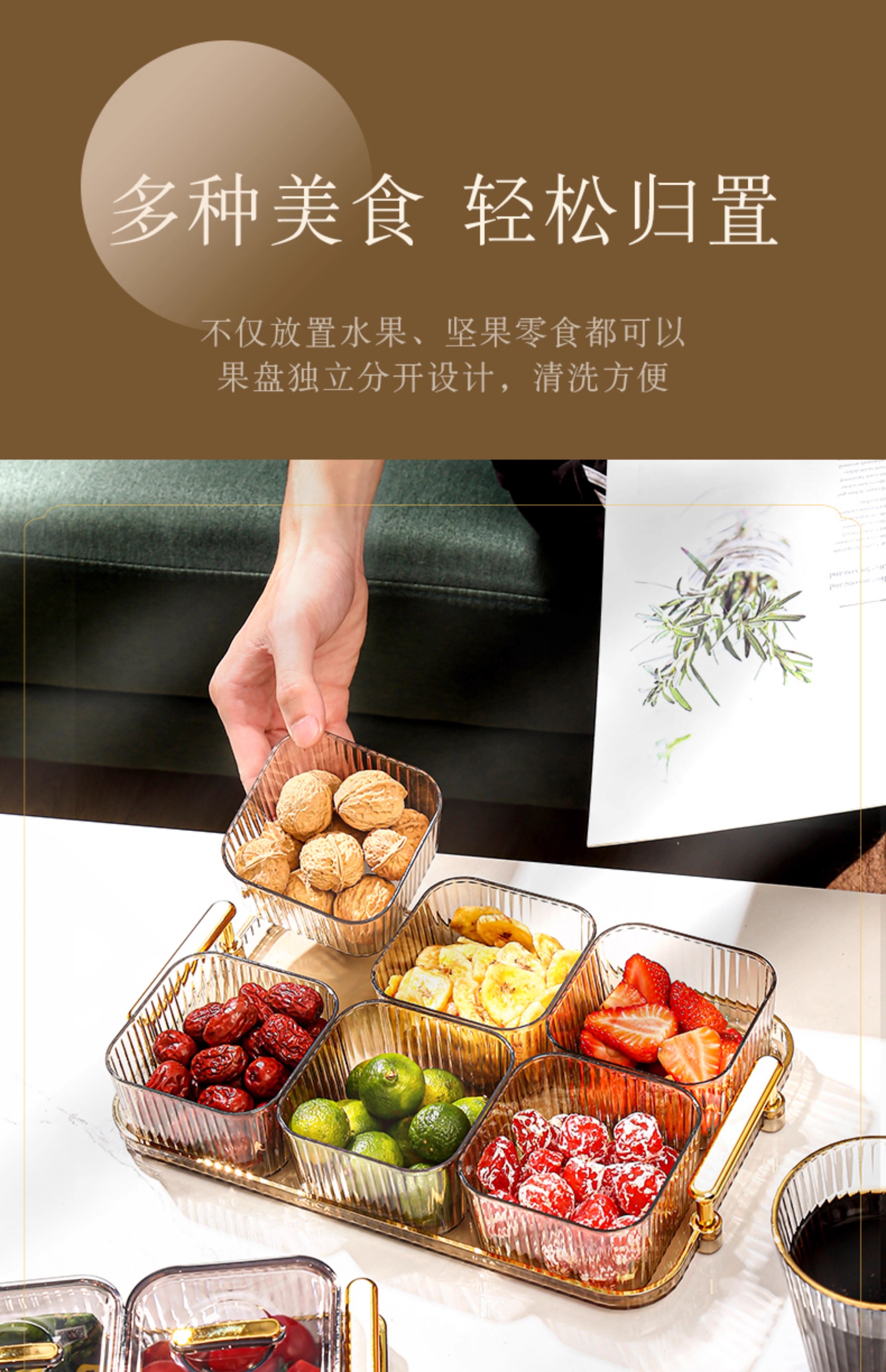 馨婺家四宫格干果盘轻奢水果盘家用客厅茶几零食坚果收纳盒子糖果摆放盘 琥珀金-带托盘【3格带盖】