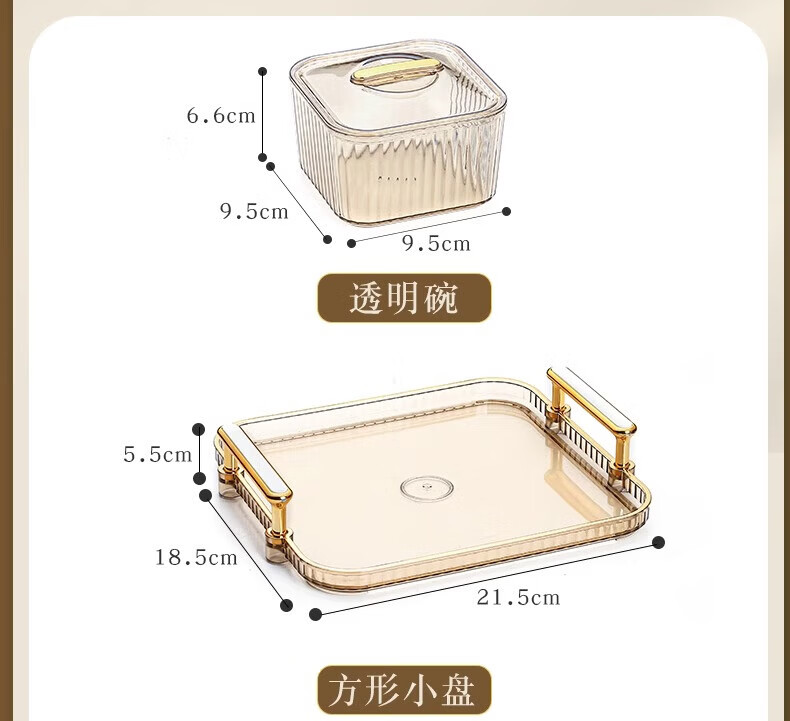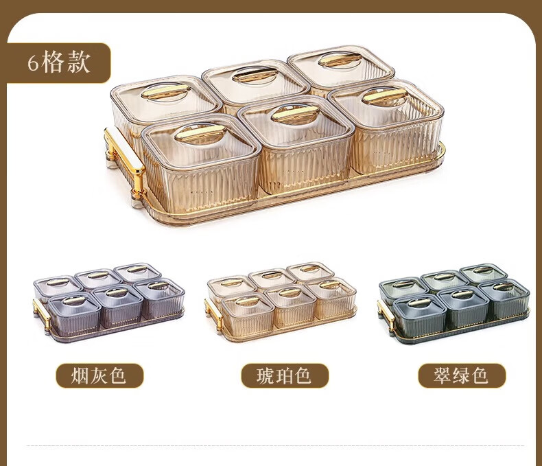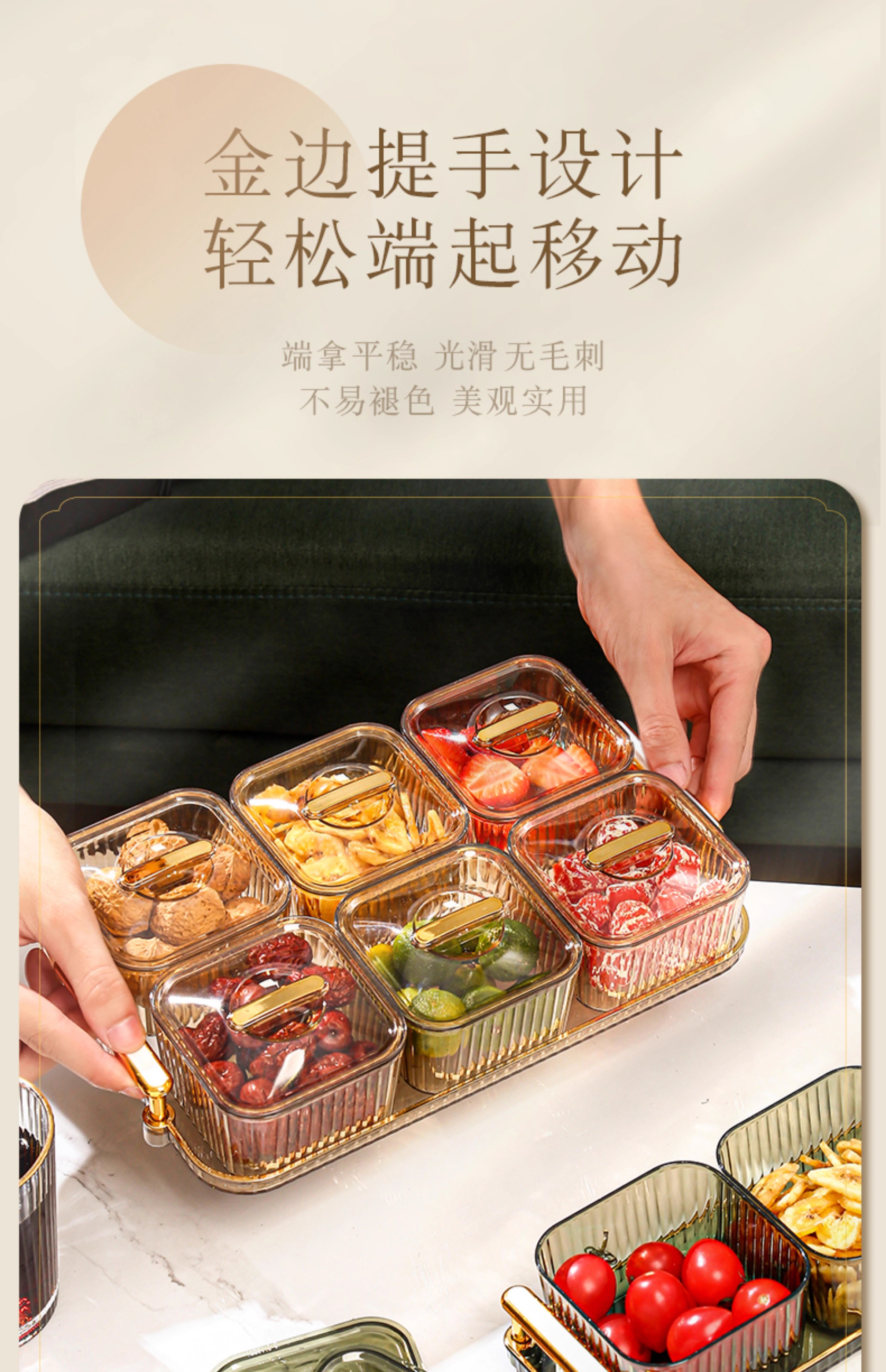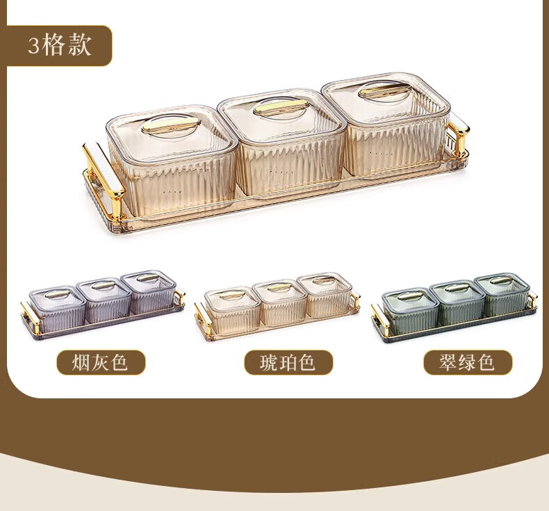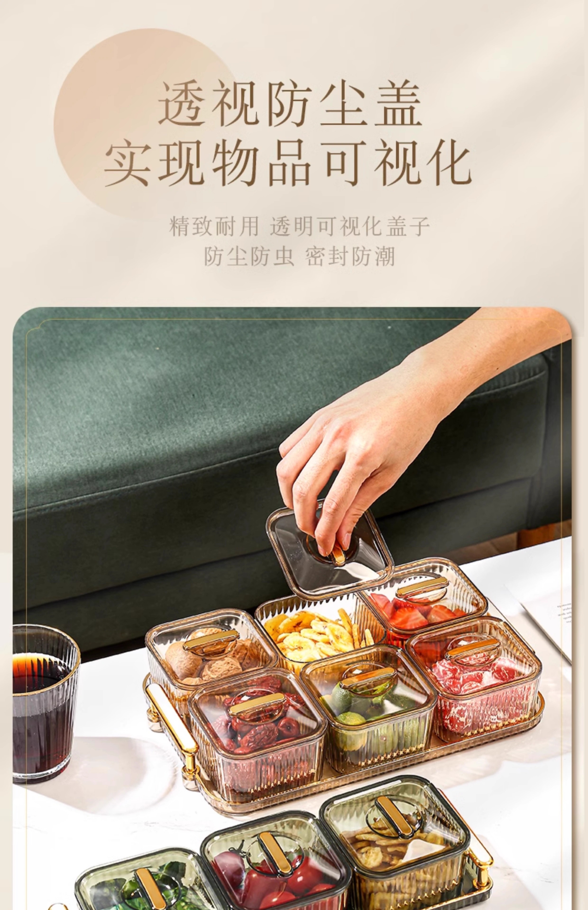 馨婺家四宫格干果盘轻奢水果盘家用客厅茶几零食坚果收纳盒子糖果摆放盘 琥珀金-带托盘【3格带盖】