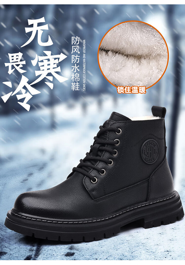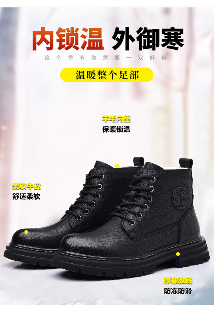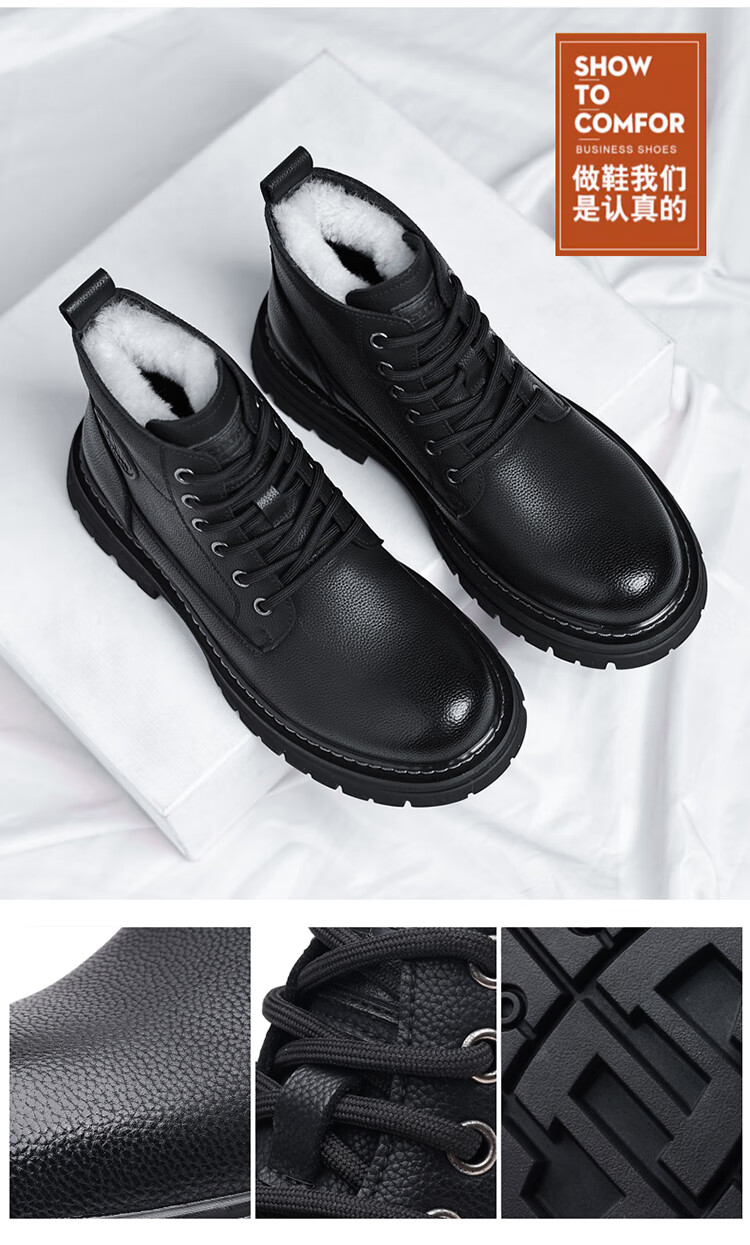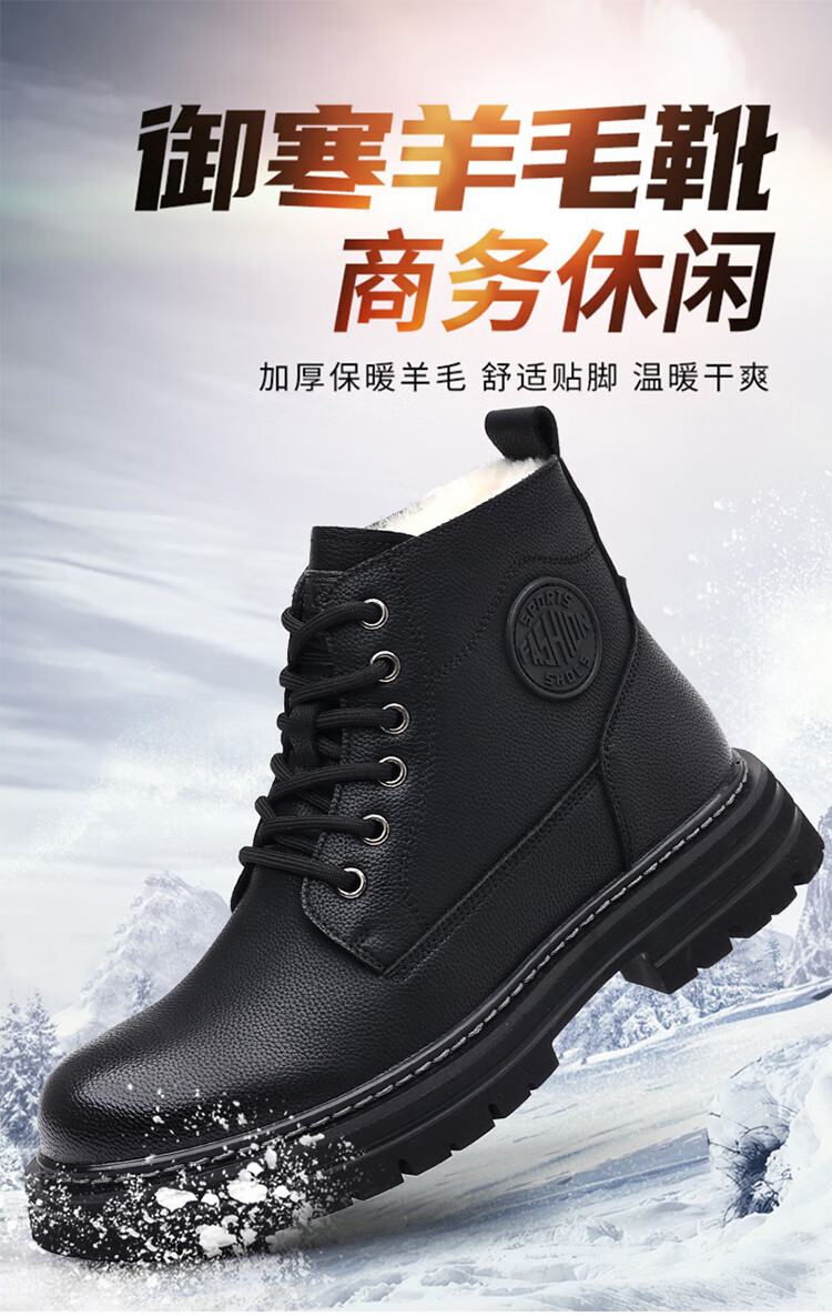 稻草人(MEXICAN)棉皮鞋男款冬季2026新款加绒加厚保暖高帮马丁靴真皮羊毛雪地靴 M22905黑色加绒 加厚羊毛 40