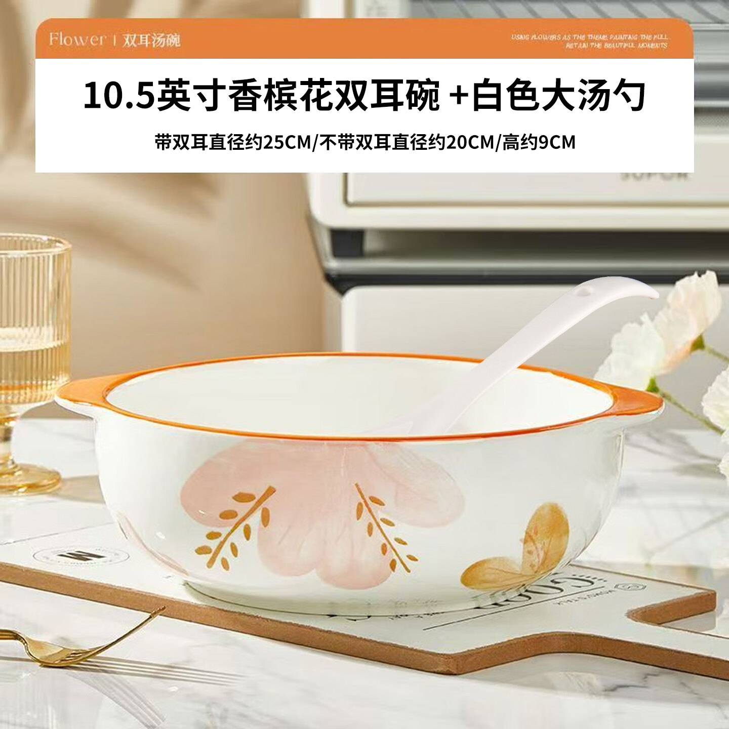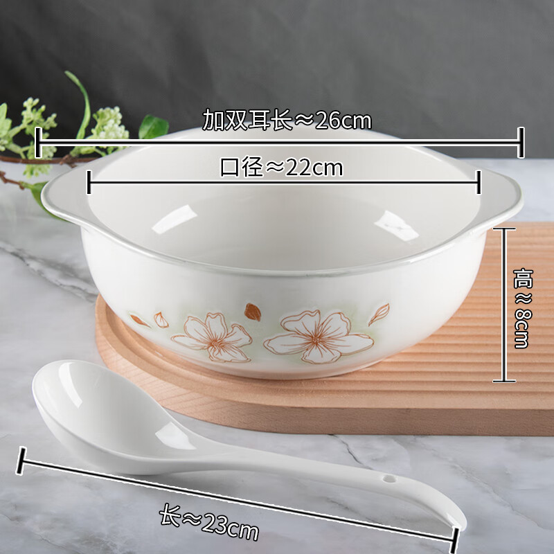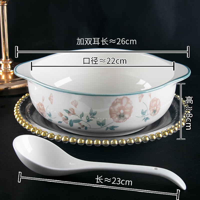 陶瓷双耳碗新款大号家用防烫釉下彩水煮鱼大菜盆好看汤碗配白汤勺 山茶花(9英寸) 2件套 双耳碗1个装+白汤勺1只