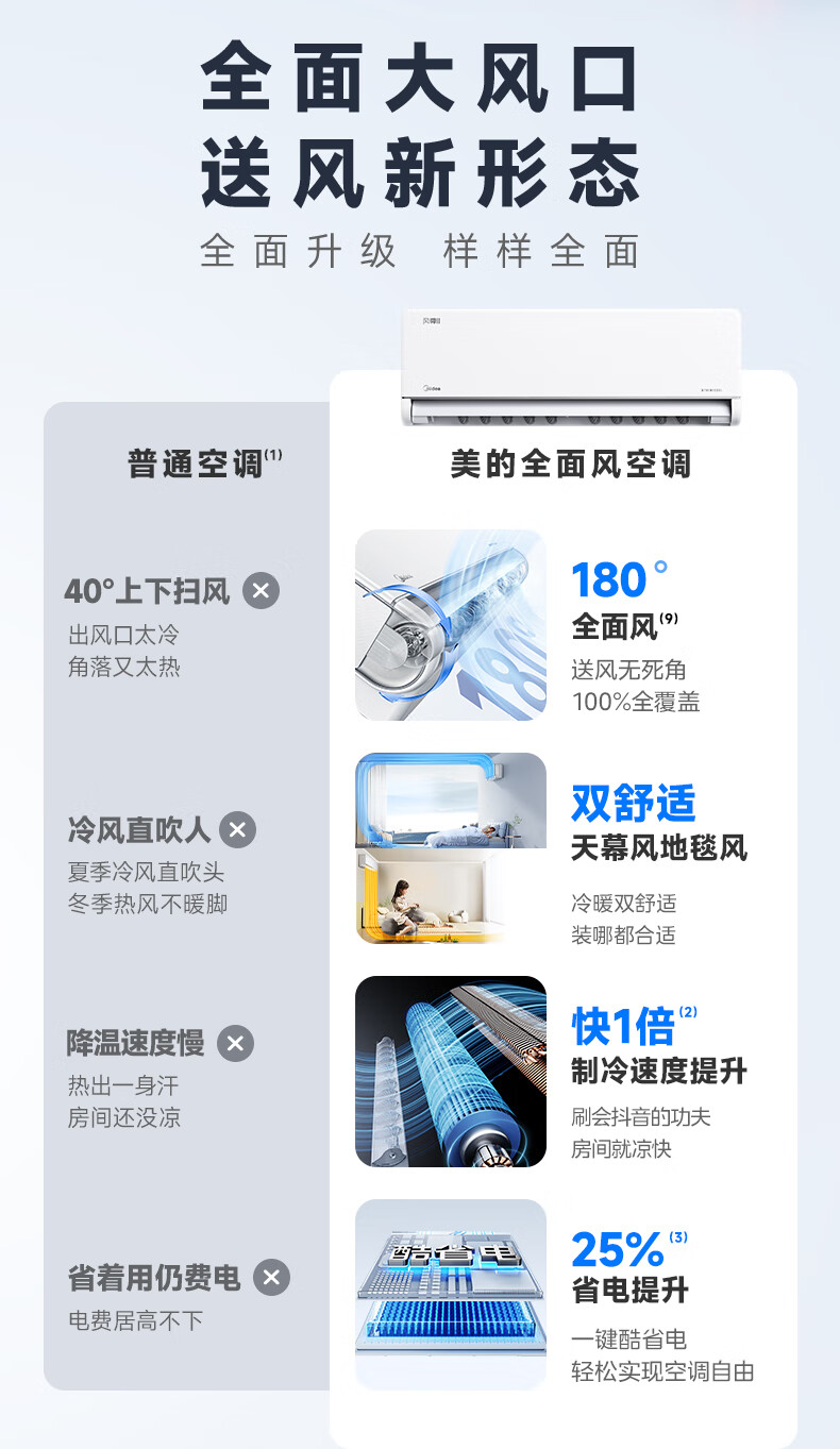 美的空调全面风 大1.5匹新一级能效变频风尊二代地毯制暖 纯铜管 卧室空调挂机 KFR-35GW/N8MXC1Ⅱ