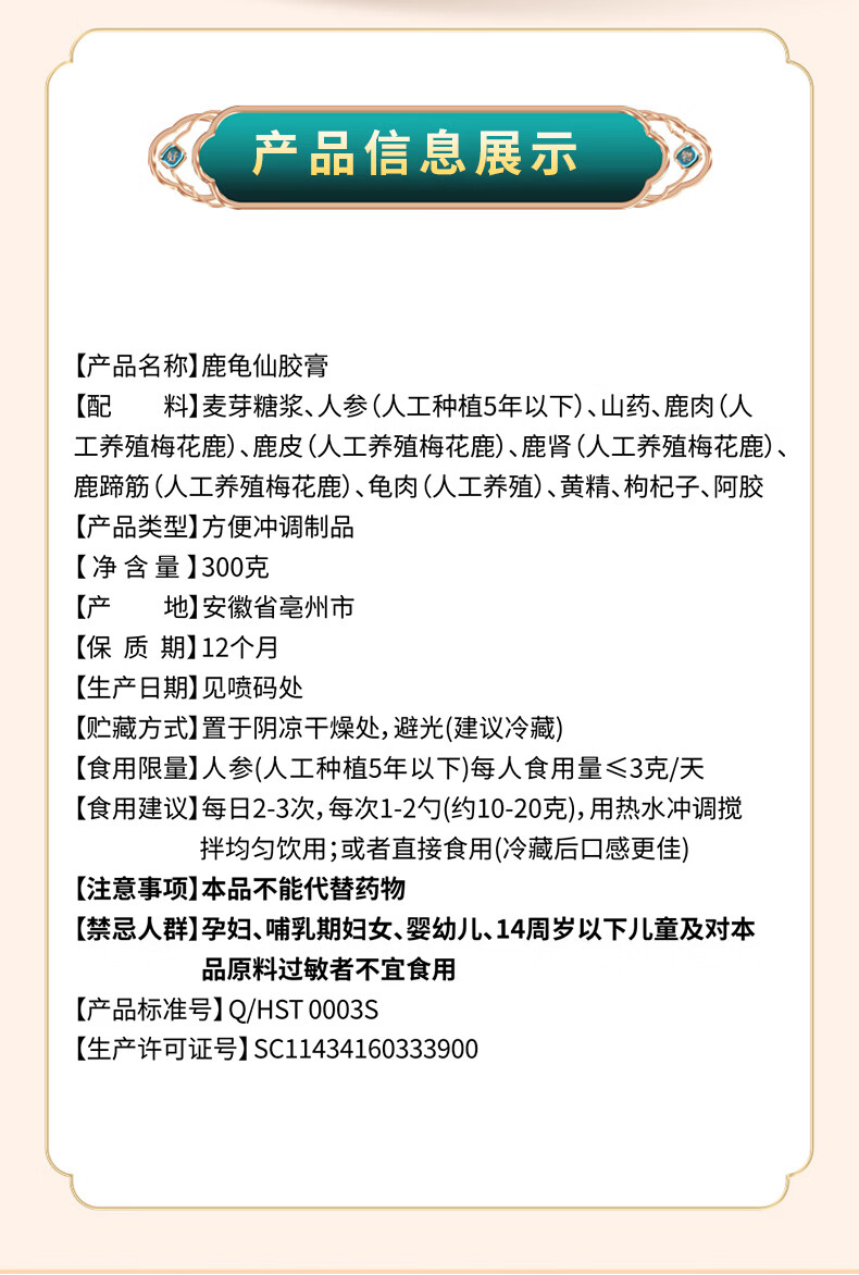 南京同仁堂鹿龟仙胶膏 300g*3罐
