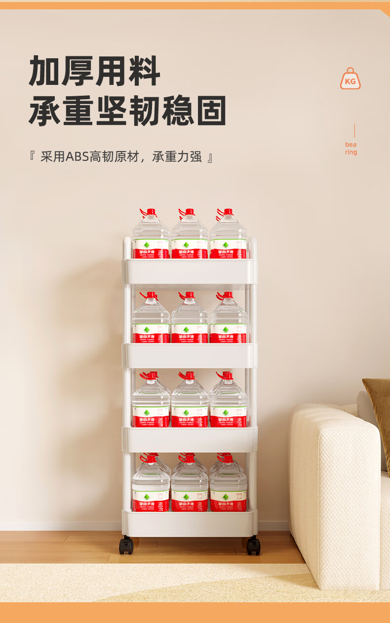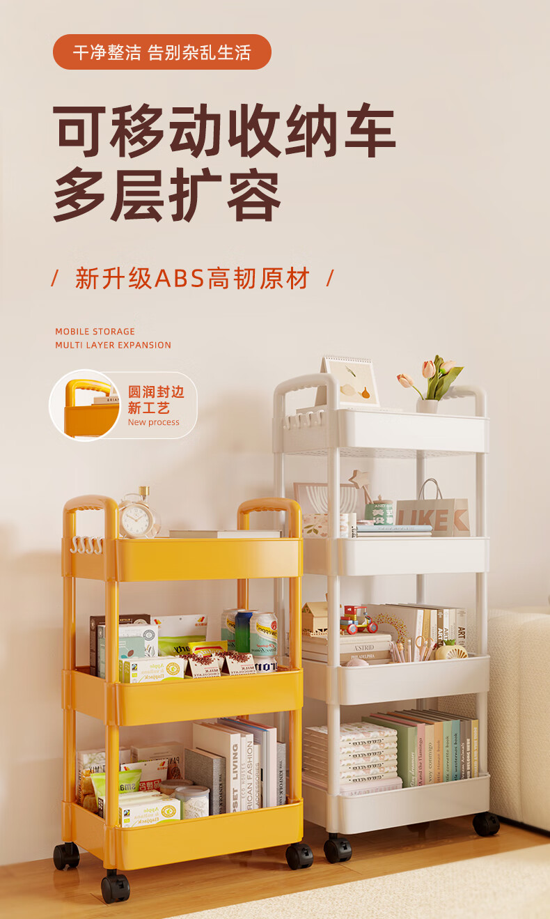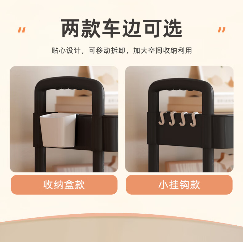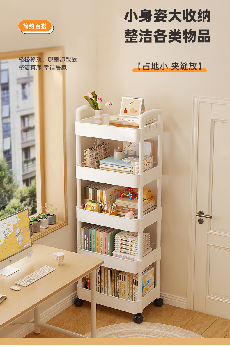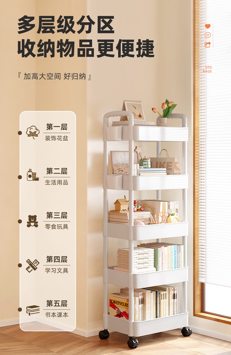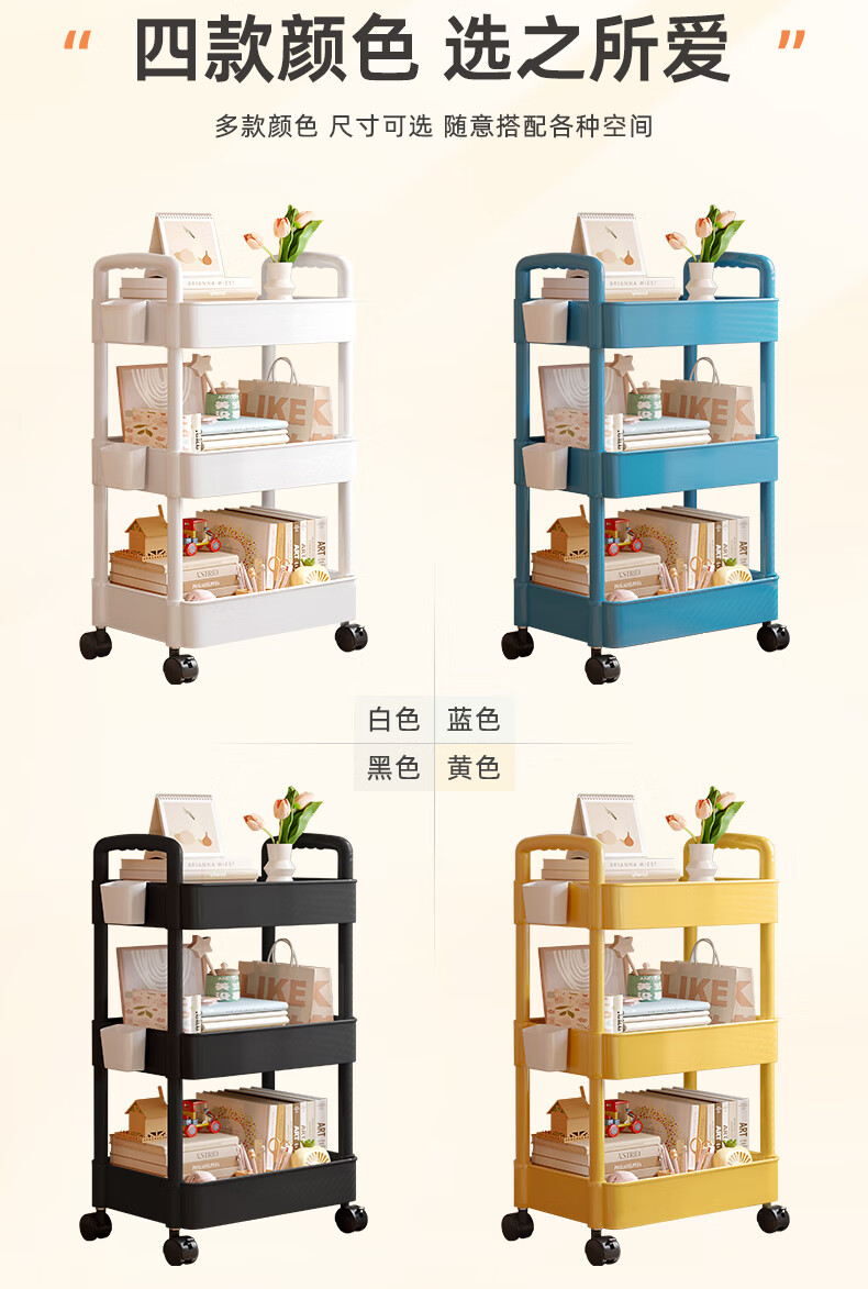 胖东来同款小推车置物架落地多层卧室厨房零食移动浴室卫生间收纳 推荐【四层】黑色|+挂钩*4+滑轮|升级加厚环保材 36x23cm x 5层