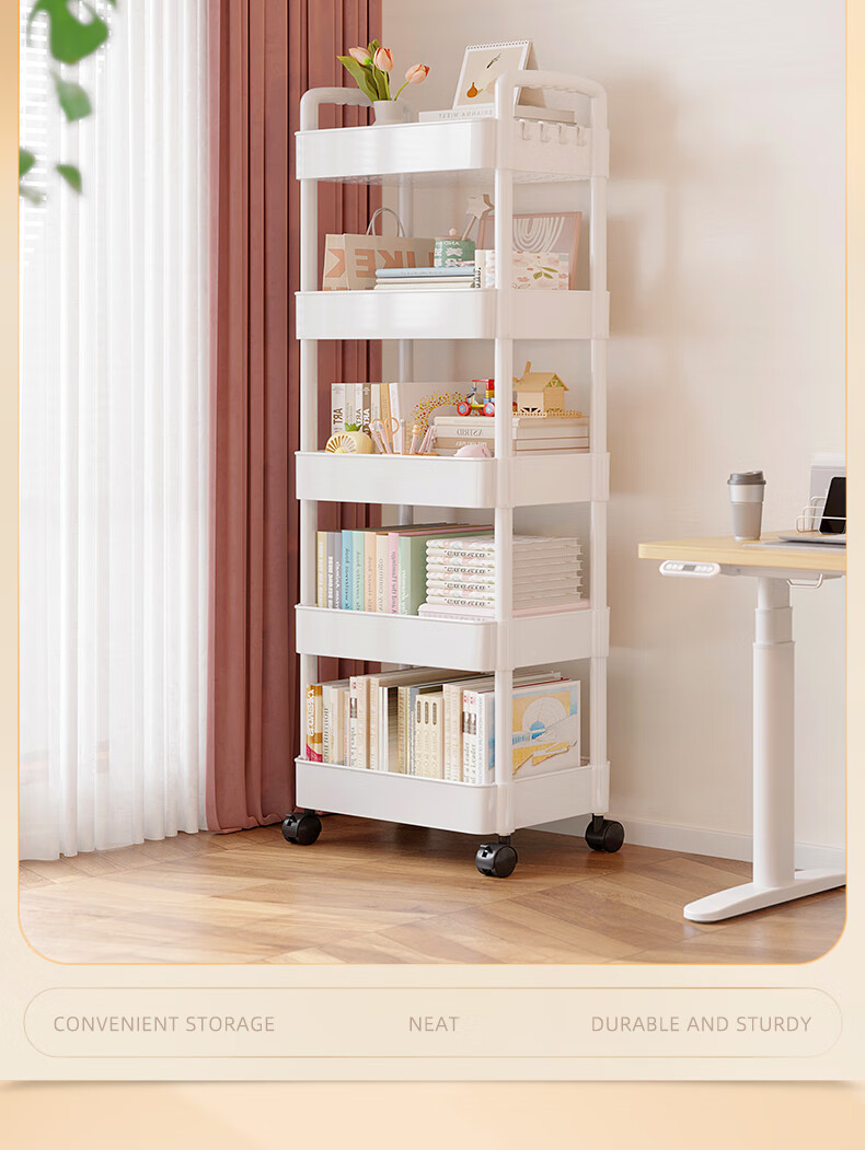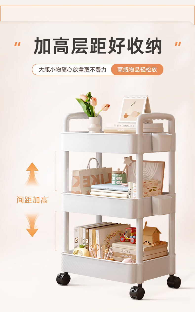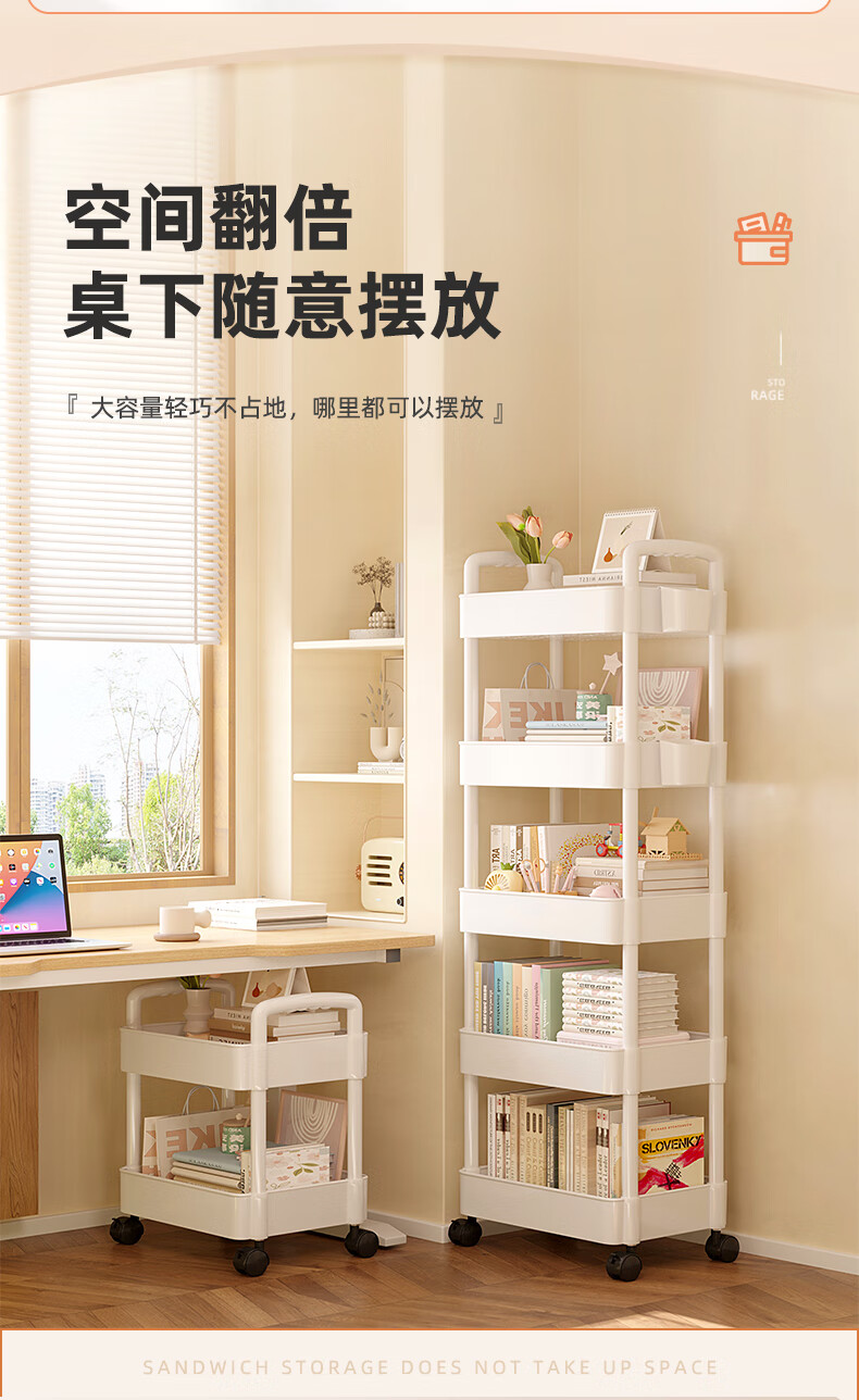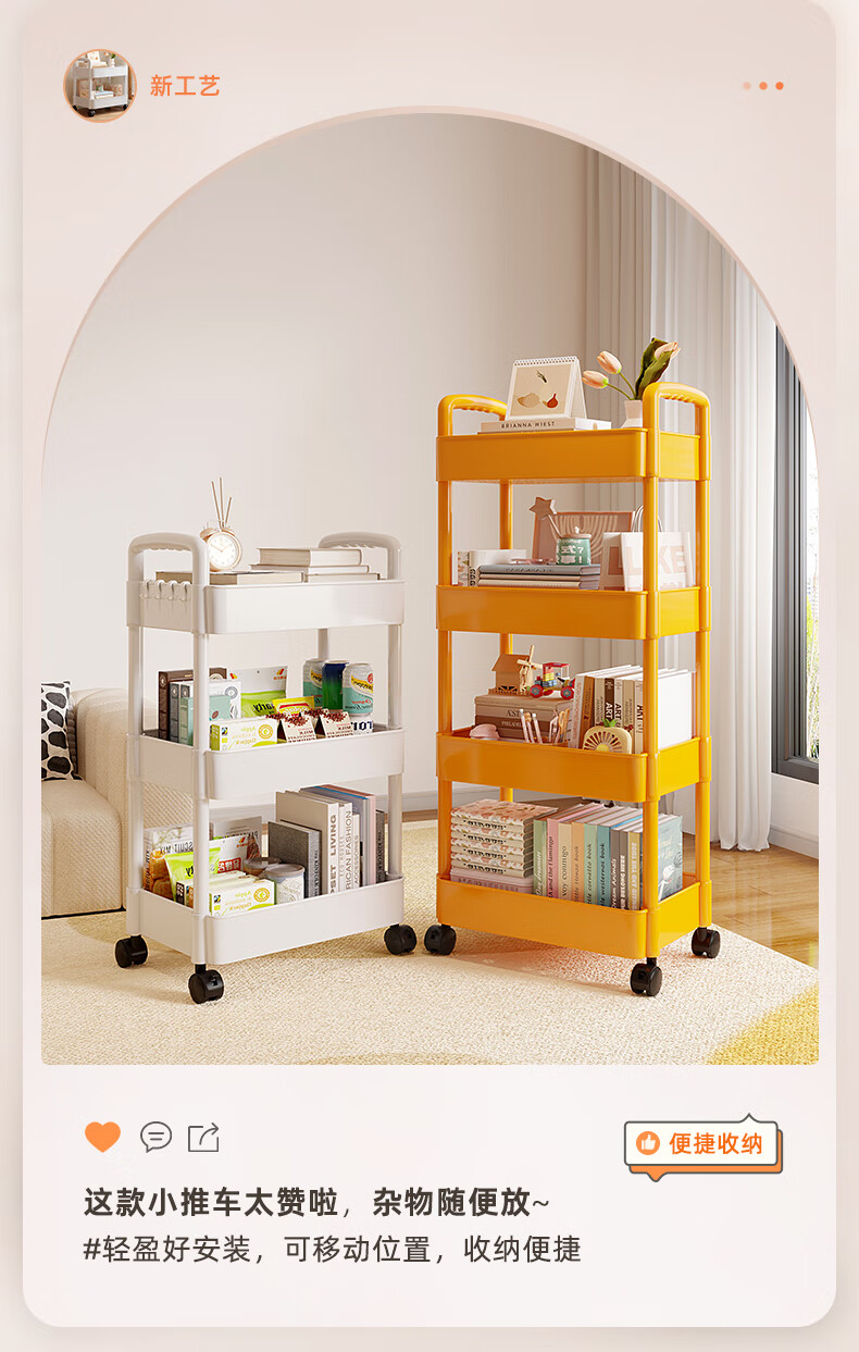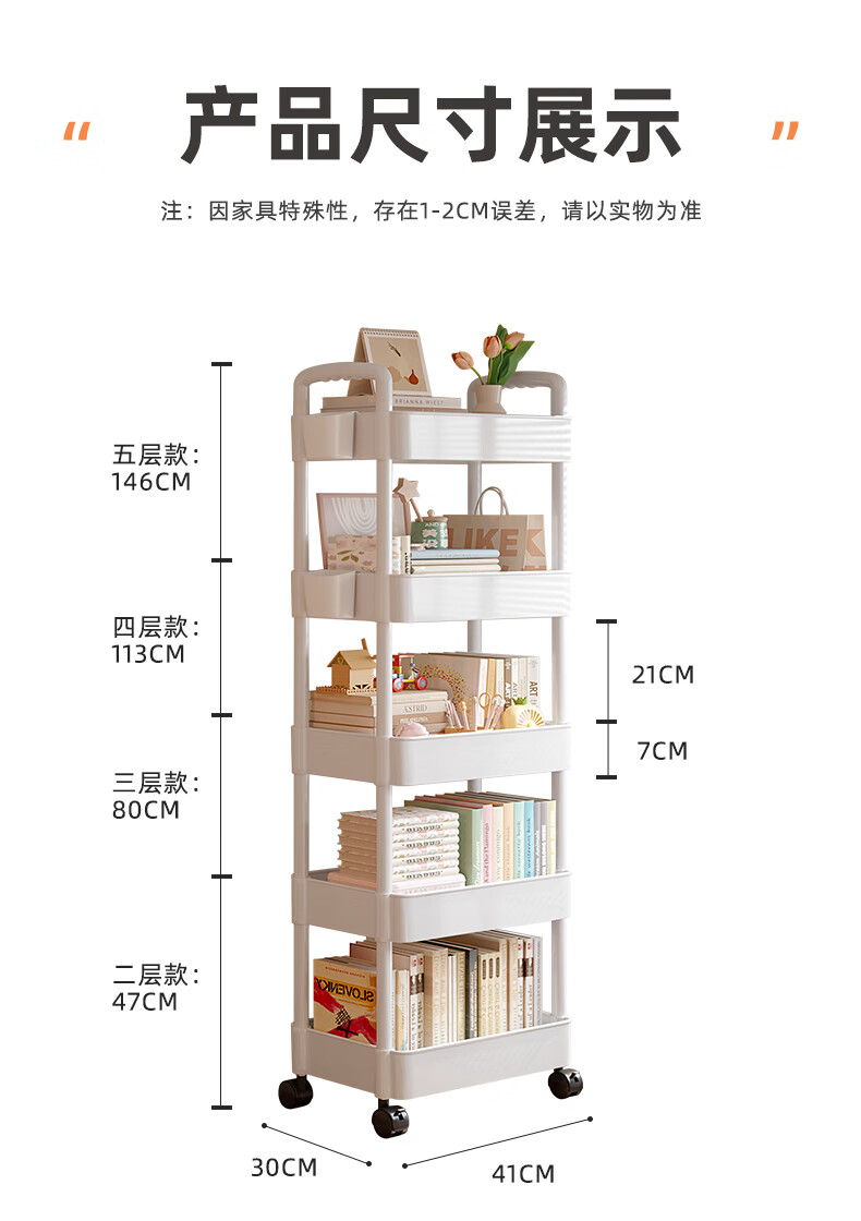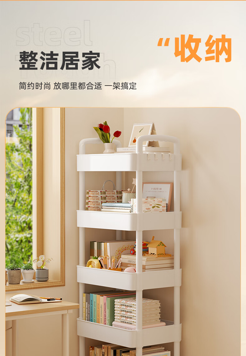 胖东来同款小推车置物架落地多层卧室厨房零食移动浴室卫生间收纳 推荐【四层】黑色|+挂钩*4+滑轮|升级加厚环保材 36x23cm x 5层