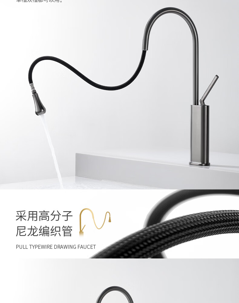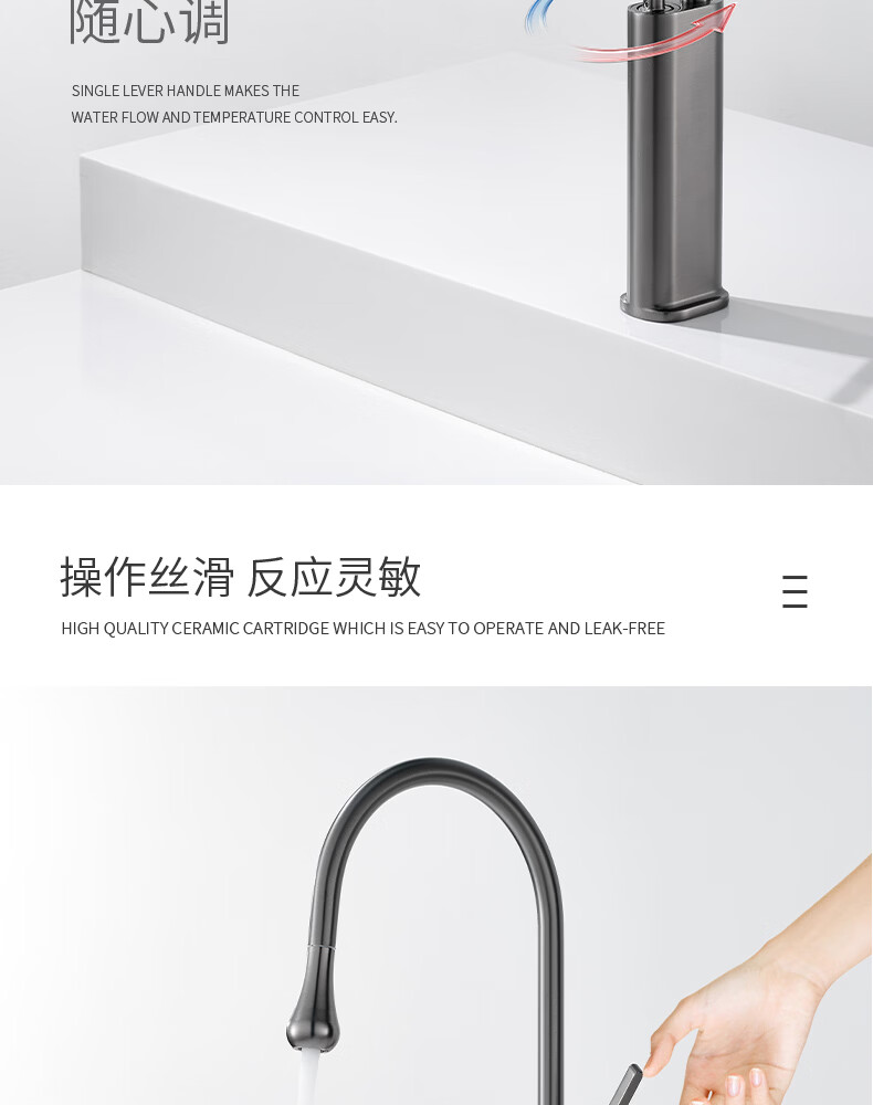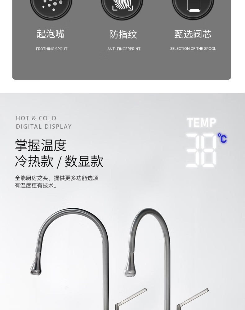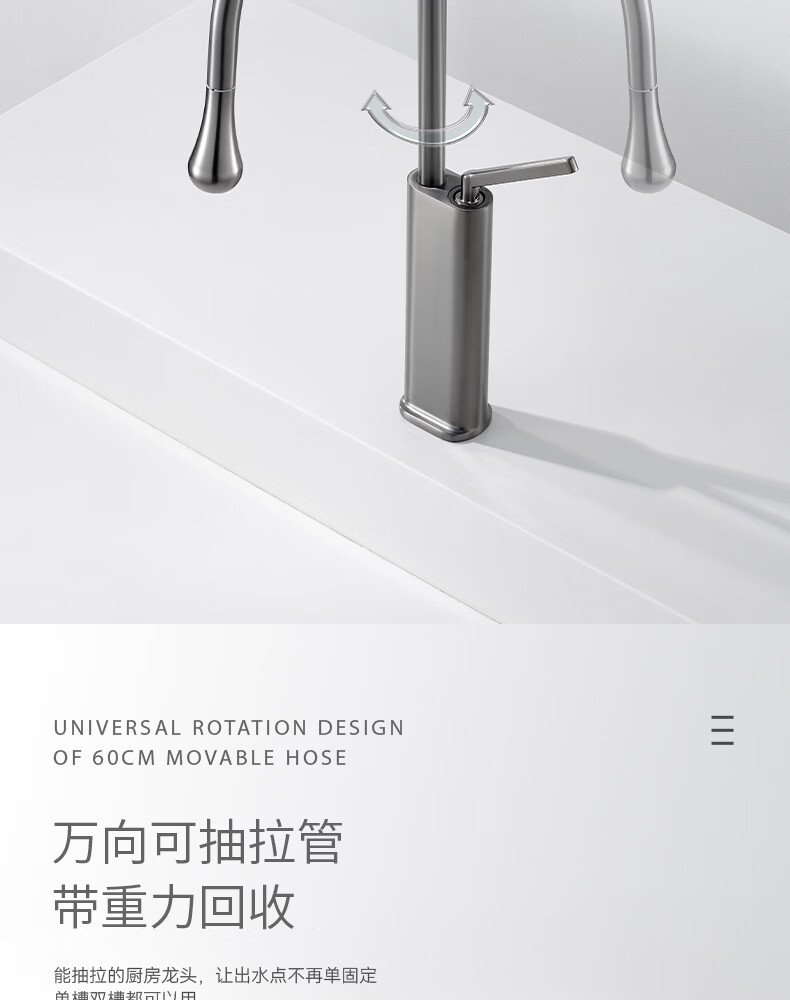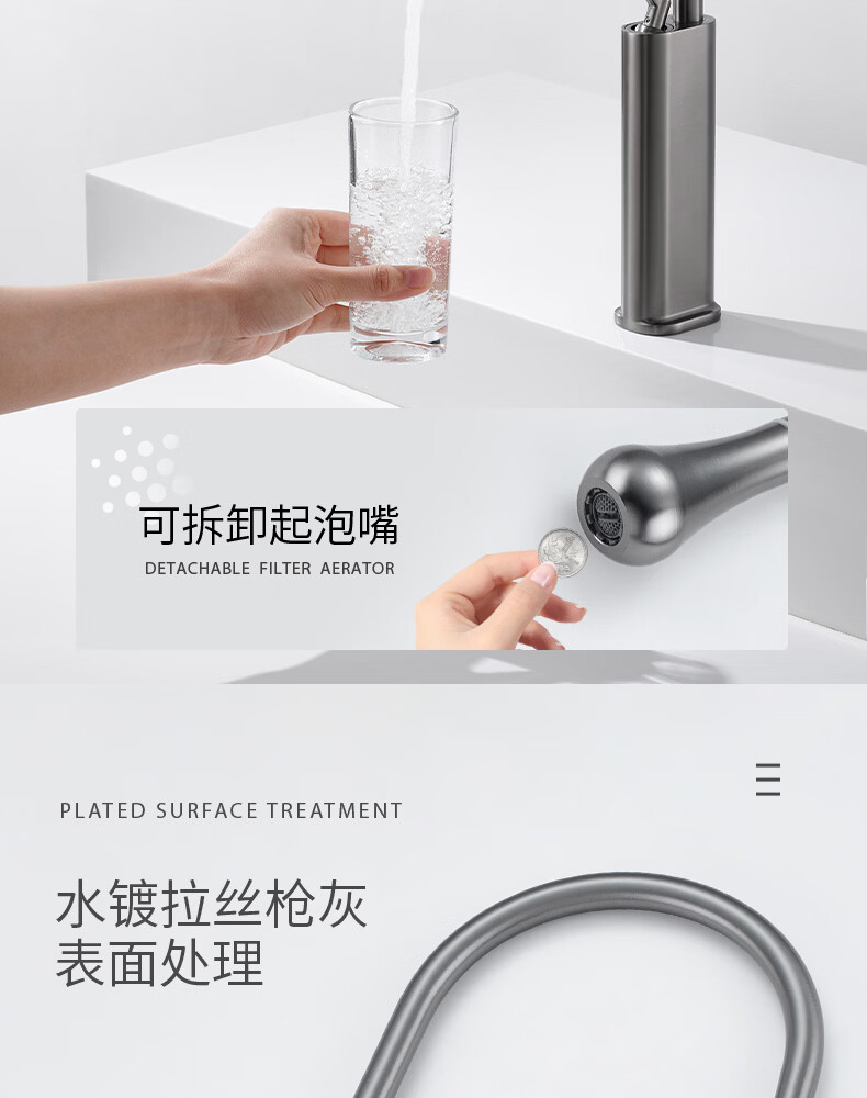 NOEO厨房洗菜盆水龙头增压防溅起泡器出水冷热抽拉可旋转全铜数显龙头 拉丝枪灰色【增压注氧起泡器出水】常规款
