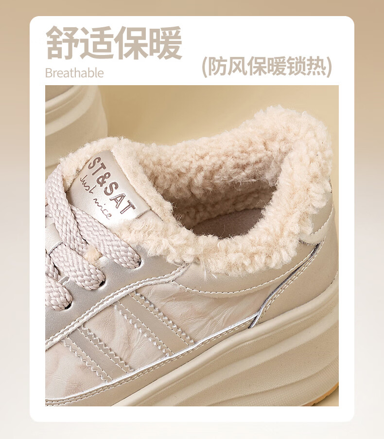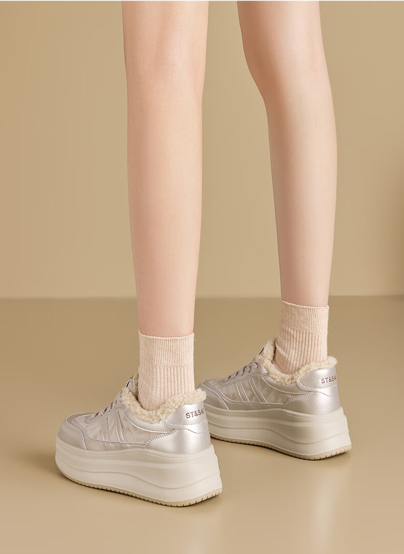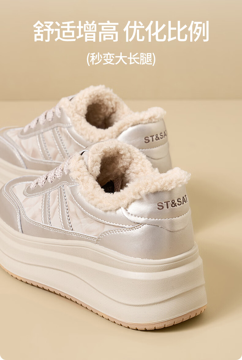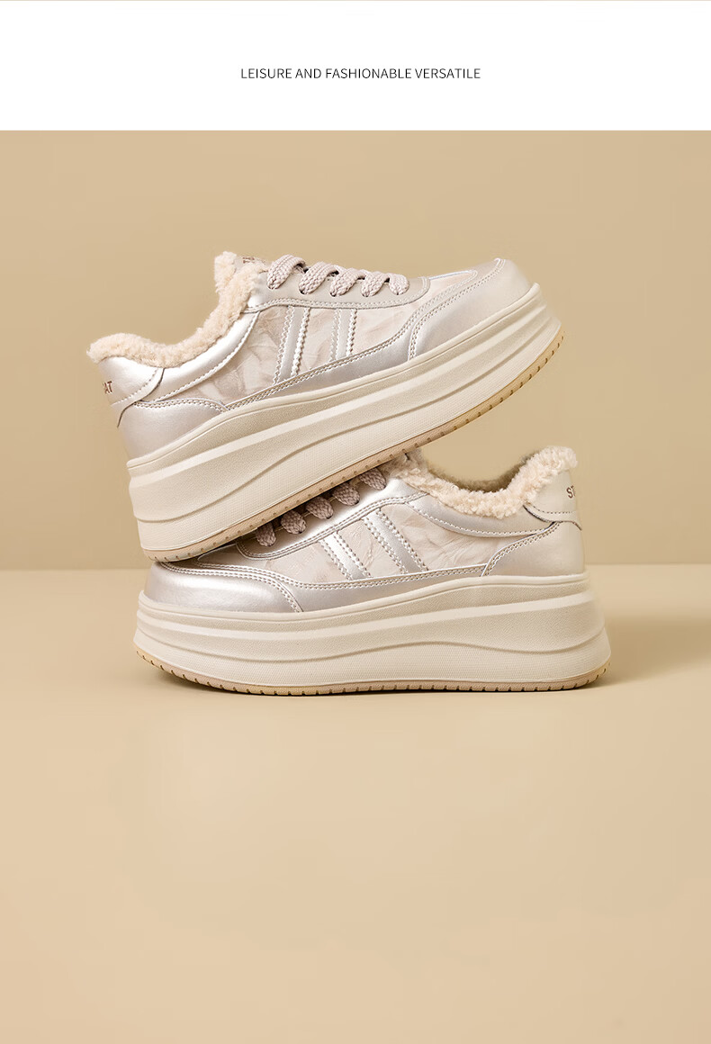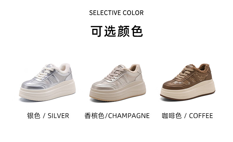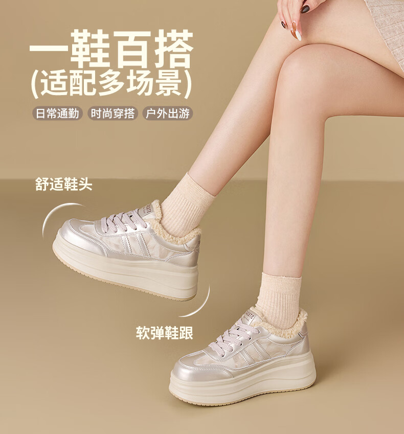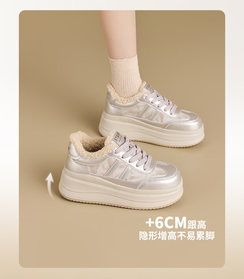 星期六加绒厚底板鞋女鞋2025新款冬季增高小白休闲鞋保暖运动鞋女 香槟色 【加绒保暖】 36