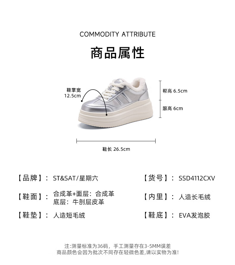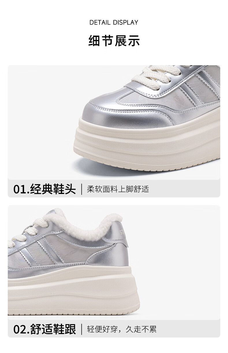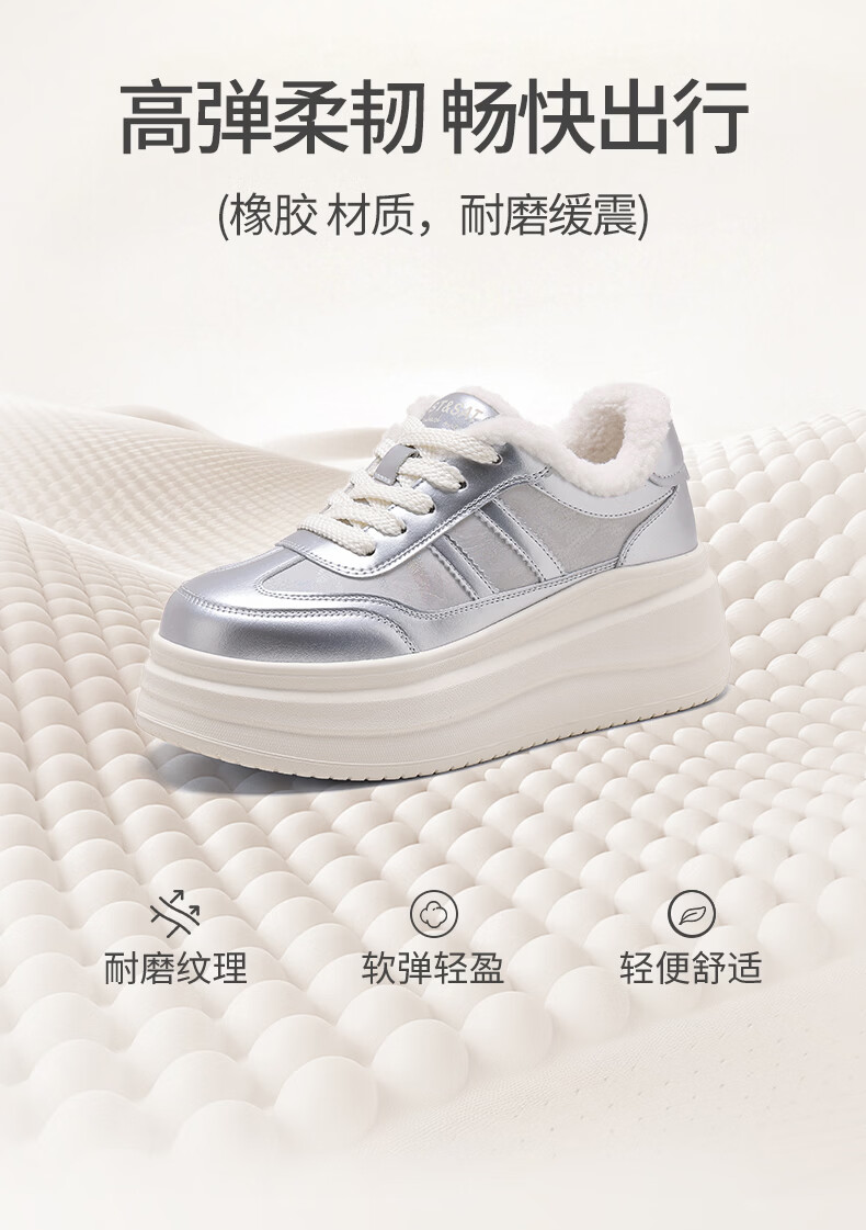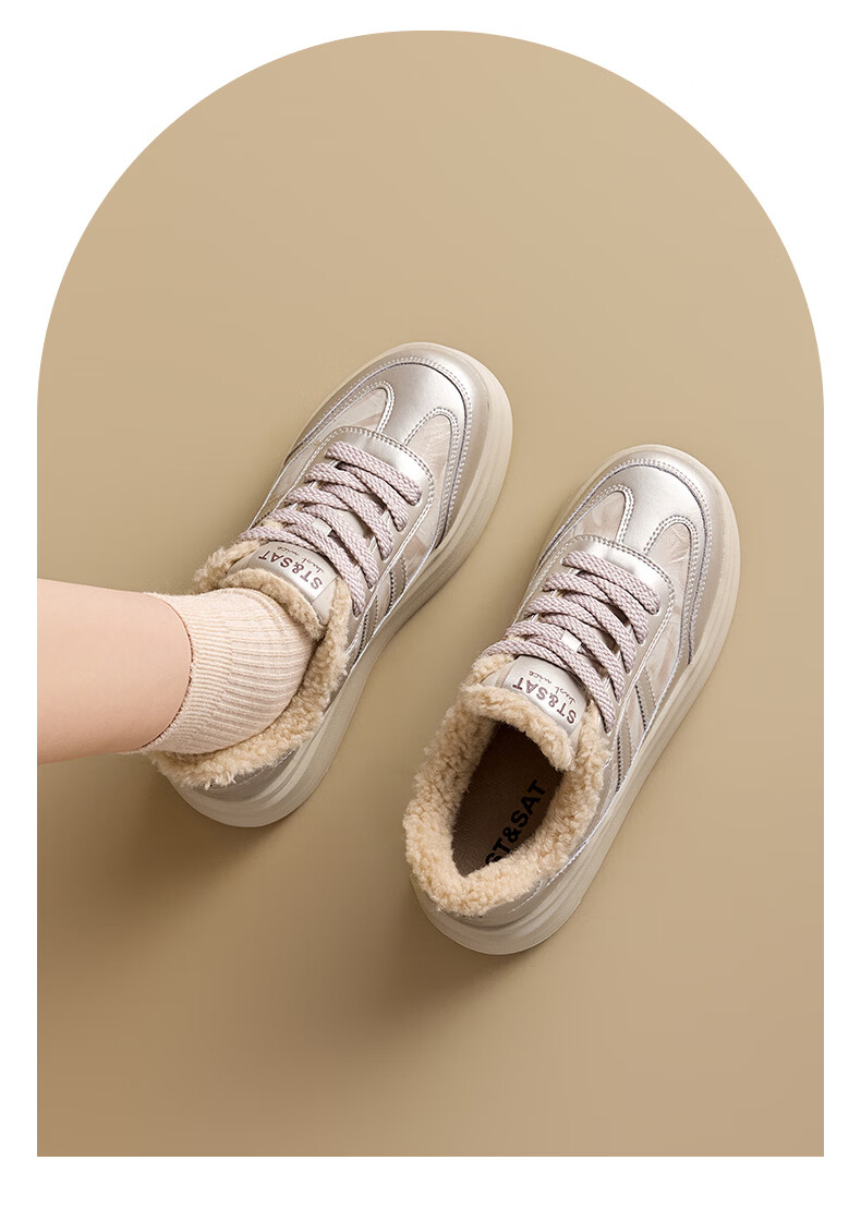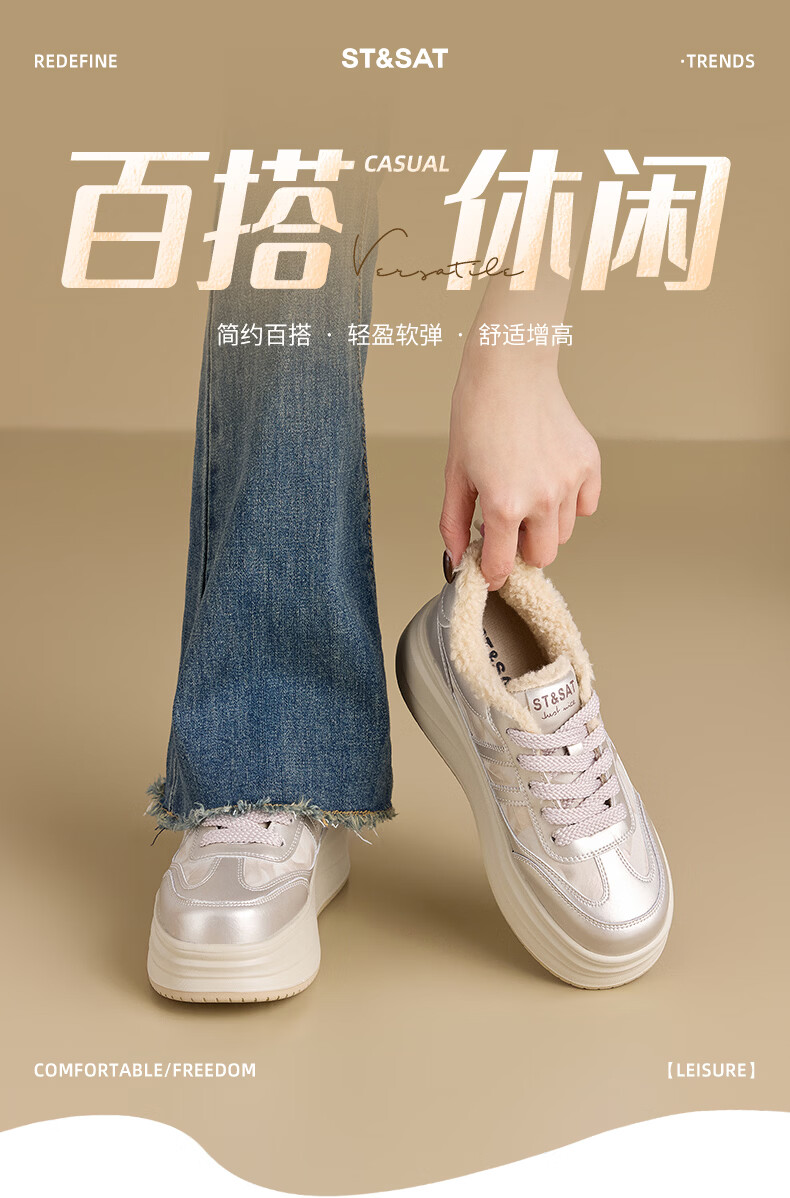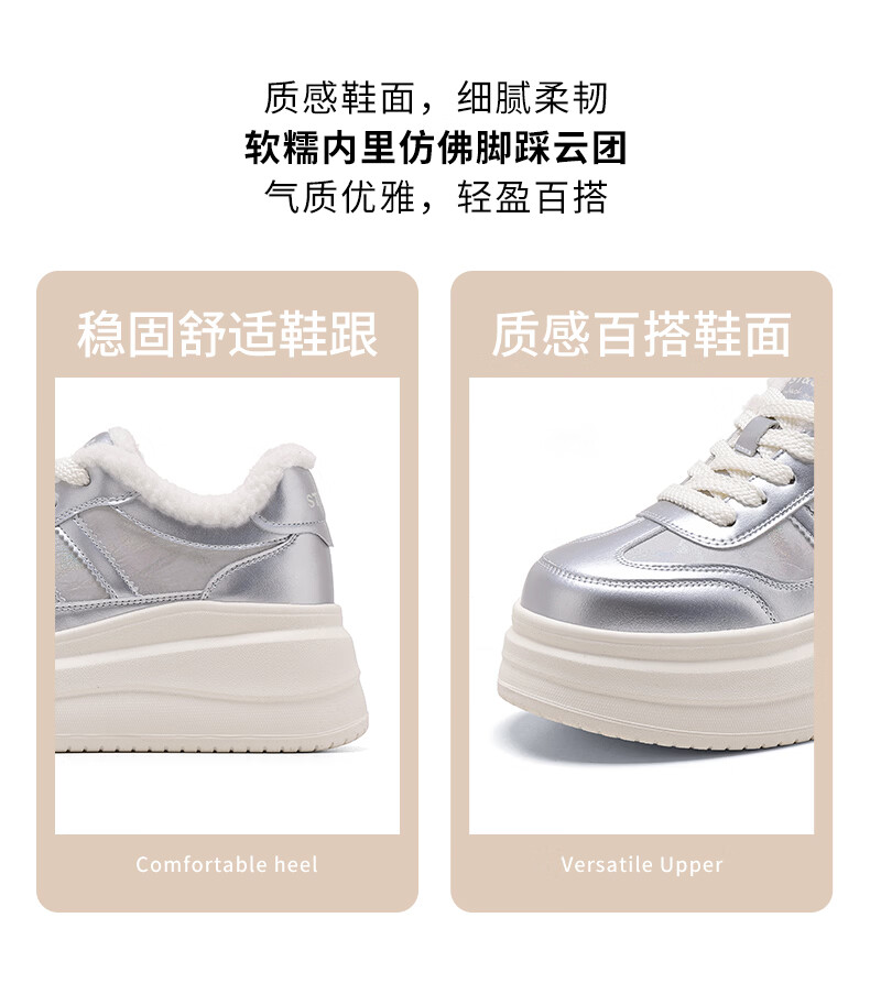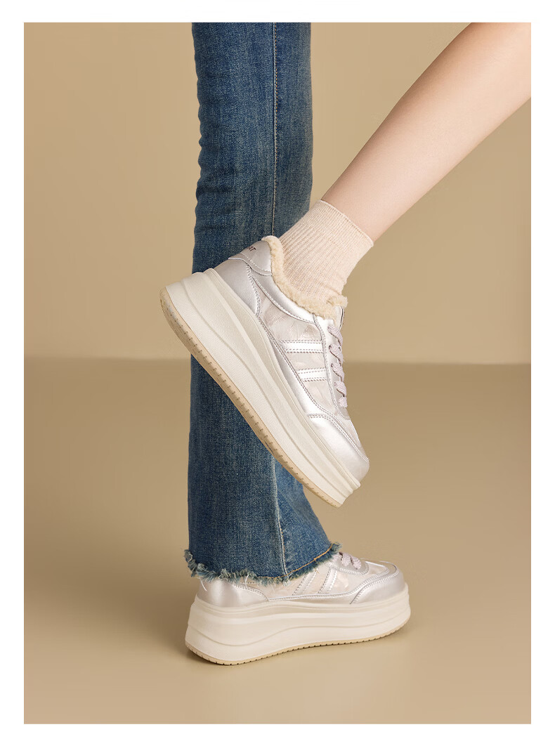 星期六加绒厚底板鞋女鞋2025新款冬季增高小白休闲鞋保暖运动鞋女 香槟色 【加绒保暖】 36