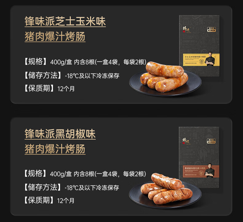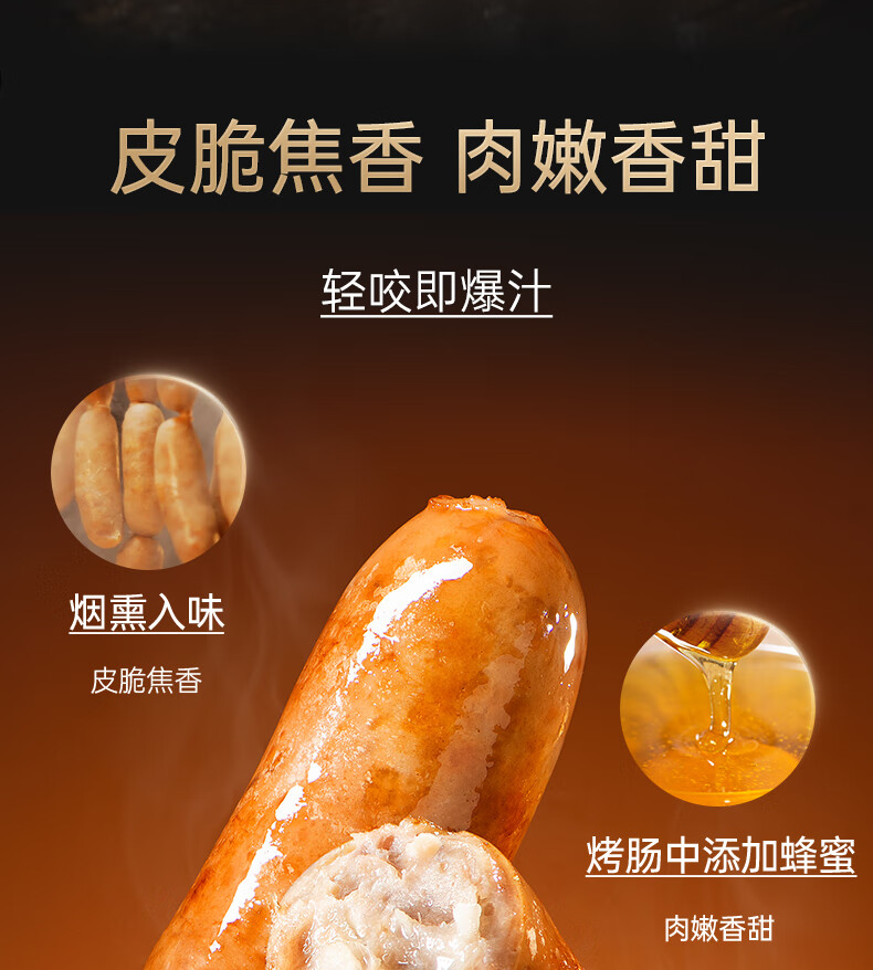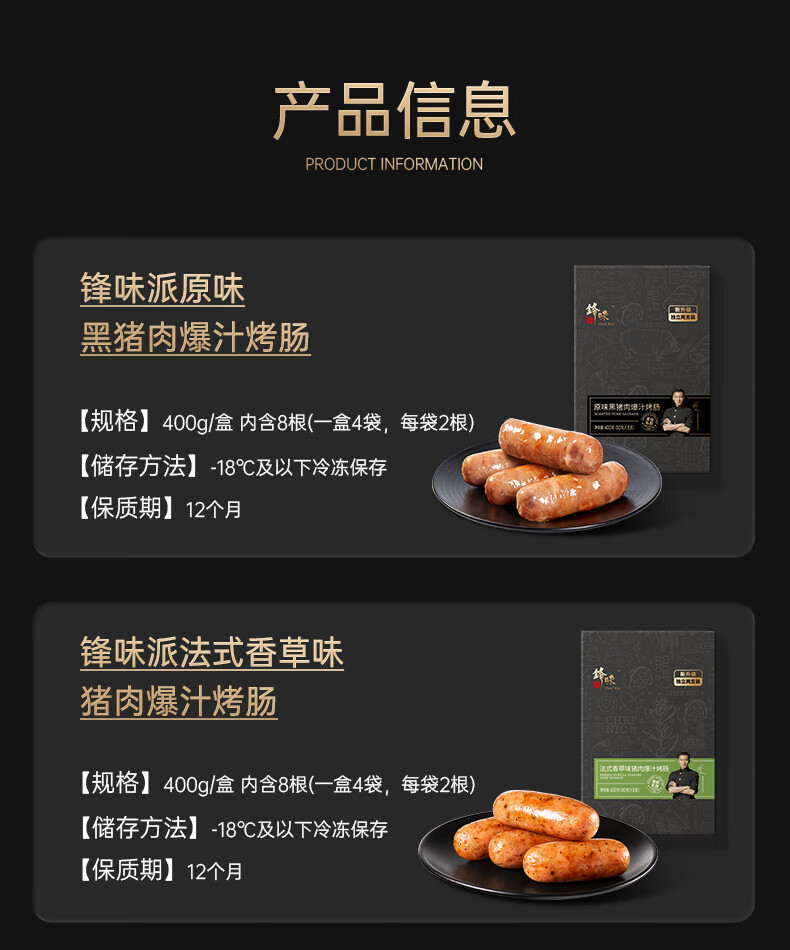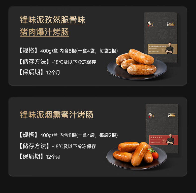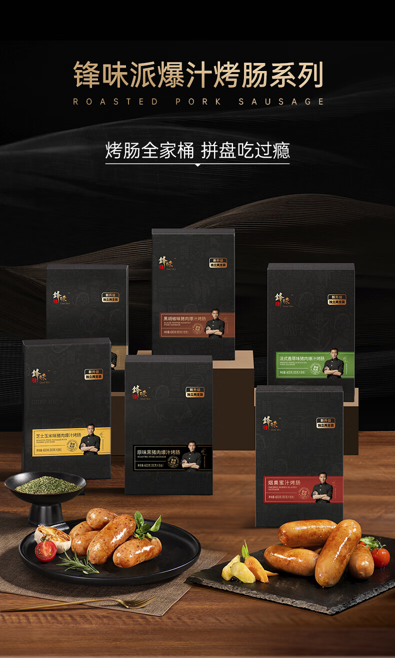 锋味派黑猪肉烤肠原味400g火山石香肠儿童早餐火腿肉肠空炸烧烤食材年货