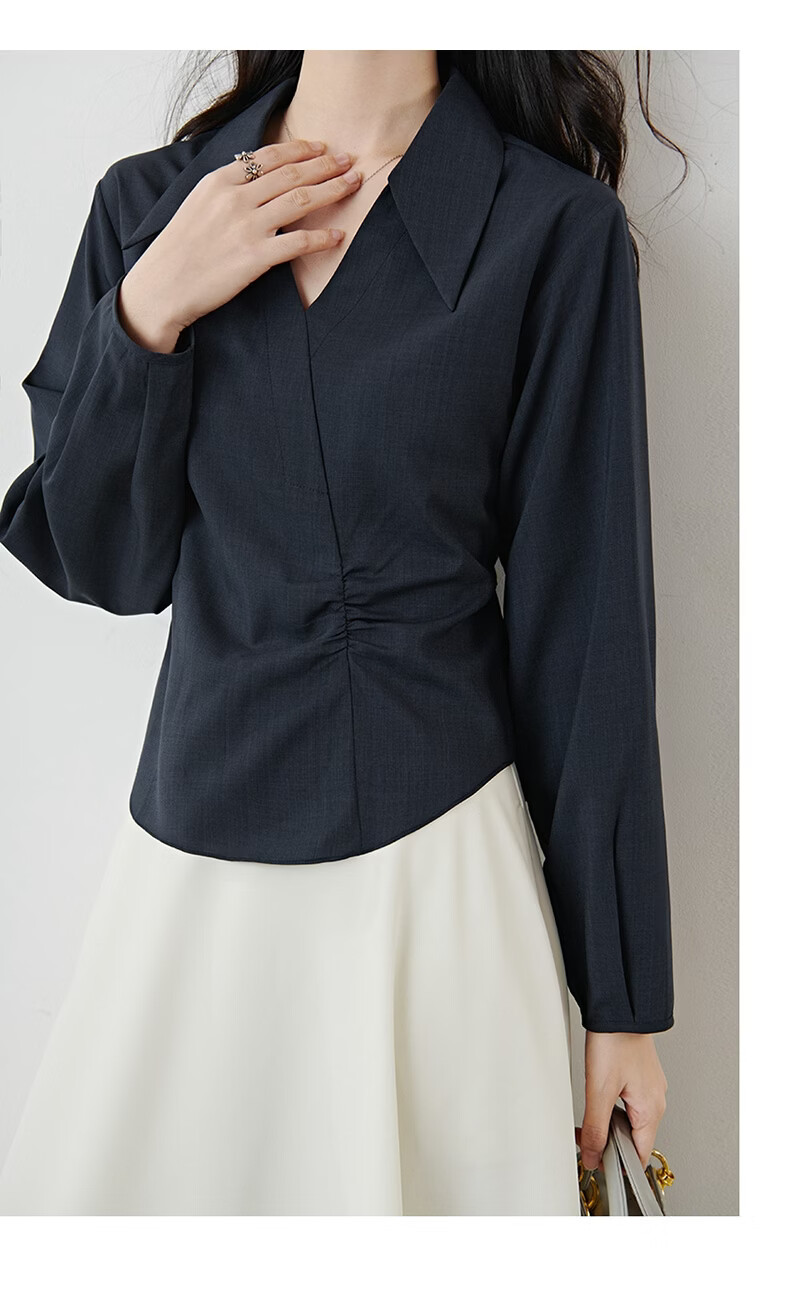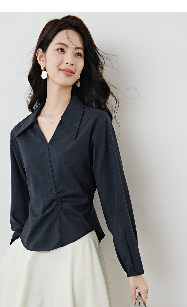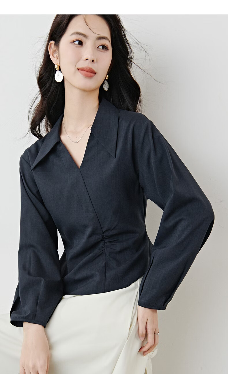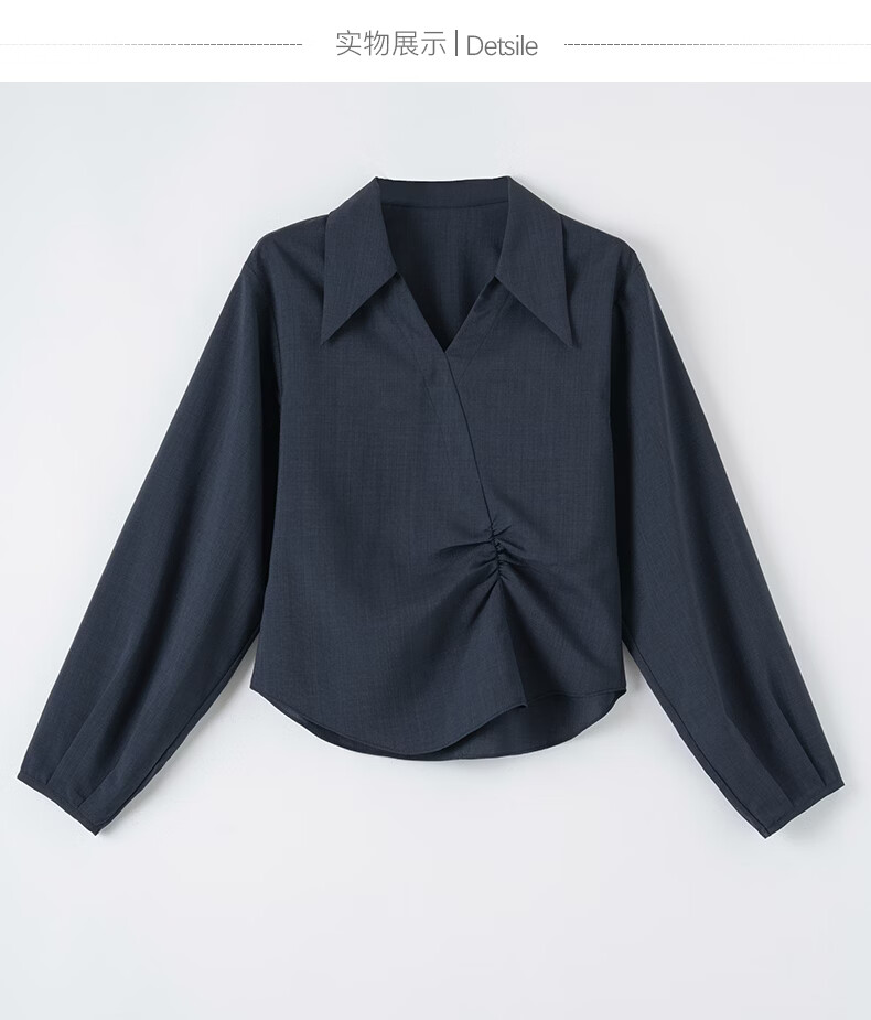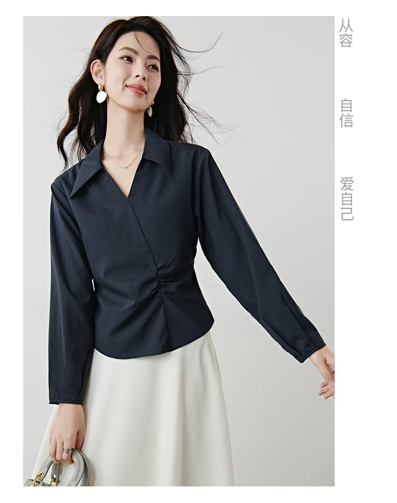 晚白2026年春款气质设计感不对称褶皱上衣系带收腰显瘦行政风衬衫女 深蓝色 S