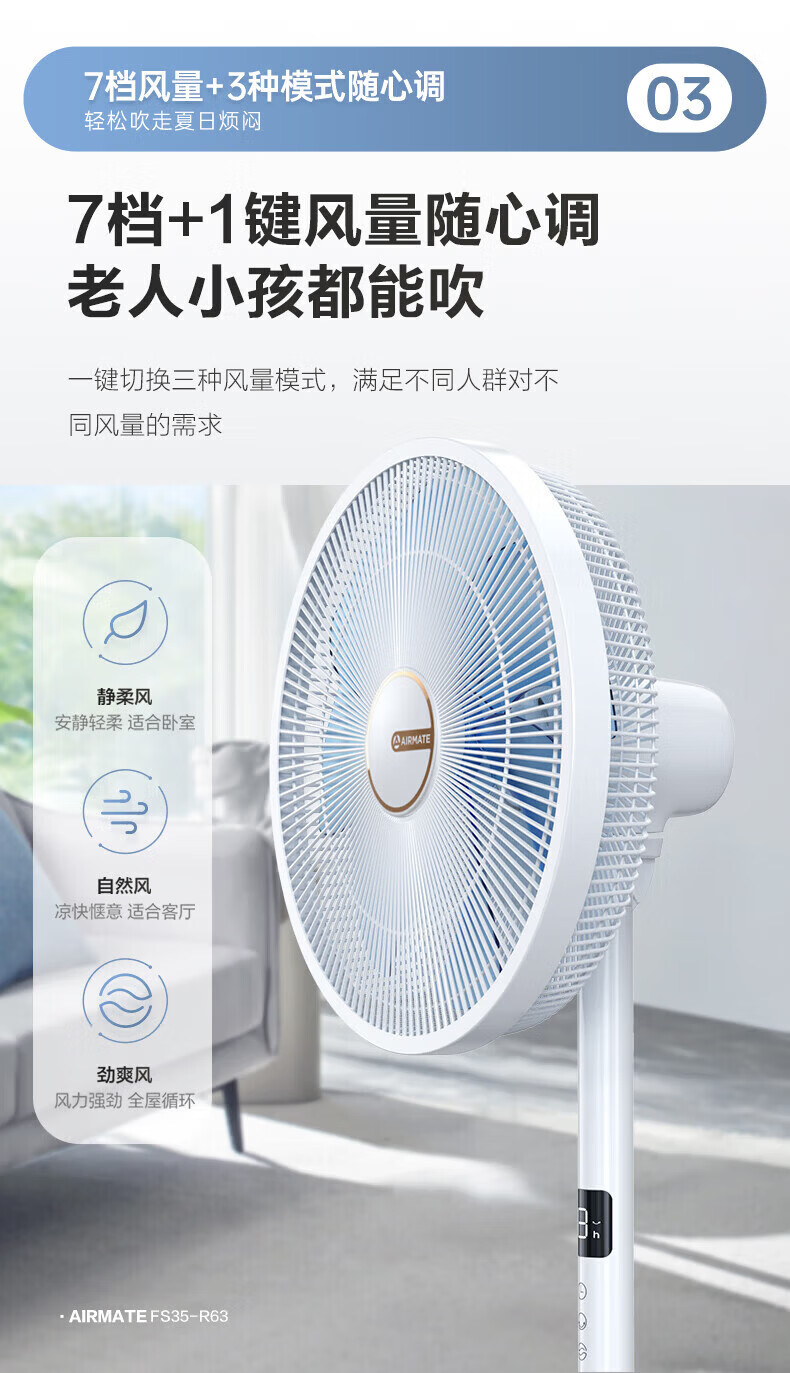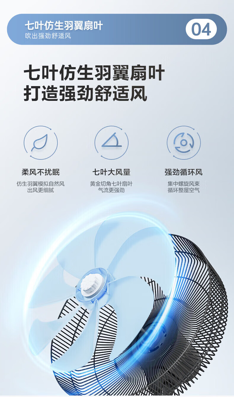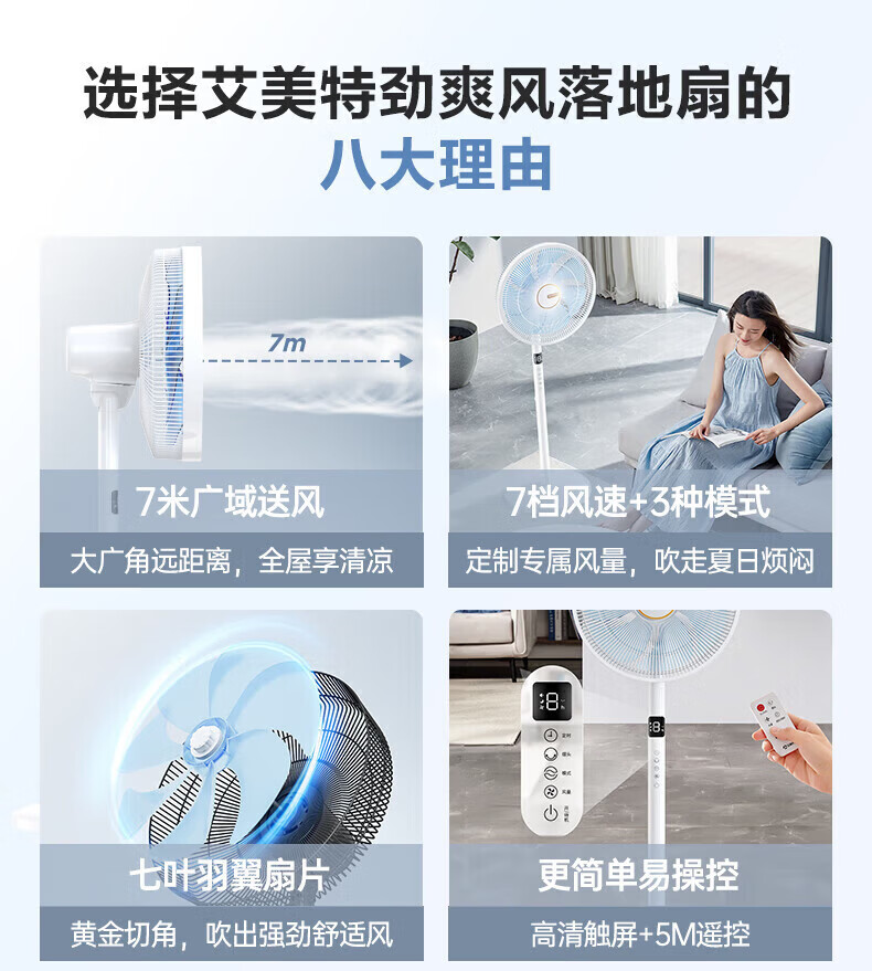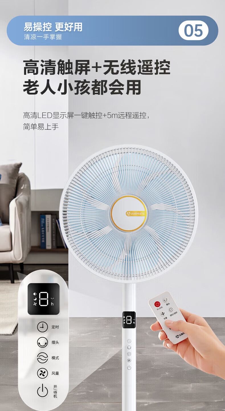 艾美特(AIRMATE)【七叶电风扇】家用落地扇立式轻音居家宿舍卧室办公室电扇节能大风量可触屏遥控定时摇头循环扇 黑色 14寸【可触屏+遥控+9H定时+加重底座】