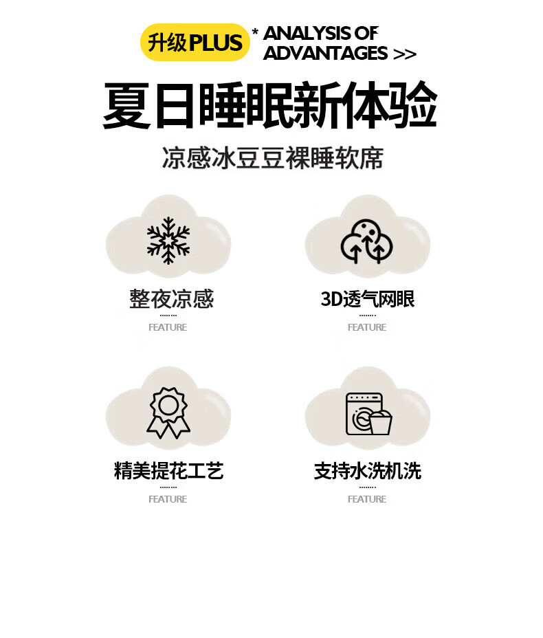 猫人(MiiOW)夏季冰豆豆凉席1.5x2米席子家用单件冰丝凉感席单人宿舍三件套 【床席款】云端-米丨配同款枕套 1.5m(5英尺)床